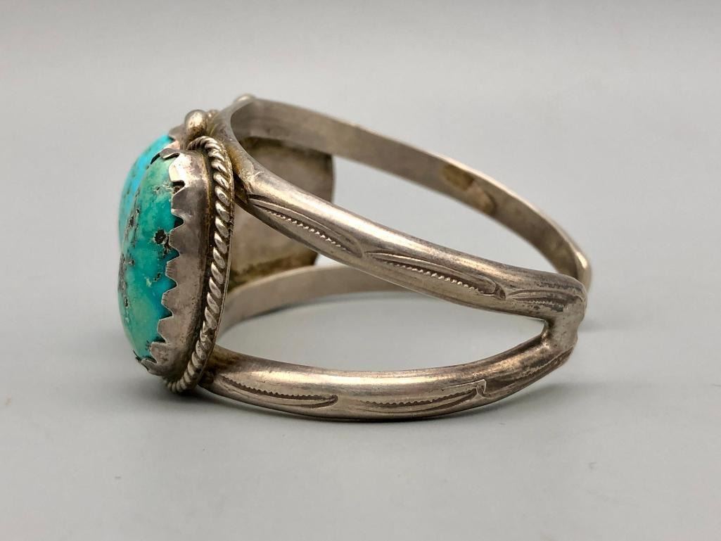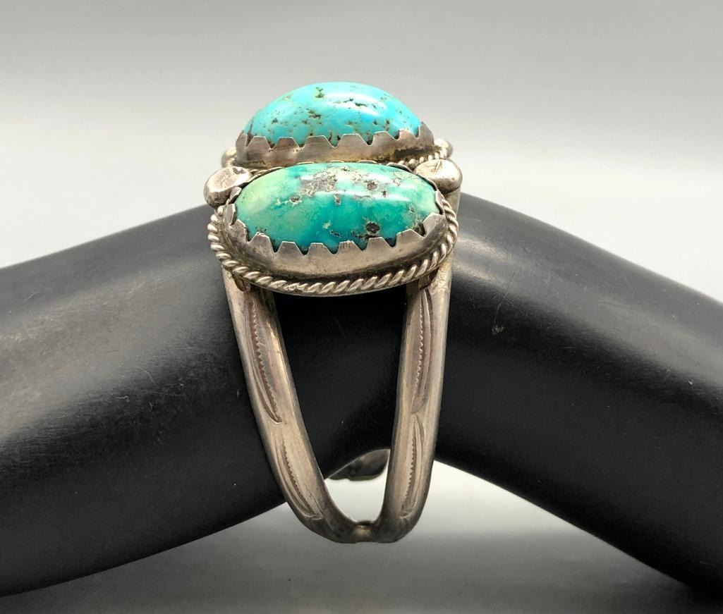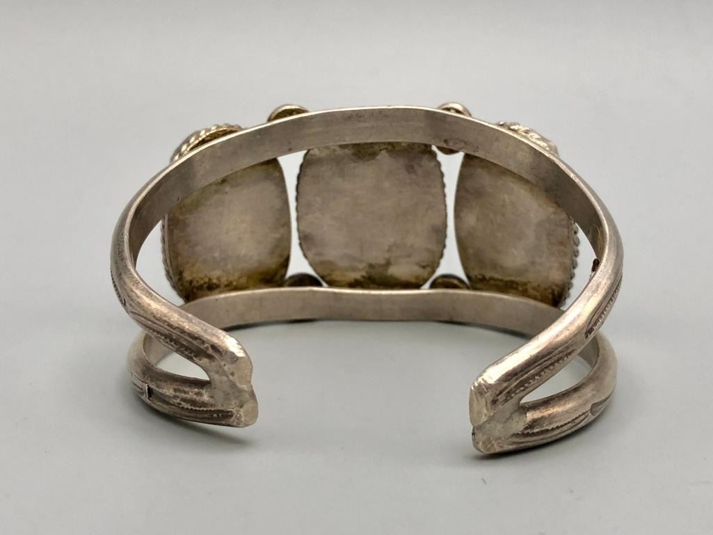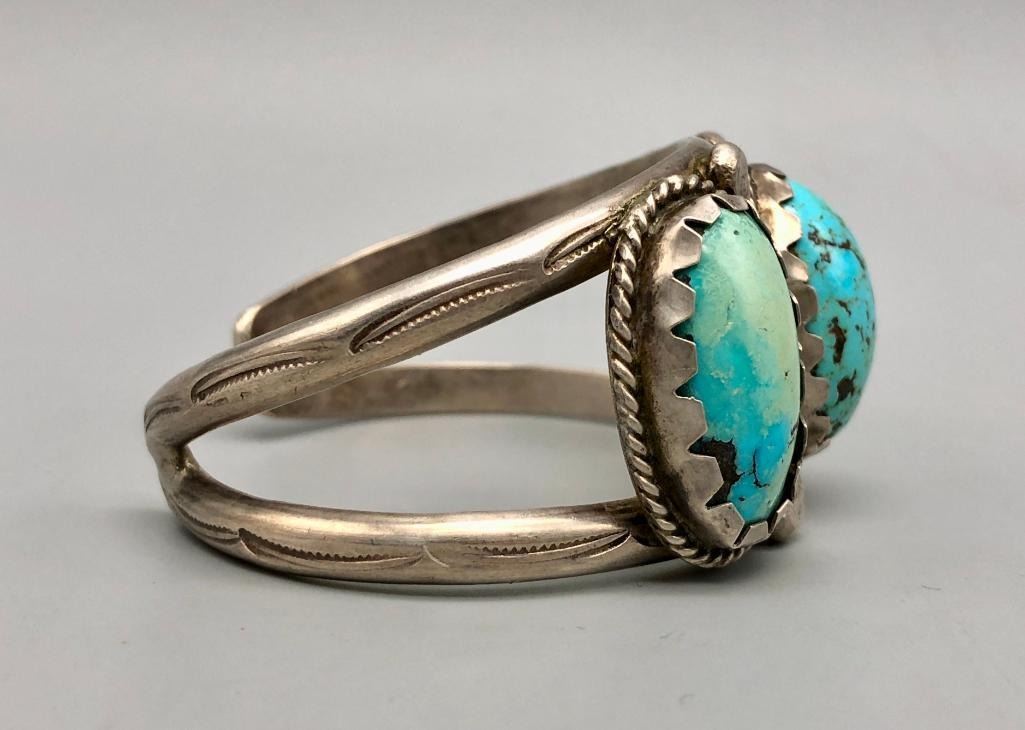 For sale in this lot is a vintage three stone cuff bracelet. This is a fun bracelet set with three brightly hued turquoise cabochons that have nice color variations due to their age. The stones are in handmade bezels and accented with four large silver dots in between each setting. It is on a two wire cuff and is made from sterling silver. MAKER: Unmarked. APPROX AGE: Vintage. SIZE: Inside circumference measures 5-1/2 inches long. Opening is an additional 7/8 inches, fitting a 6-3/8 inch wrist. Width is 1-1/4 inches. Weighs 59.3 grams CONDITION: Good for its age, normal wear expected. Please look closely at the pictures as they are an important part of our description and are hereby incorporated into the description, specifically with regards to condition. SHIPPING: There will be a $5 handling / packaging fee for shipping this lot. The actual cost of postage will be added on top of that. BUY IT NOW: If you would like to buy this item now, without waiting for the auction day to bid on it, we do offer this option (which is available up to 48 hours before the actual auction starts). The “Buy it Now†price is the high estimate of this lot (plus applicable fees and the Buyer's premium is discounted to 10% when using the Buy it Now option). If you would like to exercise this option, you must contact us by email (or phone as long as you talk to someone live). Reference this lot number and your intention to "Buy it Now."