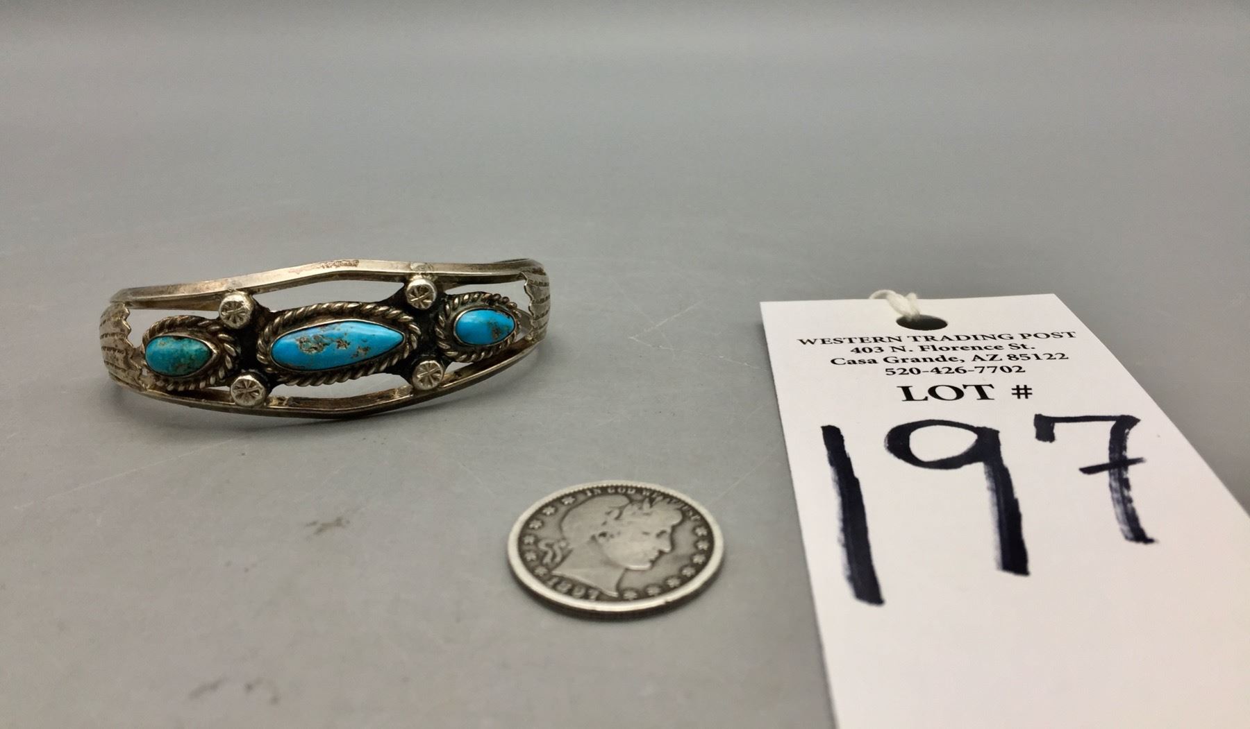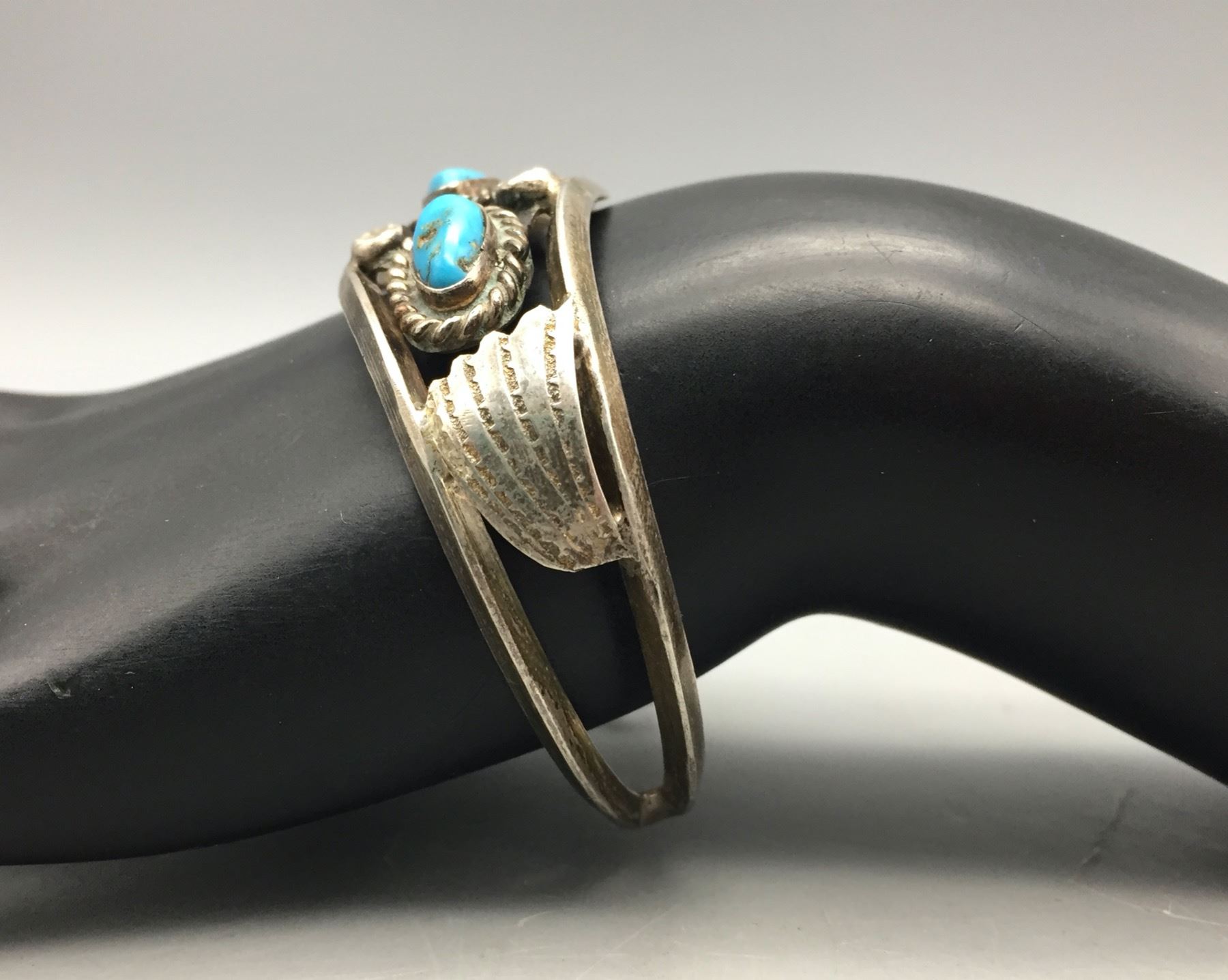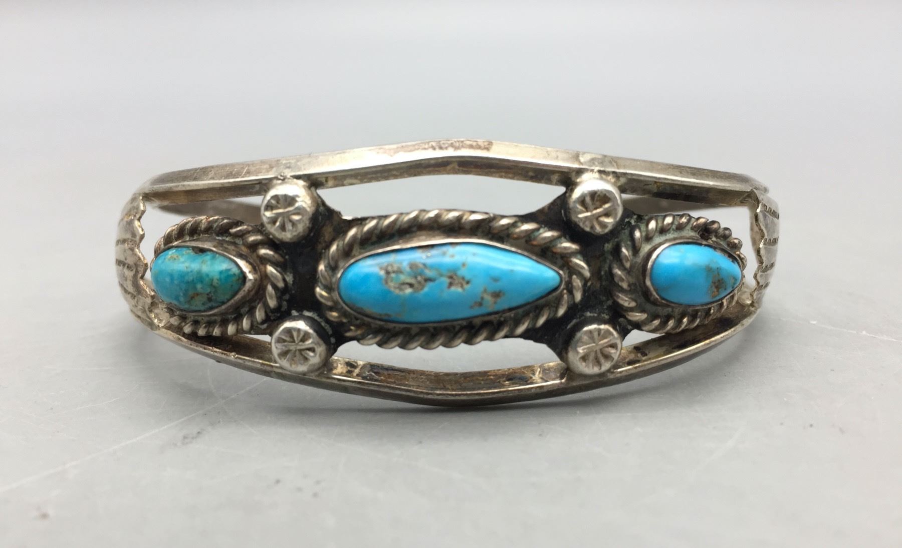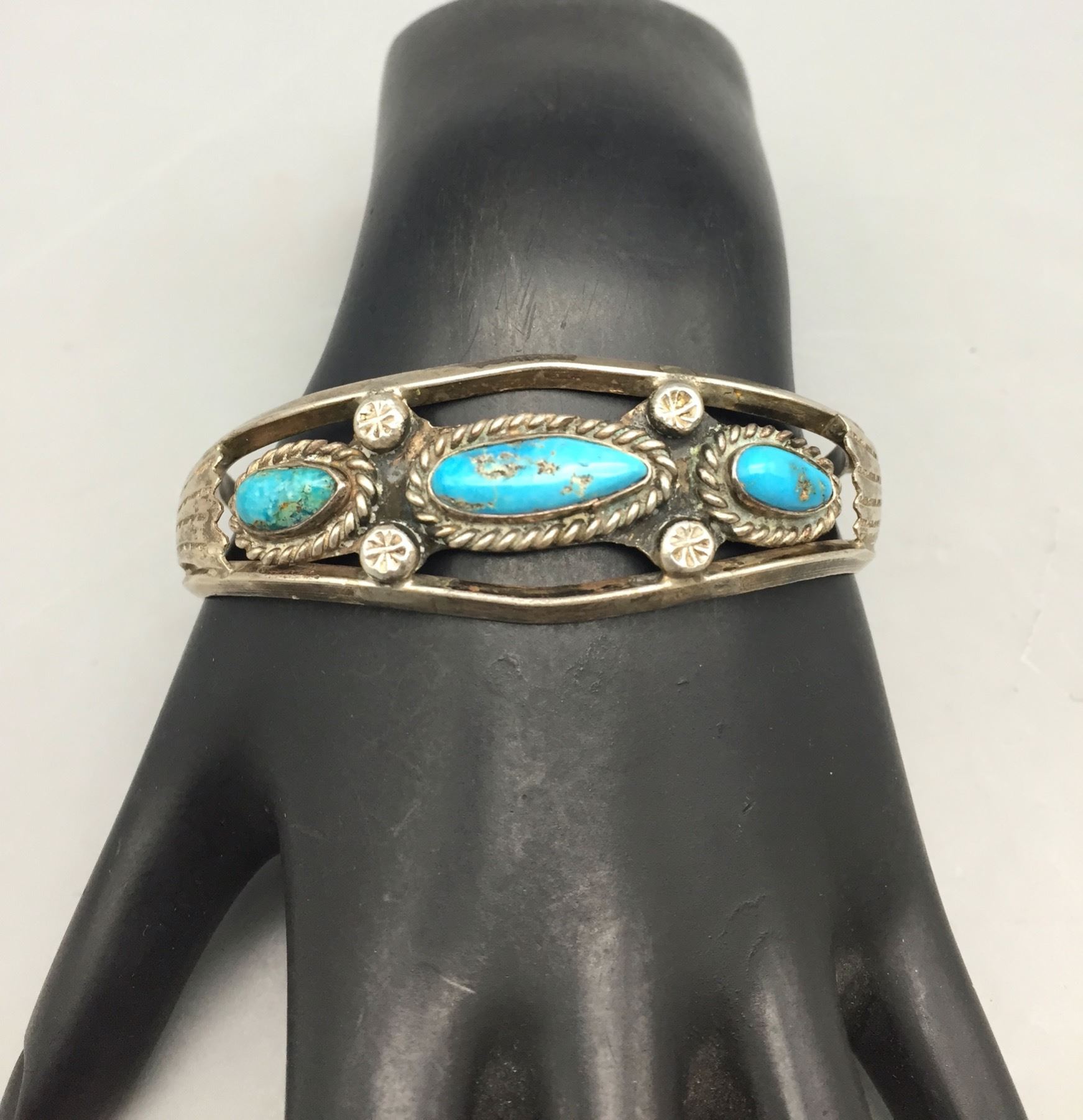 Description: For sale in this lot is this nice vintage three stone turquoise bracelet with silver appliqué designs. Turquoise stones are a nice blue to blue-green and it is a sterling silver piece. Maker: Unknown. Approx. Age: Vintage. Size: Inside circumference 6â€. Opening is additional 1-1/8â€, fitting a 7-1/8†wrist. Width is 1â€. Weighs 26.6 grams. Condition: Good for its age, normal wear expected. Please look closely at the pictures - they are an important part of our description. Shipping: There will be a $5 handling / packaging fee for shipping this lot. The actual cost of postage will be added on top of that.