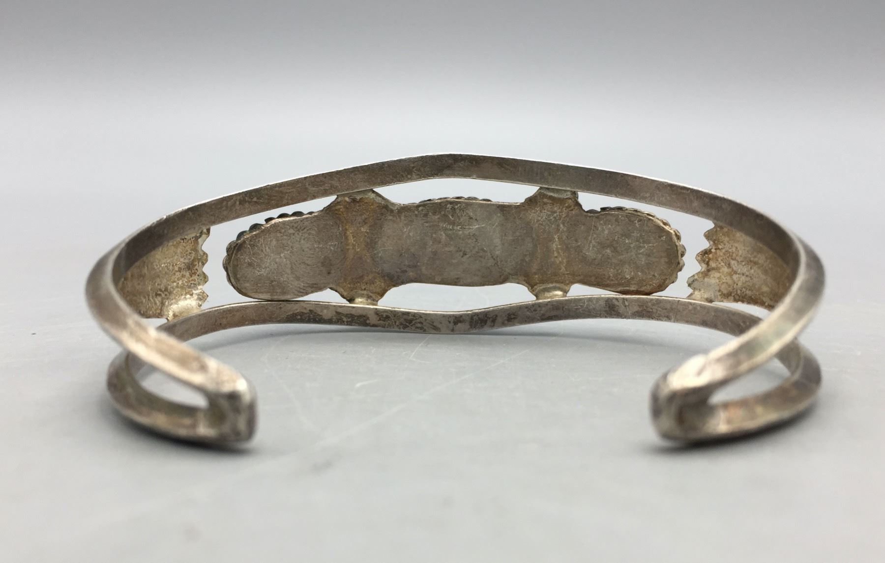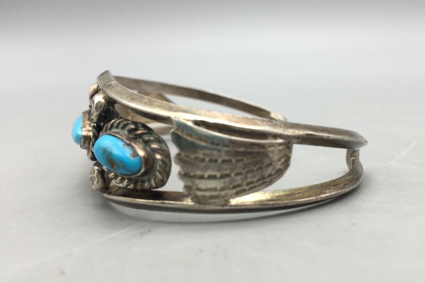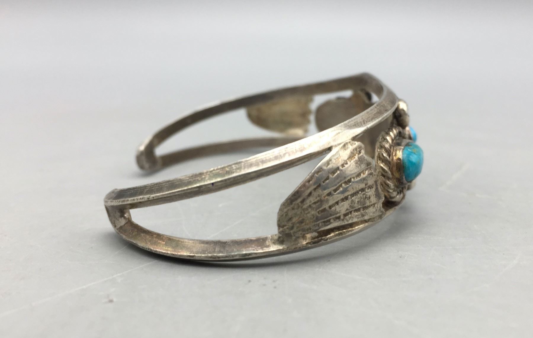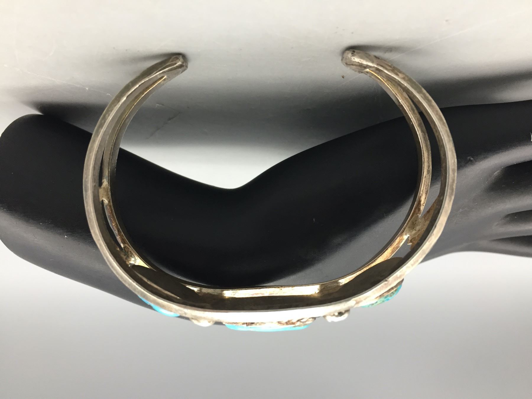 Description: For sale in this lot is this nice vintage three stone turquoise bracelet with silver appliqué designs. Turquoise stones are a nice blue to blue-green and it is a sterling silver piece. Maker: Unknown. Approx. Age: Vintage. Size: Inside circumference 6â€. Opening is additional 1-1/8â€, fitting a 7-1/8†wrist. Width is 1â€. Weighs 26.6 grams. Condition: Good for its age, normal wear expected. Please look closely at the pictures - they are an important part of our description. Shipping: There will be a $5 handling / packaging fee for shipping this lot. The actual cost of postage will be added on top of that.