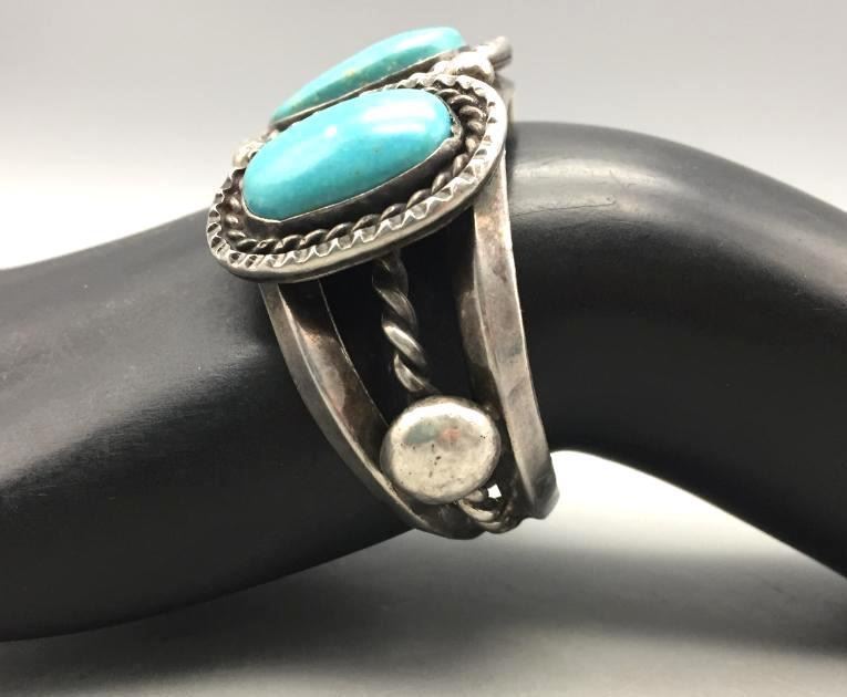 For your consideration we offer this nice vintage bracelet featuring three turquoise stones and sterling silver accents. Maker: Hallmarked PV. Approx. Age: 1970s. Size: Measures 5" with a 1" opening, fits a 1-1/8" wrist. Weighs 61.7 grams. Condition: Good for its age, normal wear expected. Please look closely at the pictures - they are an important part of our description. Shipping: There will be a $5 handling, packaging fee for shipping this lot. The actual cost of postage will be added on top of that.
