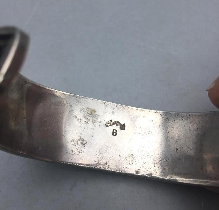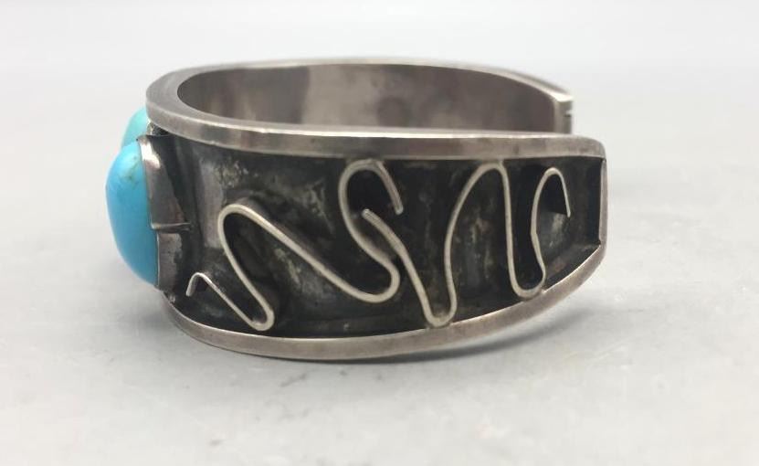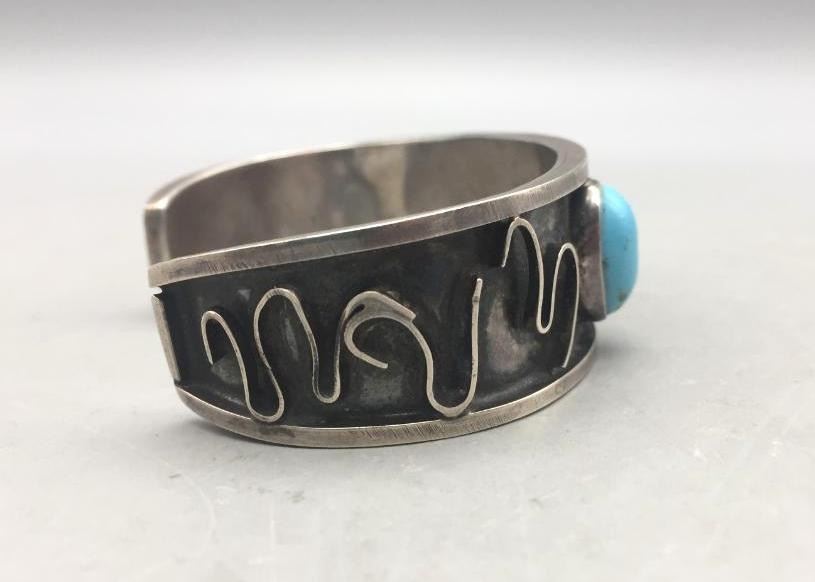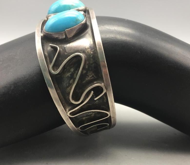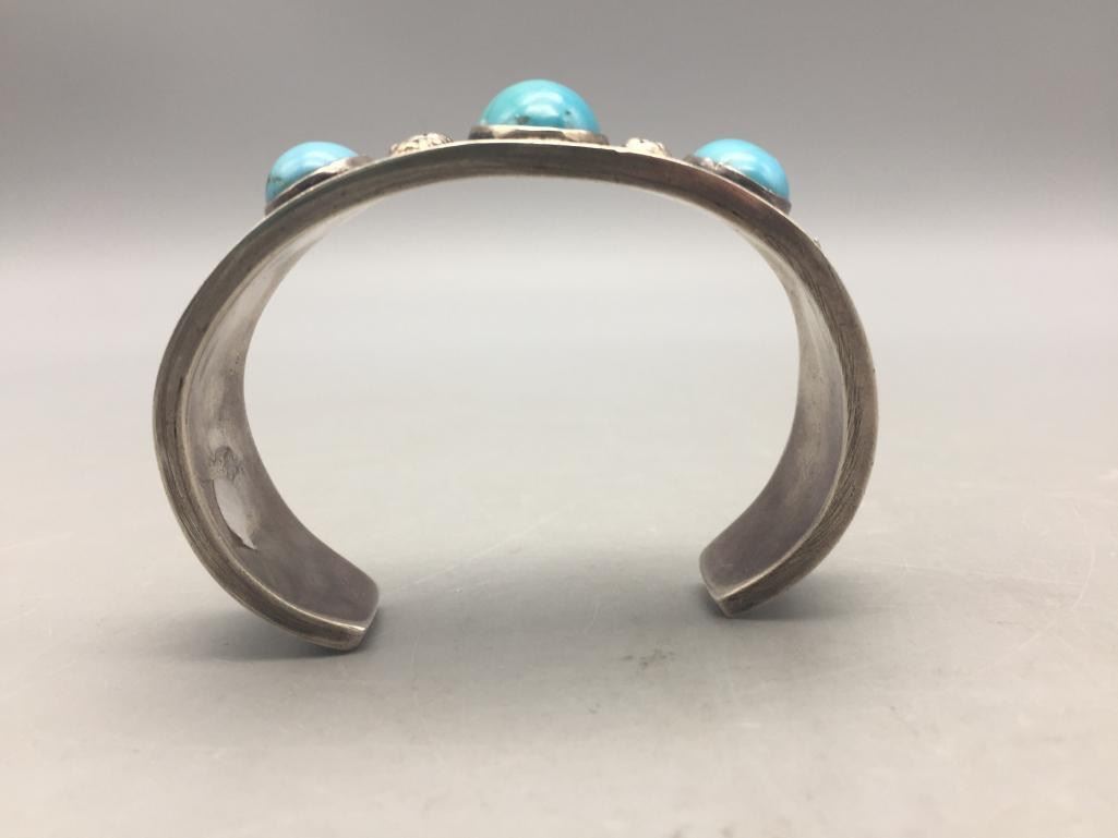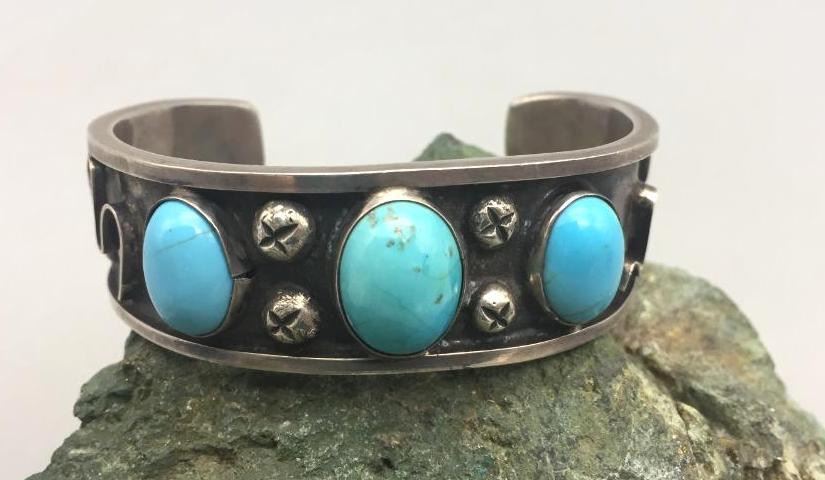 Presented for sale in this lot is a vintage three stone bracelet. It has nice silver work and is set with three turquoise cabochons accented with silver dots. Maker: Hallmarked Broken Arrow over a B for Broken Arrow Traders. Approx. Age: Vintage. Size:Inside circumference measures 5-1/8". Opening is an additional 1-3/8", fitting a 6-1/2" wrist. Width is 7/8". Weighs 44.2 grams. Condition: Good for its age, normal wear expected. Please look closely at the pictures - they are an important part of our description. Shipping: There will be a $5 handling, packaging fee for shipping this lot. The actual cost of postage will be added on top of that.
