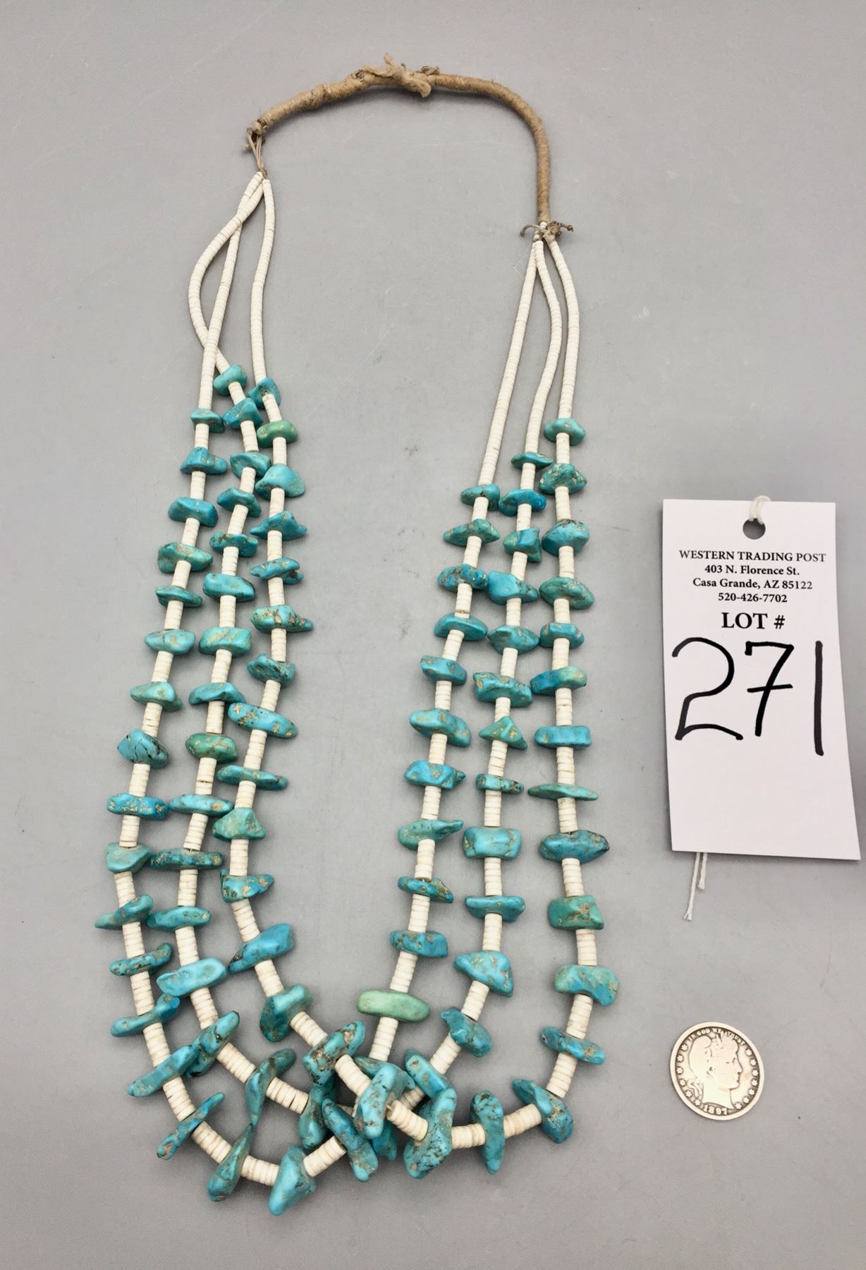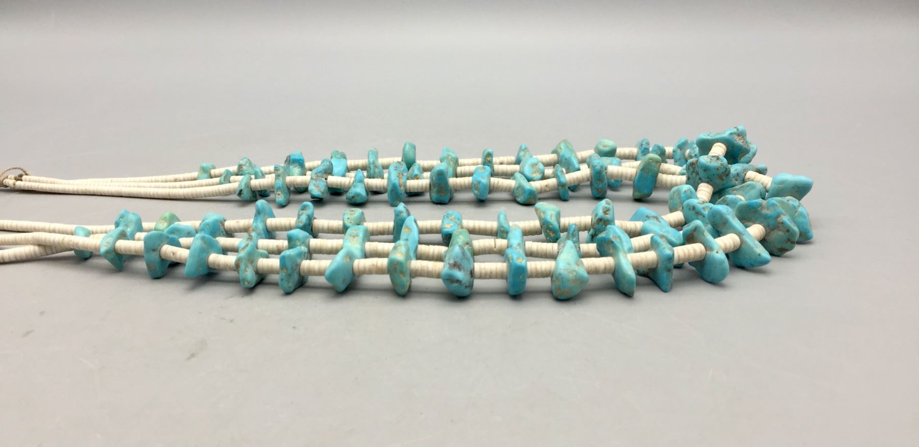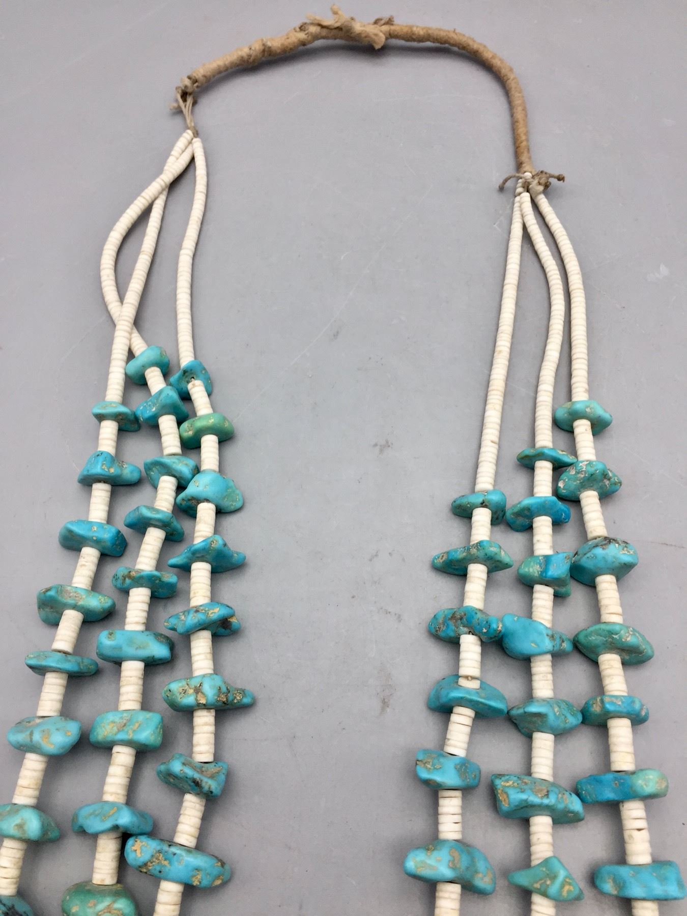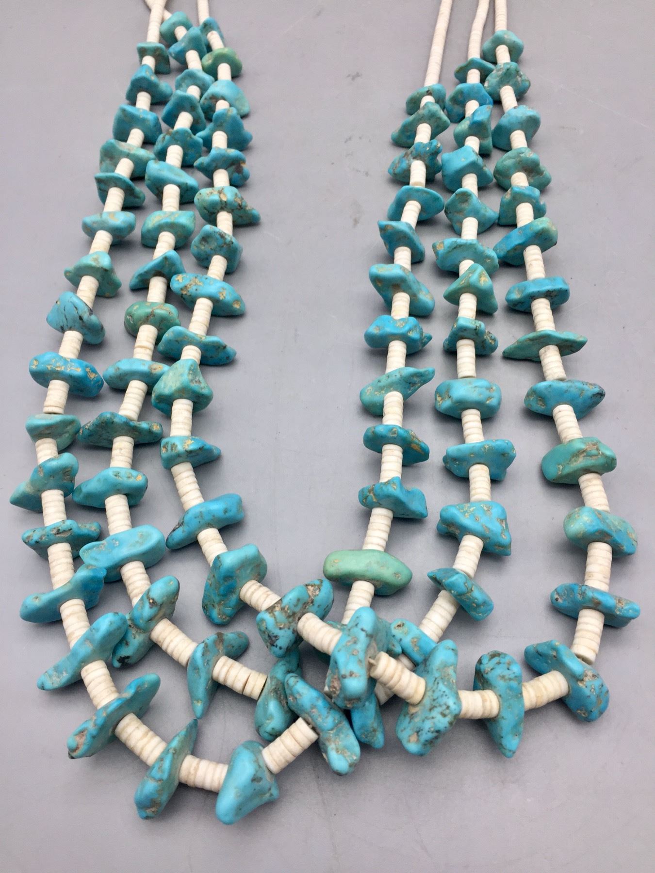 Description: Presented for sale in this lot is a vintage three strand turquoise and heishi necklace. This is an older necklace with nugget shaped turquoise beads and it is strung on a waxed nylon cord. Maker: Unknown. Approx. Age: Vintage. Size: Fits a 30 inch neck. Weighs 196.5 grams. Condition: Good for its age, normal wear expected. Please look closely at the pictures - they are an important part of our description. Shipping: There will be a $5 handling, packaging fee for shipping this lot. The actual cost of postage will be added on top of that.