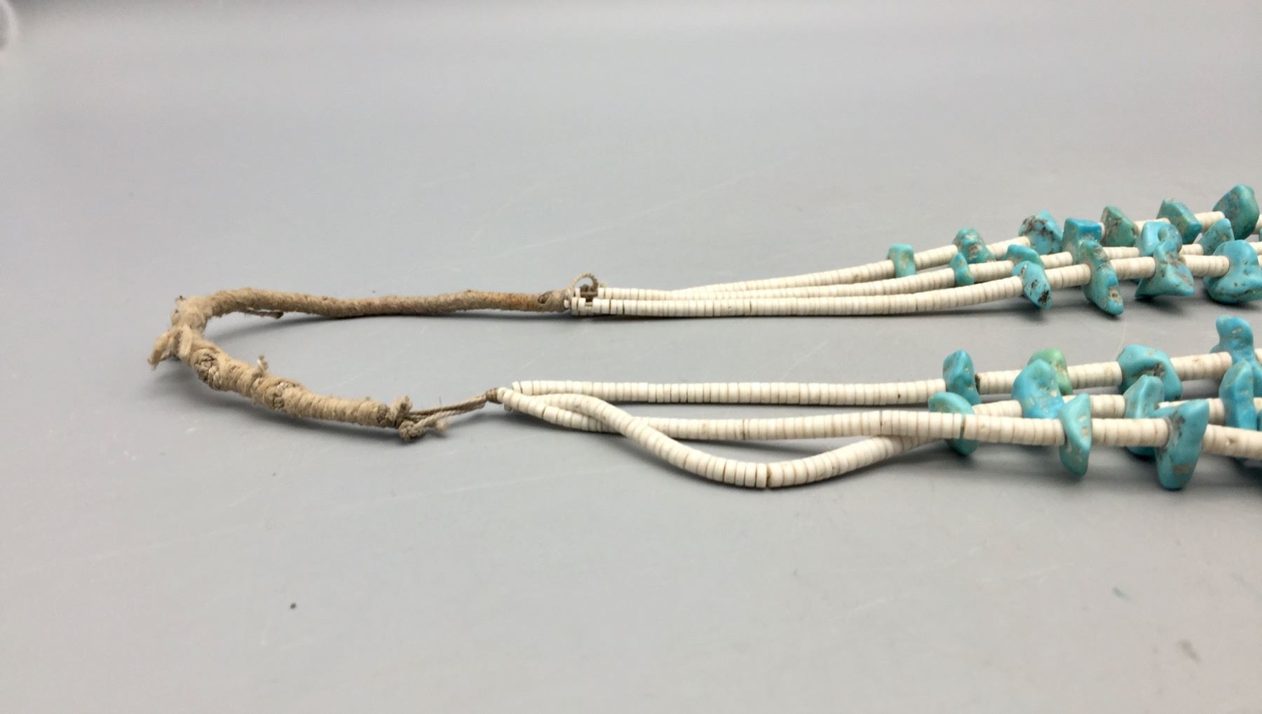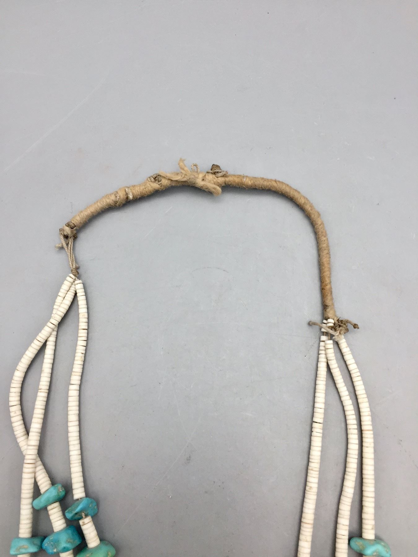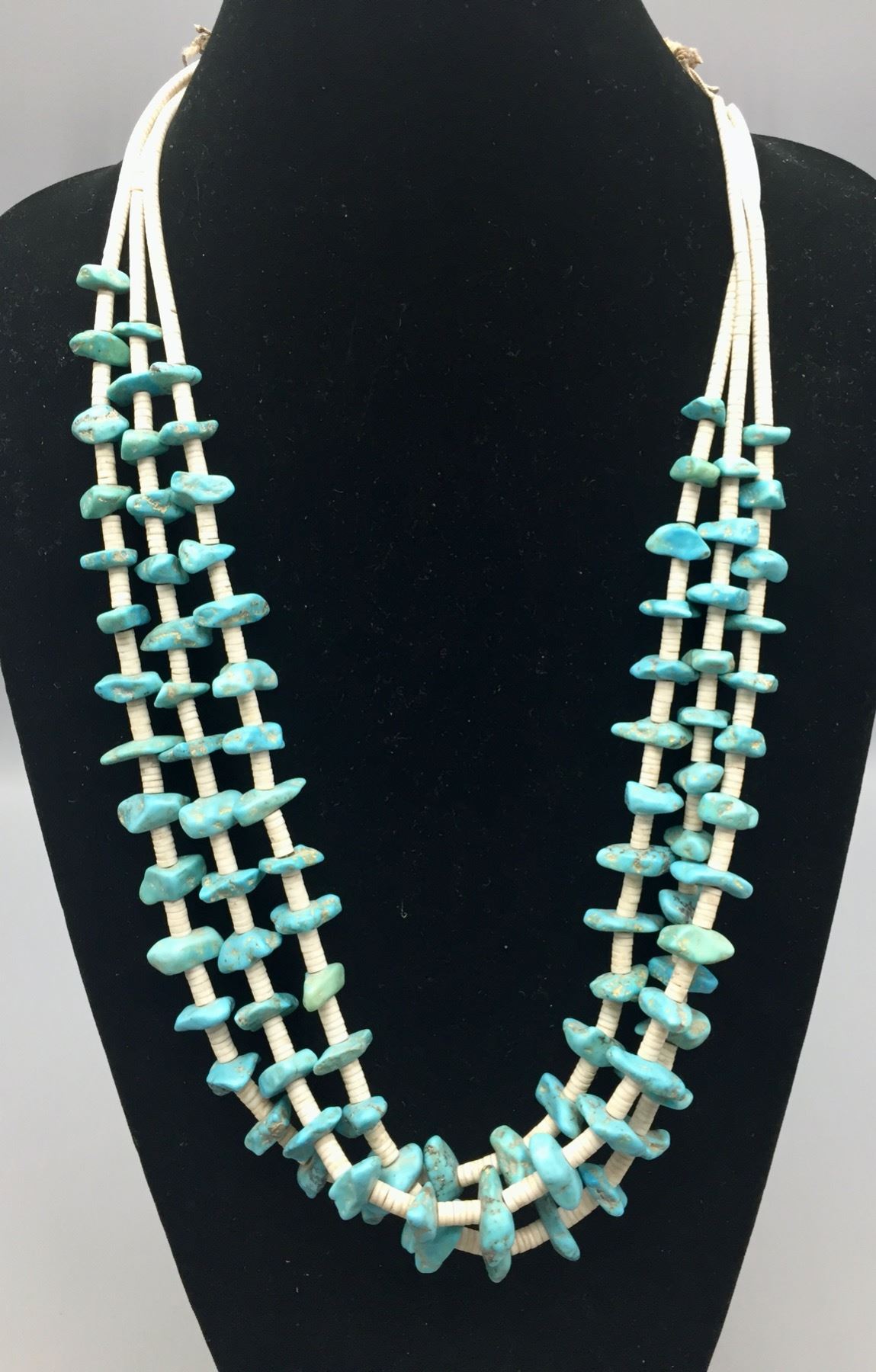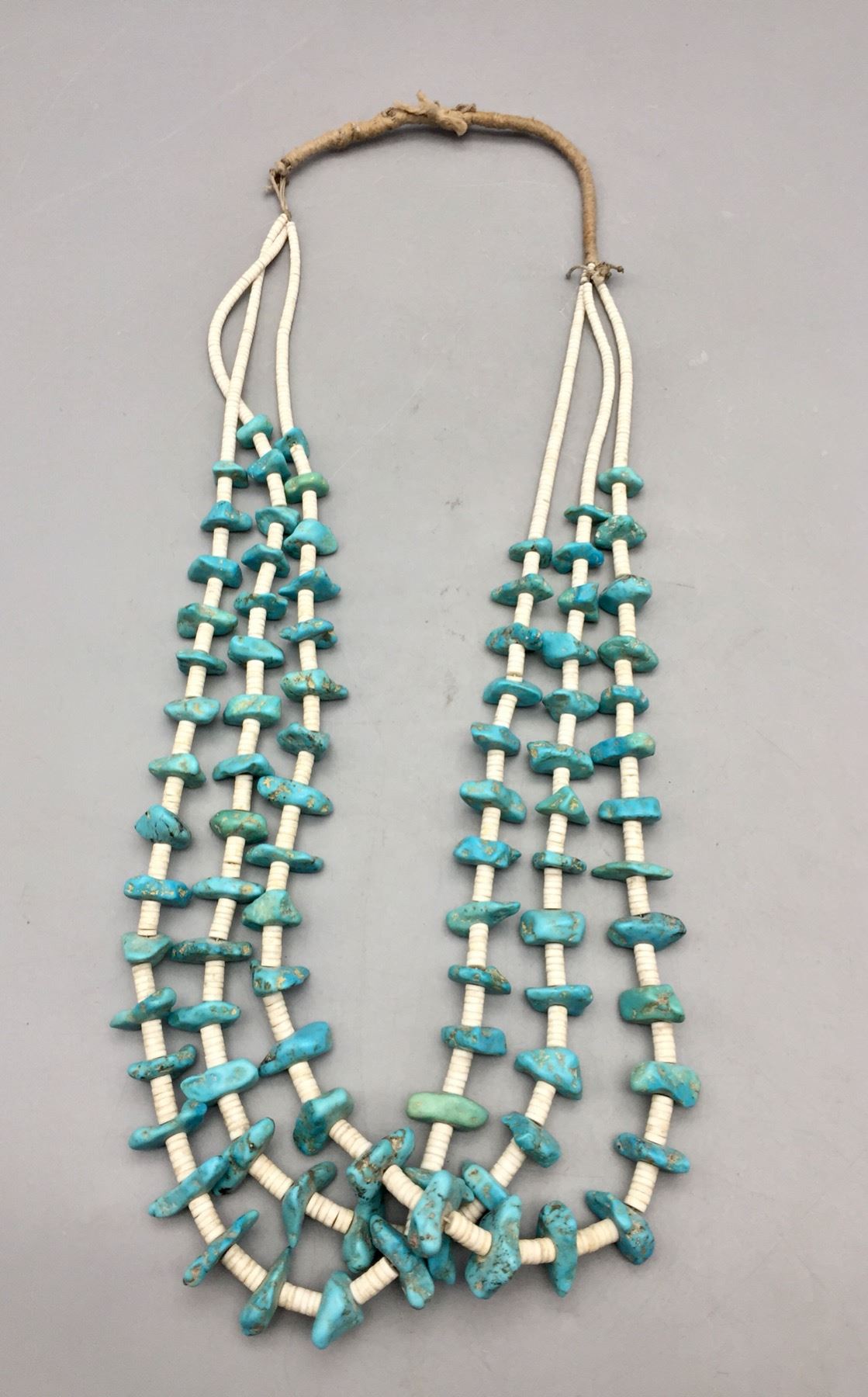 Description: Presented for sale in this lot is a vintage three strand turquoise and heishi necklace. This is an older necklace with nugget shaped turquoise beads and it is strung on a waxed nylon cord. Maker: Unknown. Approx. Age: Vintage. Size: Fits a 30 inch neck. Weighs 196.5 grams. Condition: Good for its age, normal wear expected. Please look closely at the pictures - they are an important part of our description. Shipping: There will be a $5 handling, packaging fee for shipping this lot. The actual cost of postage will be added on top of that.