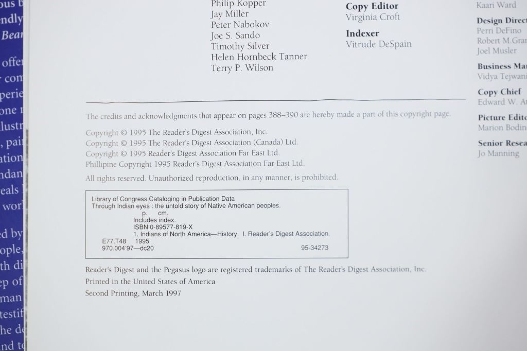 Offered in this a lot is a Vintage "Through Indian Eyes: The Untold Story of Native American Peoples", by Readers Digest, Second Printing 1997. A thoughtful history from the perspective of Native Americans experienced it, lavishly illustrated with hundreds of photographs, paintings, drawings, beautifully drawn maps, original illustrations, and rare archival images. including an abundance of work by Native American artists that reveals how they saw themselves and their world. The story is amplified by memorable quotations from native people, both past and present. It draws on the traditions, reminiscences, and legends of diverse Native American tribes to explore the history of these peoples and their way of life over the last five centuries, from the time of Columbus to the 20th century. This black cloth bound hardcover is in very good condition, illustrated blue and gold coloured paper dust jacket is in very nice condition. Intact pages are clean. Measures 9.5"W x 12.25"L x 1.25"D, weight is 4lb, 10oz.