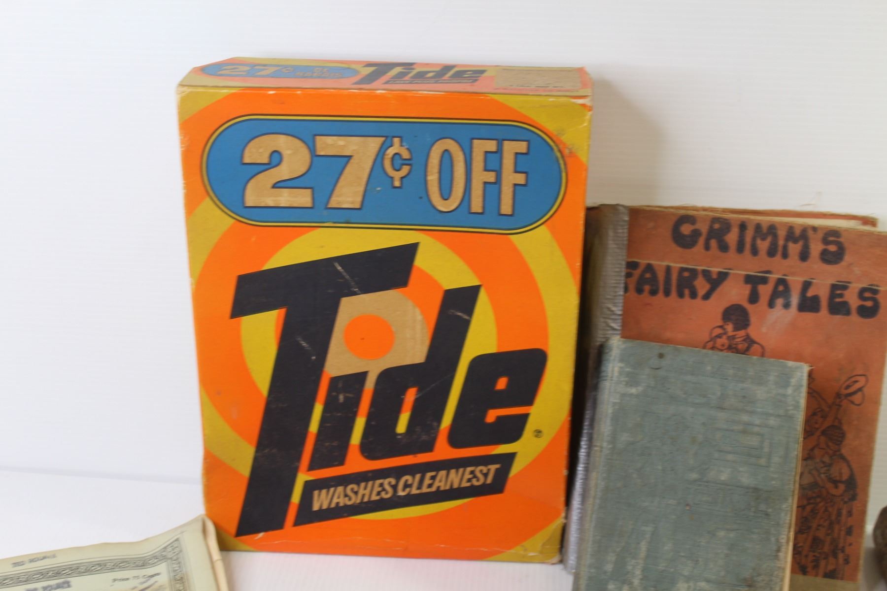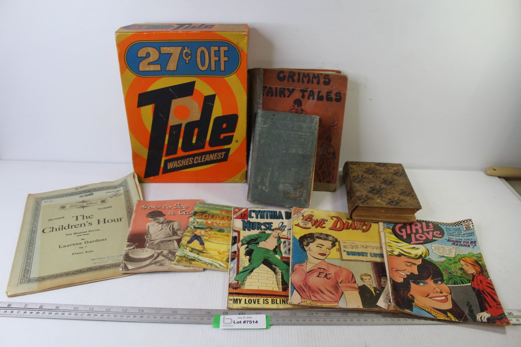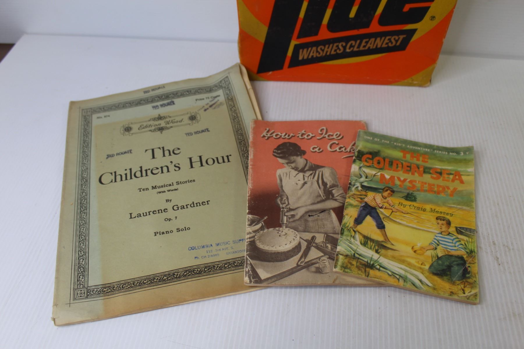 Vintage Tide Box - Children's Musical Stories - How To Ice a Cake - (3) 12 Cent Comics (DC & CDC) - Dominion Cook Book - Children's Story Books