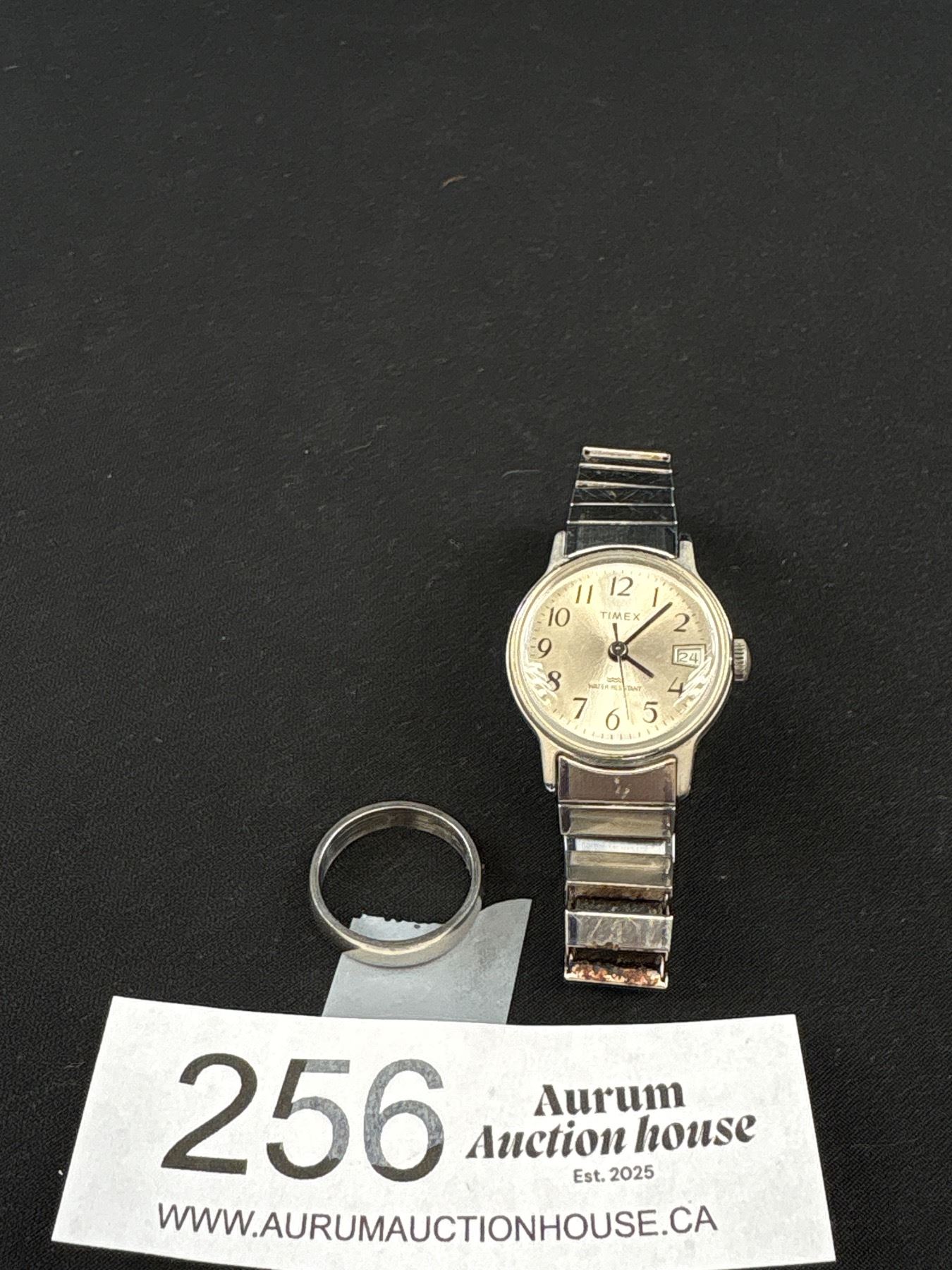 Vintage Timex Stainless Steel Back Manual Wind Up Wristwatch, Date, Water Resistant, Working + Stainless Steel Ring Band