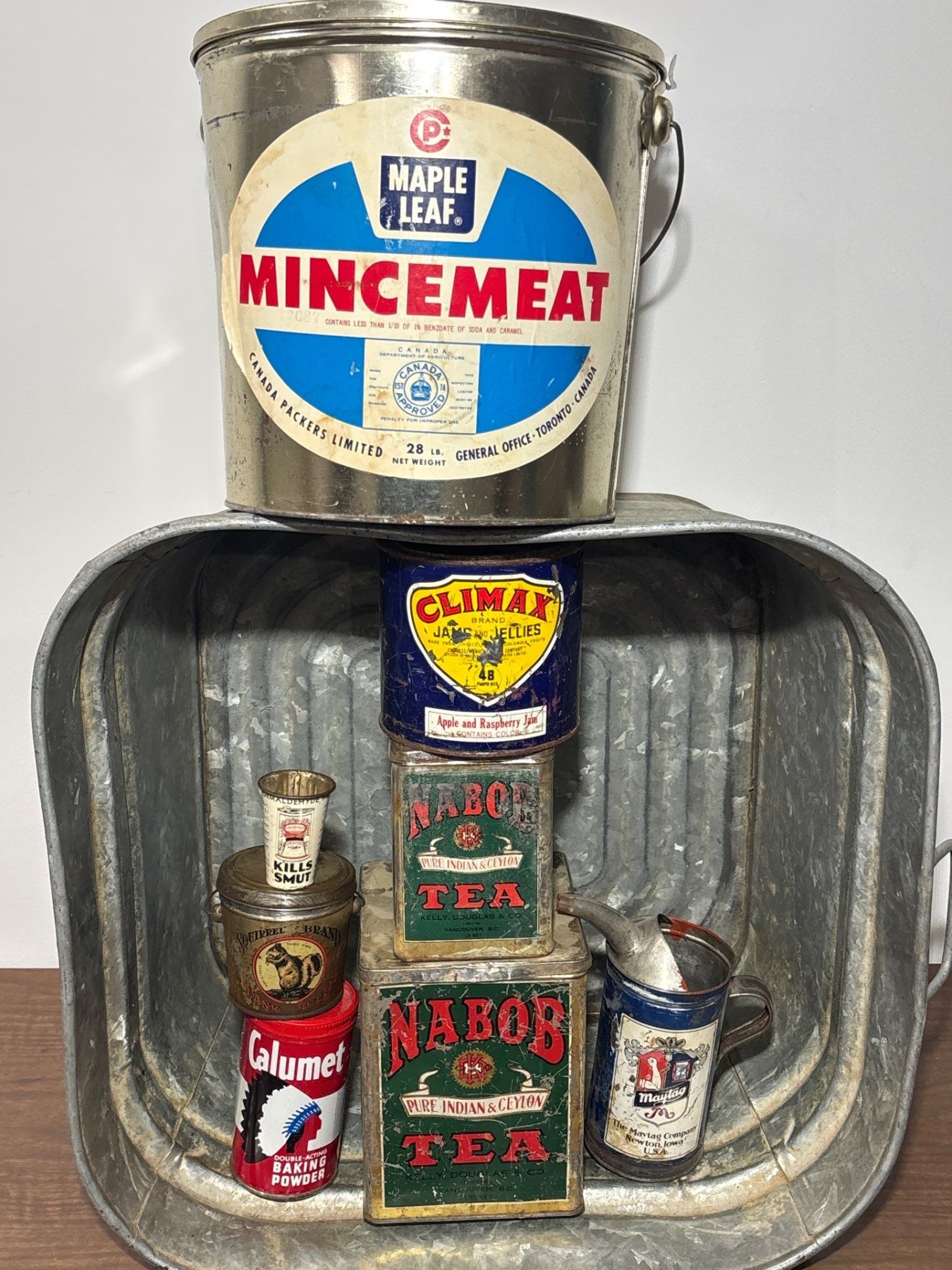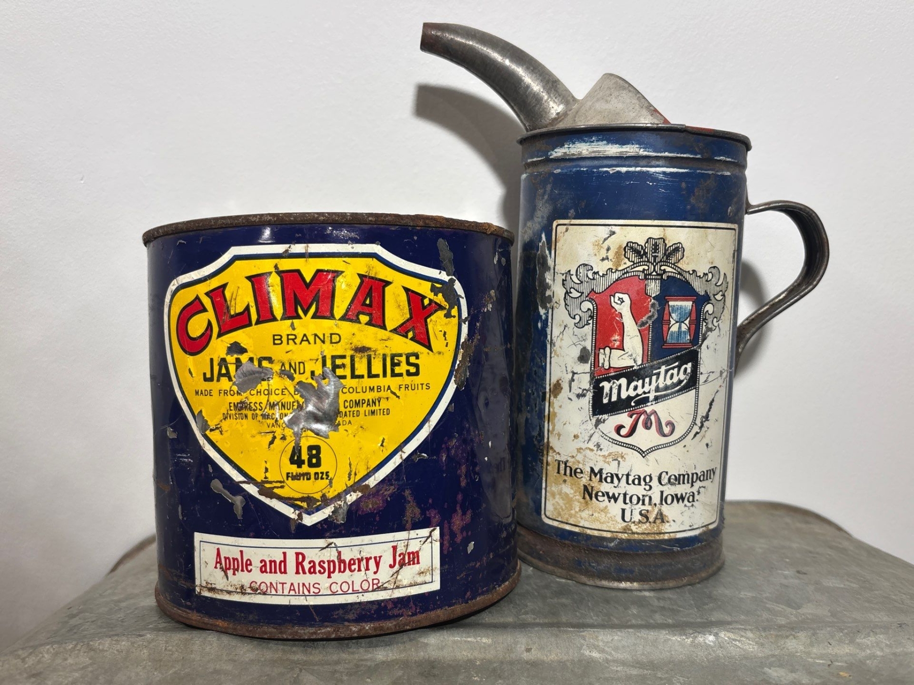 Vintage Tins: Nabob, Maytag Fuel Mixing Jug, Climax Jams, Formaldehyde Cup & More