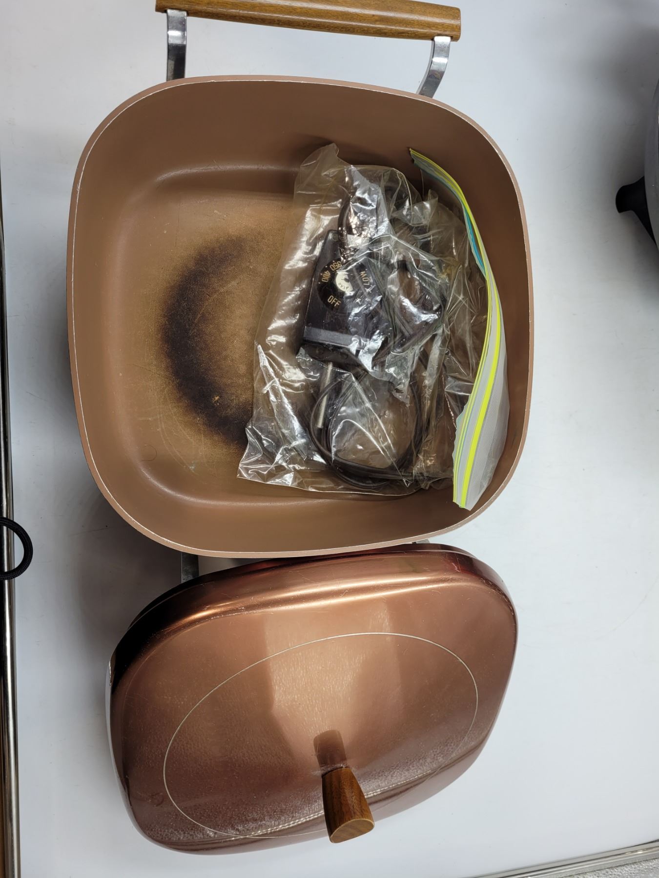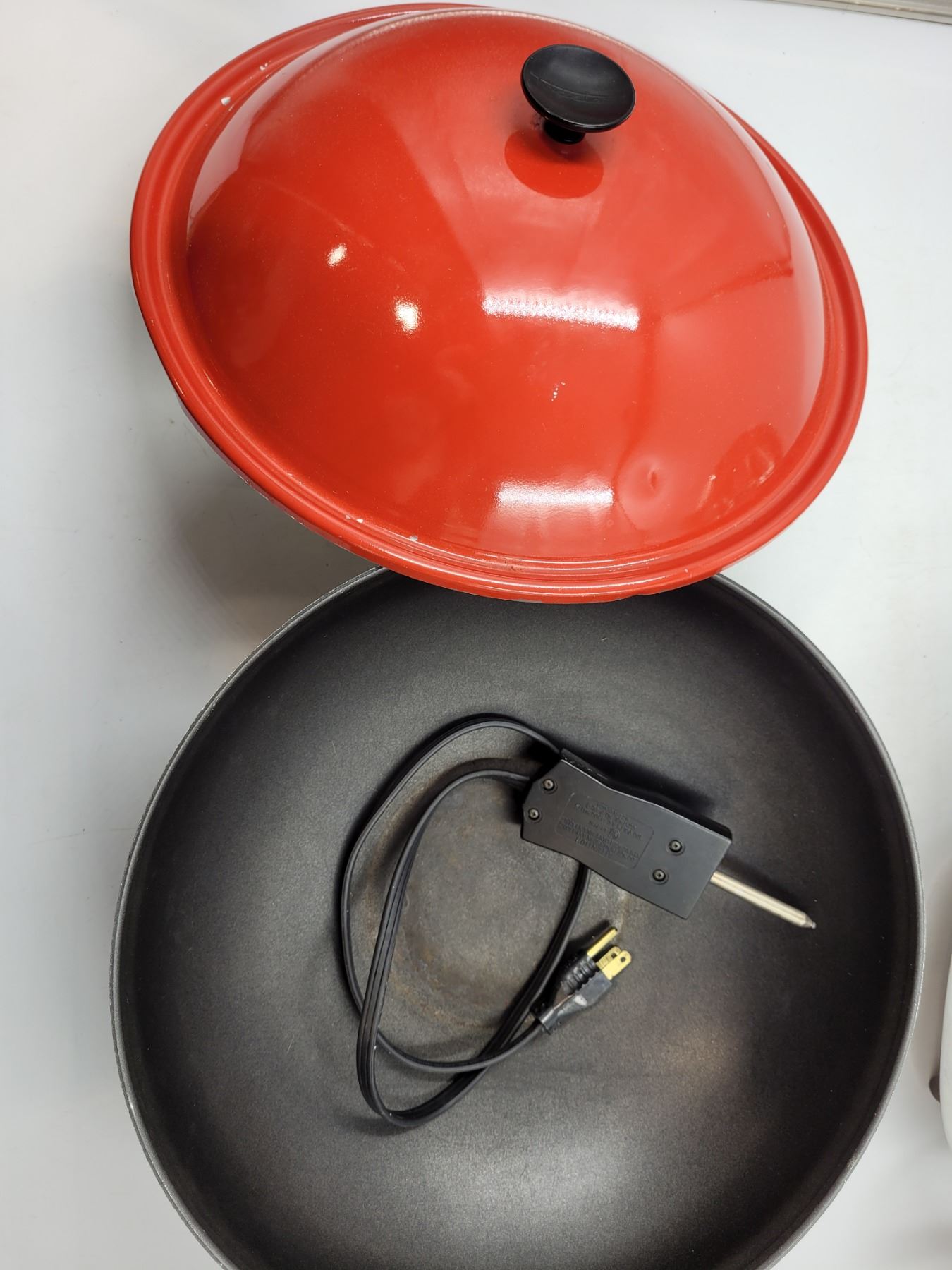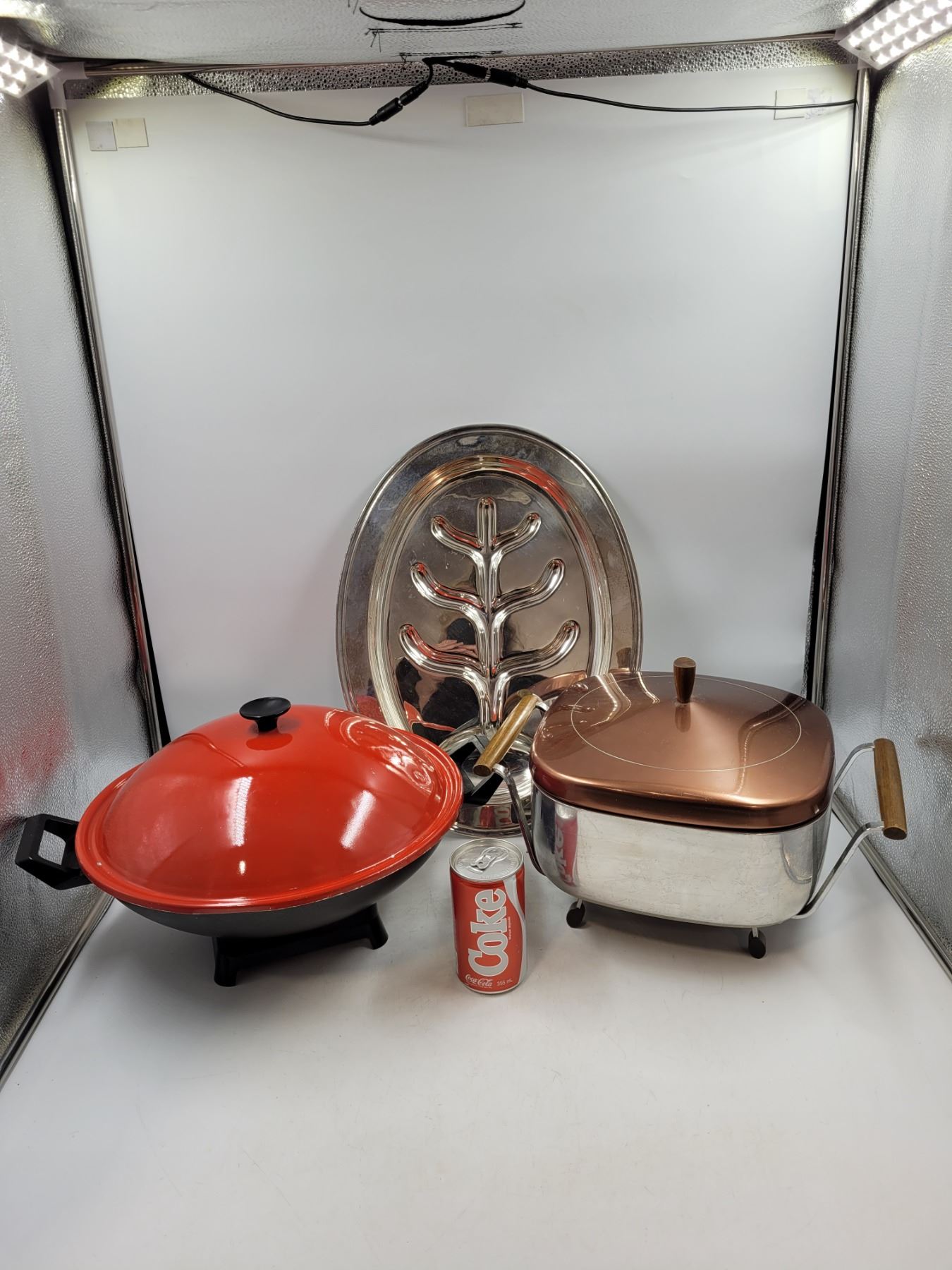 Vintage Toastess Electric Wok, Mid-century GE Electric Roaster, & Plated Meat Serving Tray