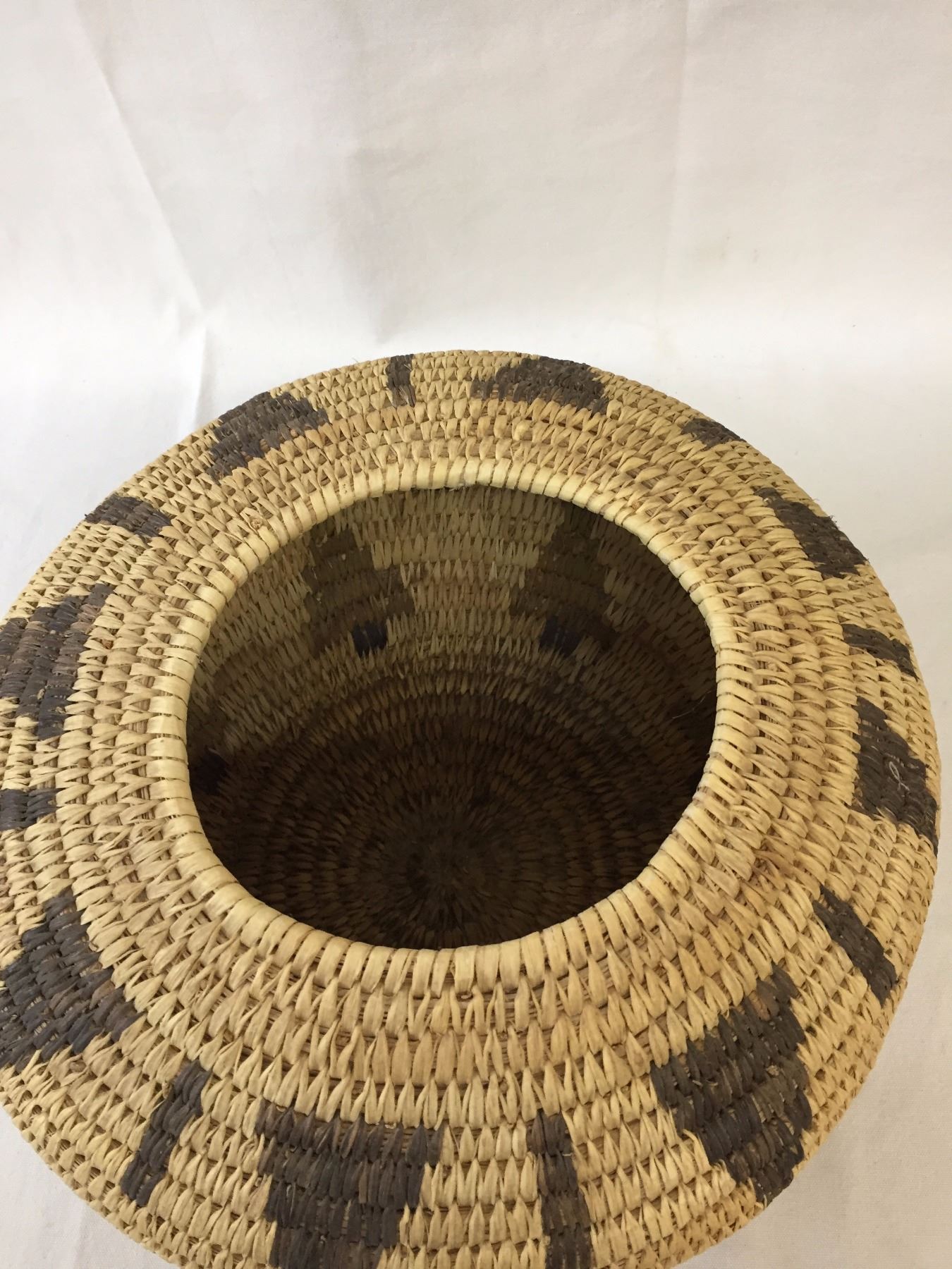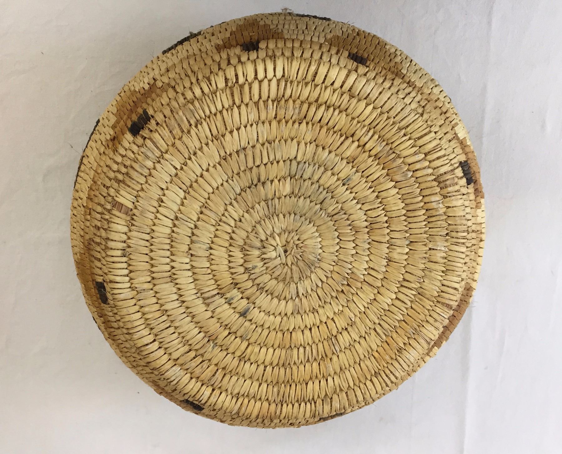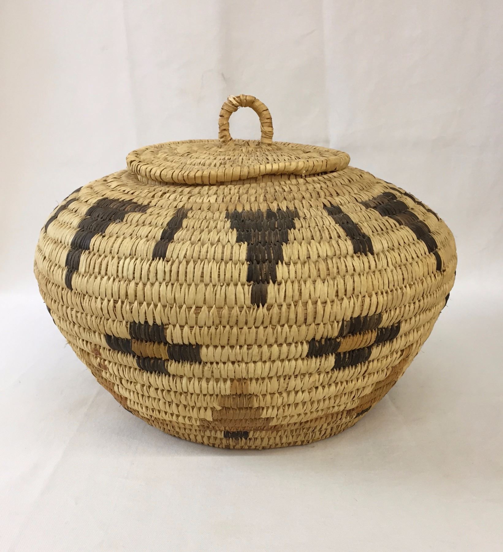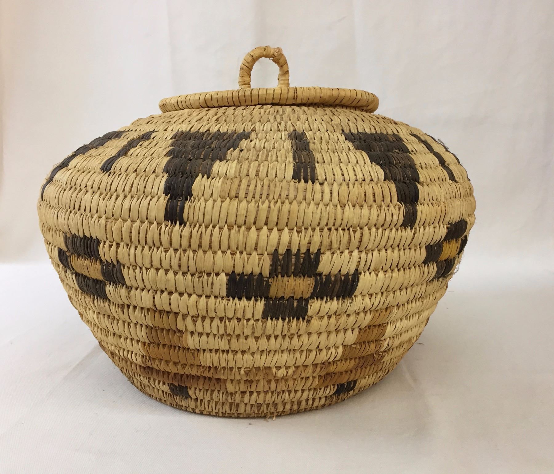 Description: A Lidded basket from the Tohono O’odham tribe. Maker: Unknown Tohono O’odham weaver. Approx. Vintage, circa 1960s. Size: 15” across x 8” deep. Condition: Fair for its age, some wear and fading expected. Please look closely at the pictures - they are an important part of our description. Shipping: There will be a $7 handling / packaging fee for shipping this lot. The actual cost of postage will be added on top of that.