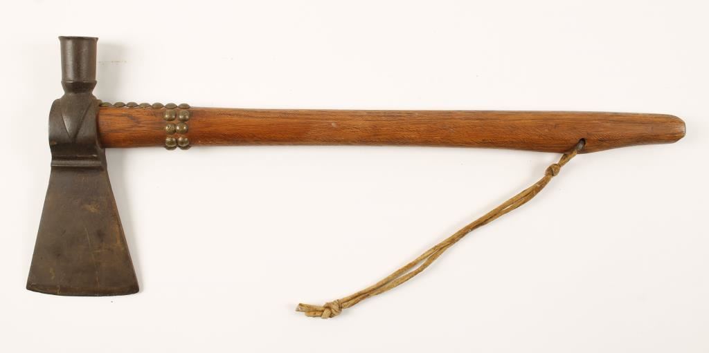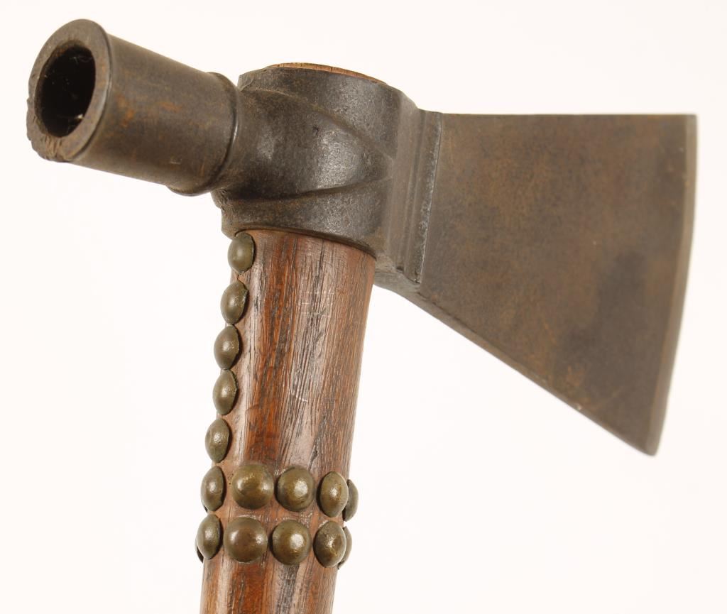 Metal axe head and bowl with oak handle and brass tacked decoration. Measures 17" overall with a 6" blade.