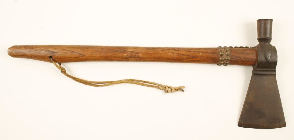 Metal axe head and bowl with oak handle and brass tacked decoration. Measures 17" overall with a 6" blade.