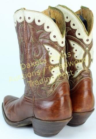 butterfly pattern, brown leather with white inlays to back and front of uppers. Boots show very good condition including soles, stacked leather heels, Tony Lama marked inner pulls, sides measuring 10" long. Est.
