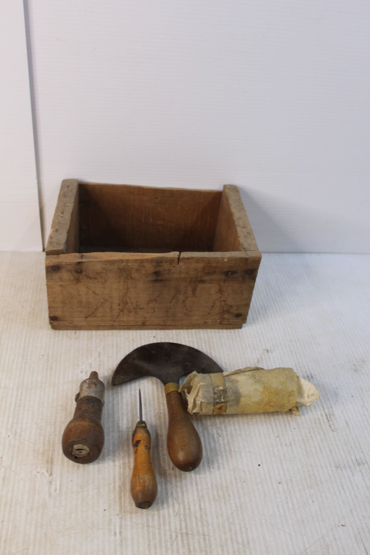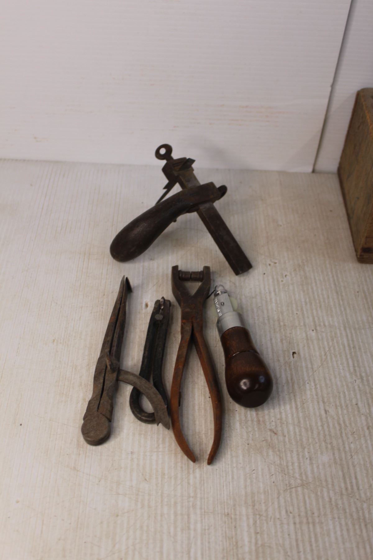 Vintage Tools- Caliper, Leather Press, Misc. & Wood Box