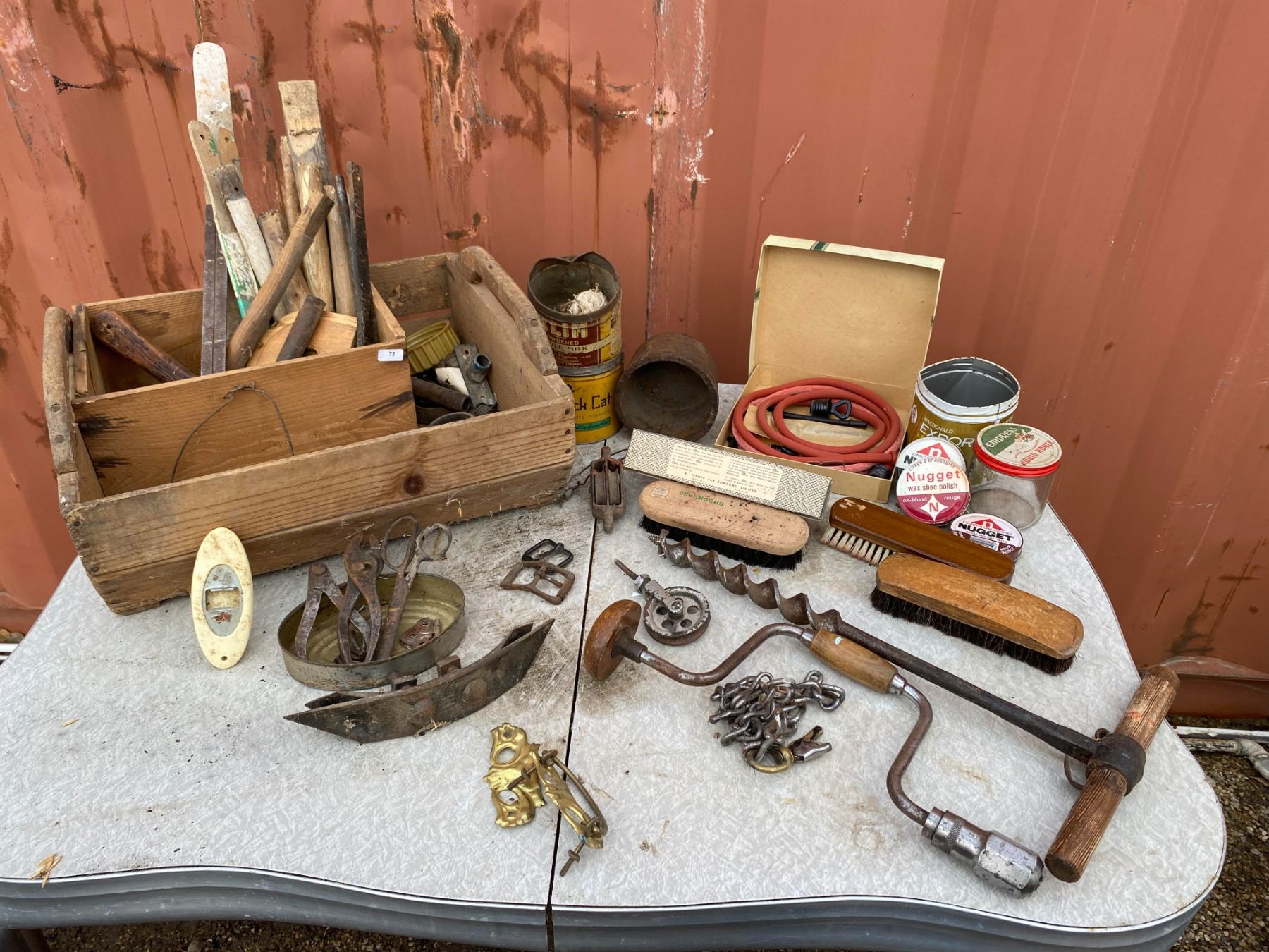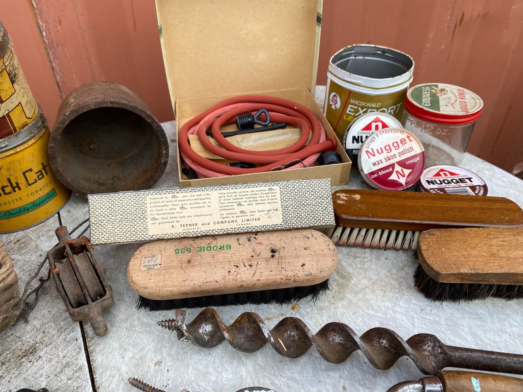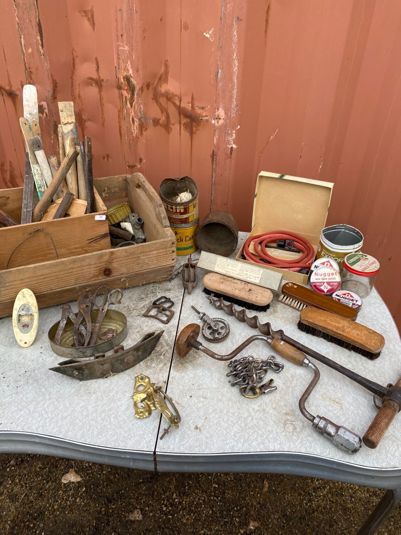 Eclectic mix of vintage hand tools, brushes, tins, buckles, chains, and workshop items. Perfect for rustic decor, restoration projects, or reseller inventory.