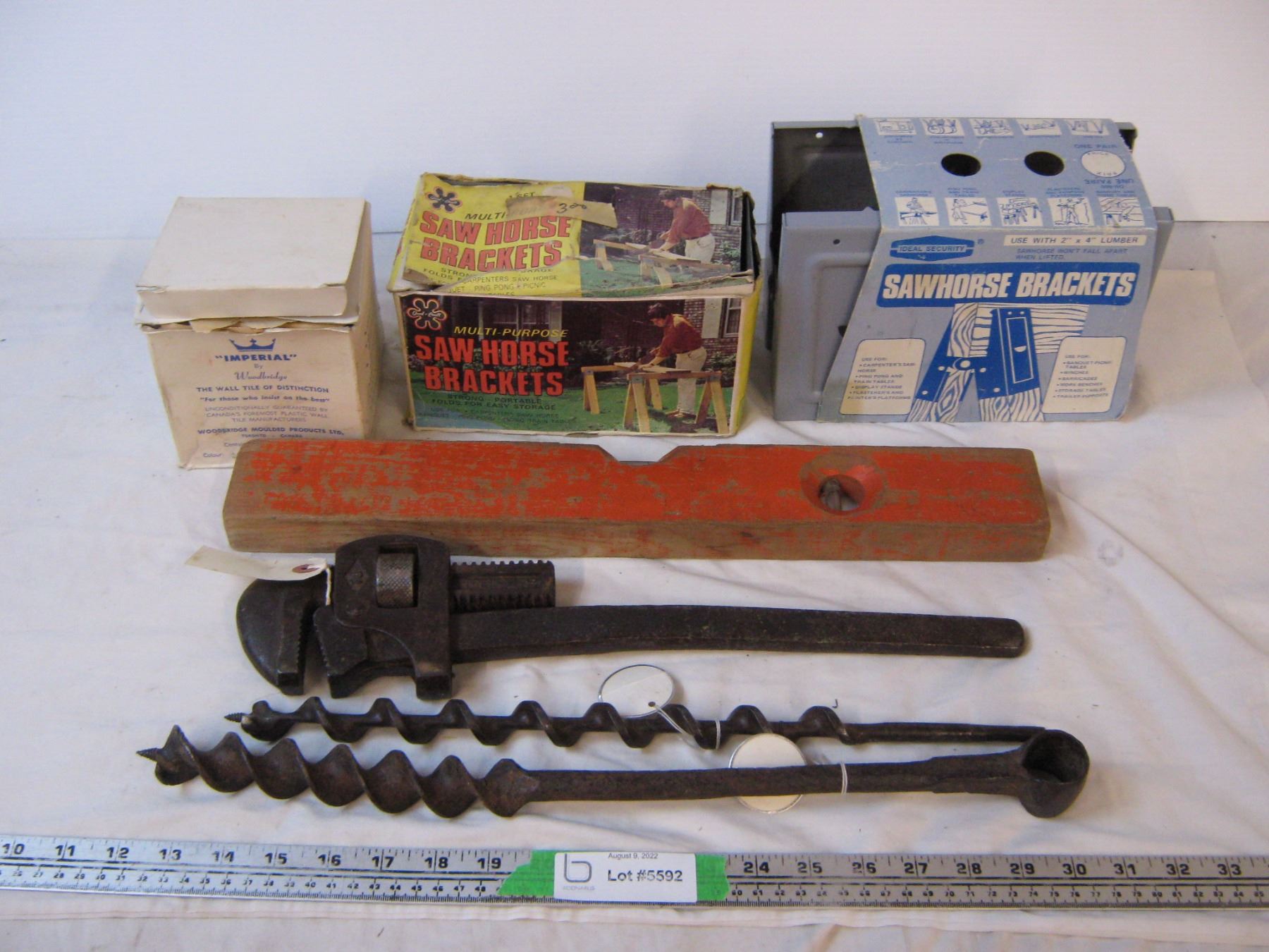 Vintage Tools, Level,Pipe Wrench,Auger Bit, Wood Bit.. (2) Sawhorse Brackets,Tiles