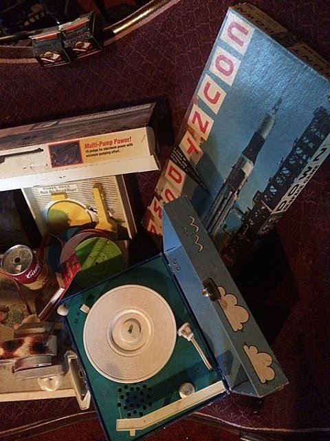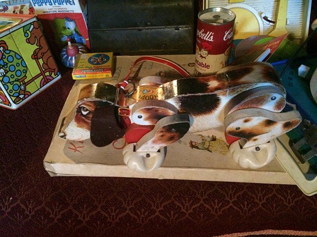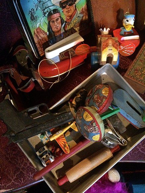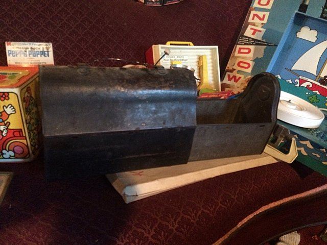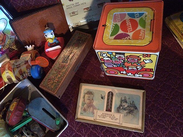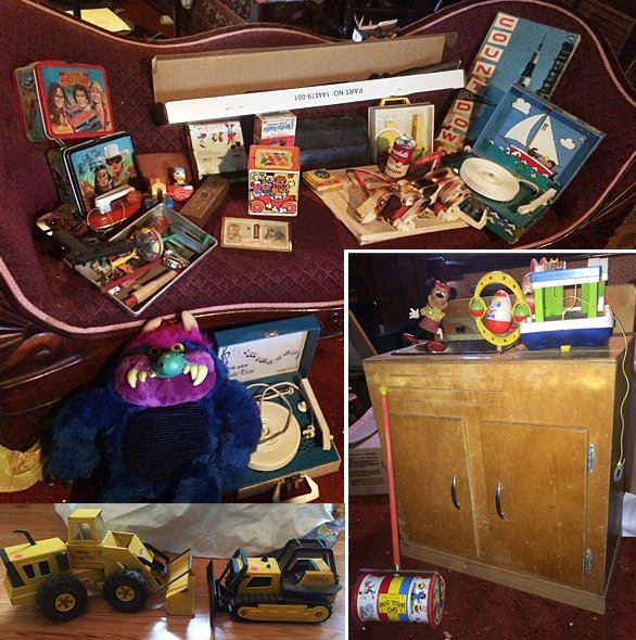 Vintage estate toy collection includes vintage tin toys, Dukes of Hazzard and Lone Ranger vintage lunch boxes with original thermos', vintage pull toys, multi-pump Repeater Daisy BB gun with original box, children's record players, Countdown board game, very early lunch box that pulls out from side, wooden child's sink, Mattel Jack 'N the Box, paper dolls, Vintage Tonka Trucks, additional vintage children's toys. All being sold as found for 1 monies!