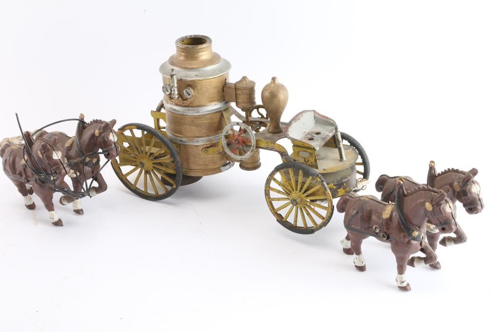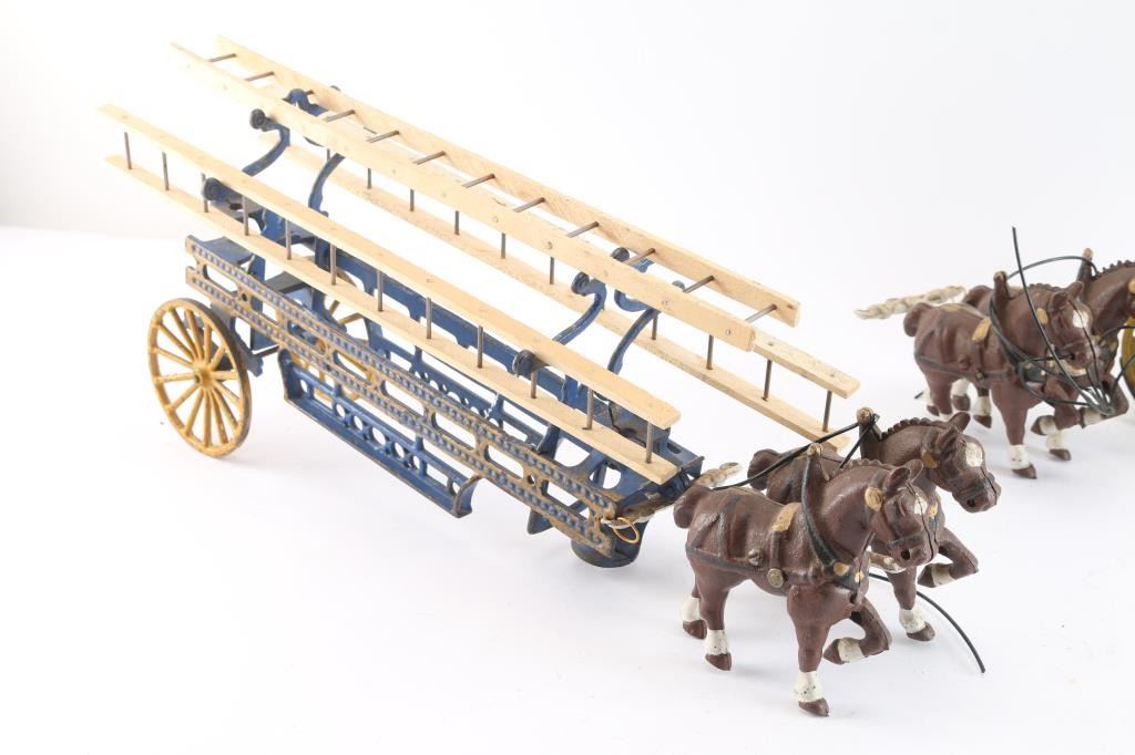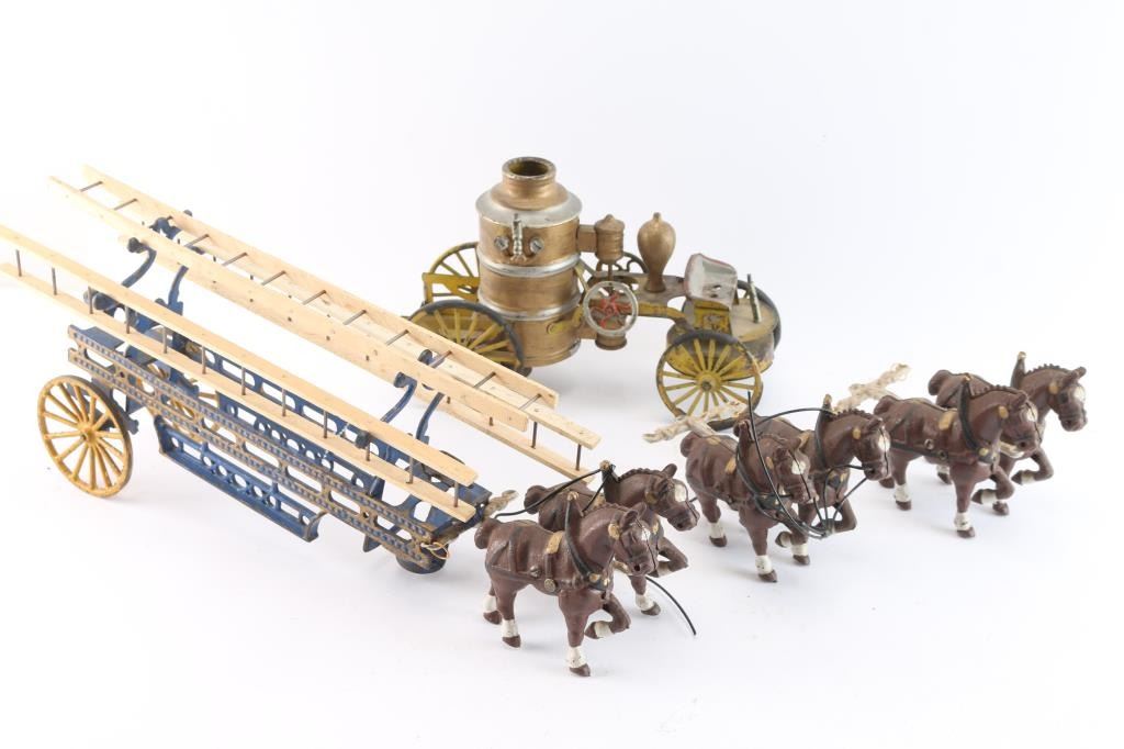 Includes a cast iron fire engine and ladder truck with 6 horses, also included is a antique Kingsburg fire pump.
