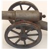 21" long x 5 3/4" tall x 5 3/4" wide, painted wood construction with metal strap wheels, Civil War style cannon, 12" spring loaded barrel, release on pull shaft, no height adjustment. Great working condition, one wheel has a split, also some paint loss.