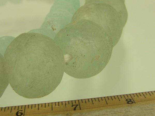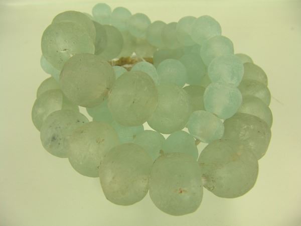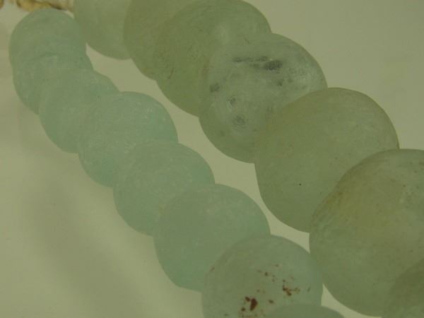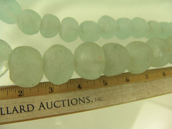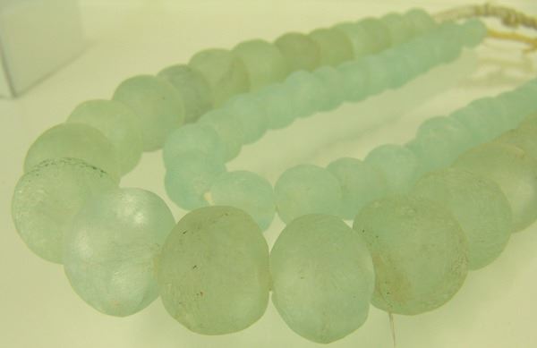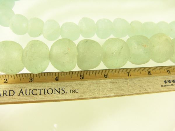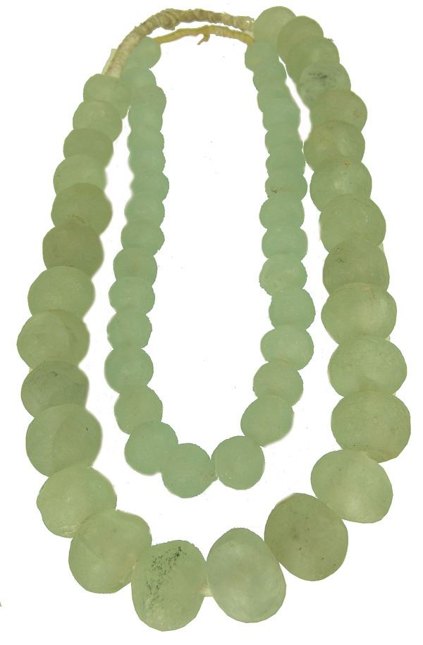 Two strands of ice green, Dutch "sea glass" tradebeads in 1" and 1-1/2" sizes. Very good condition, with natural cracks and imperfections.Early/Mid 1900s32",28"