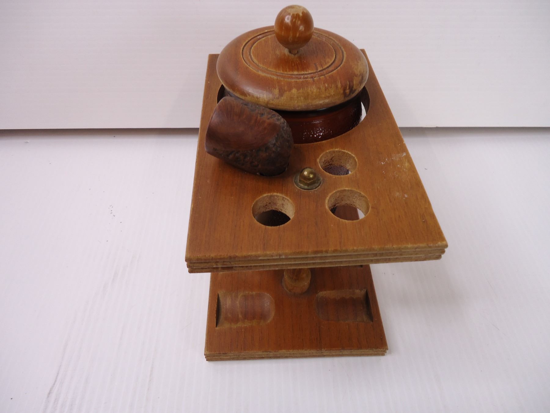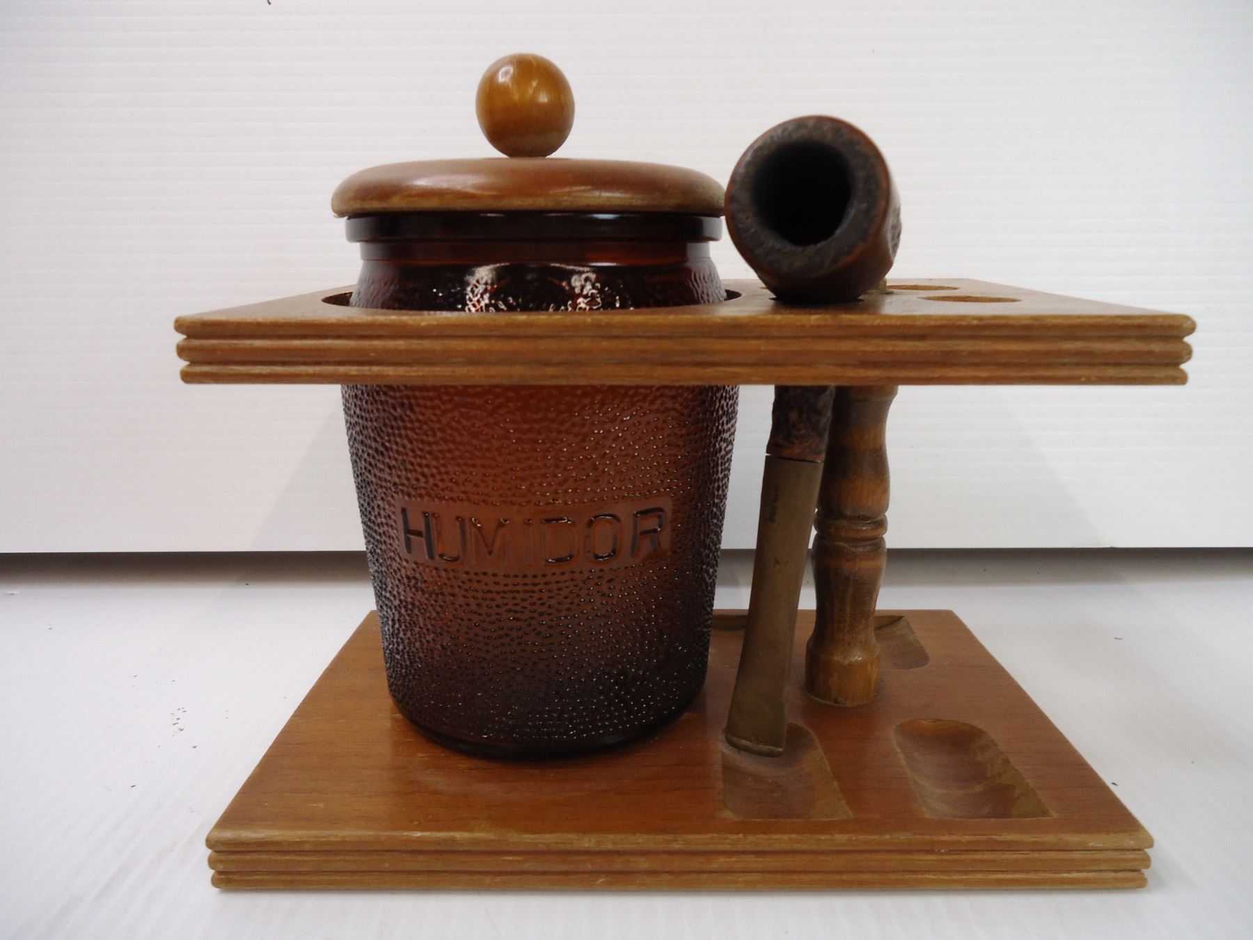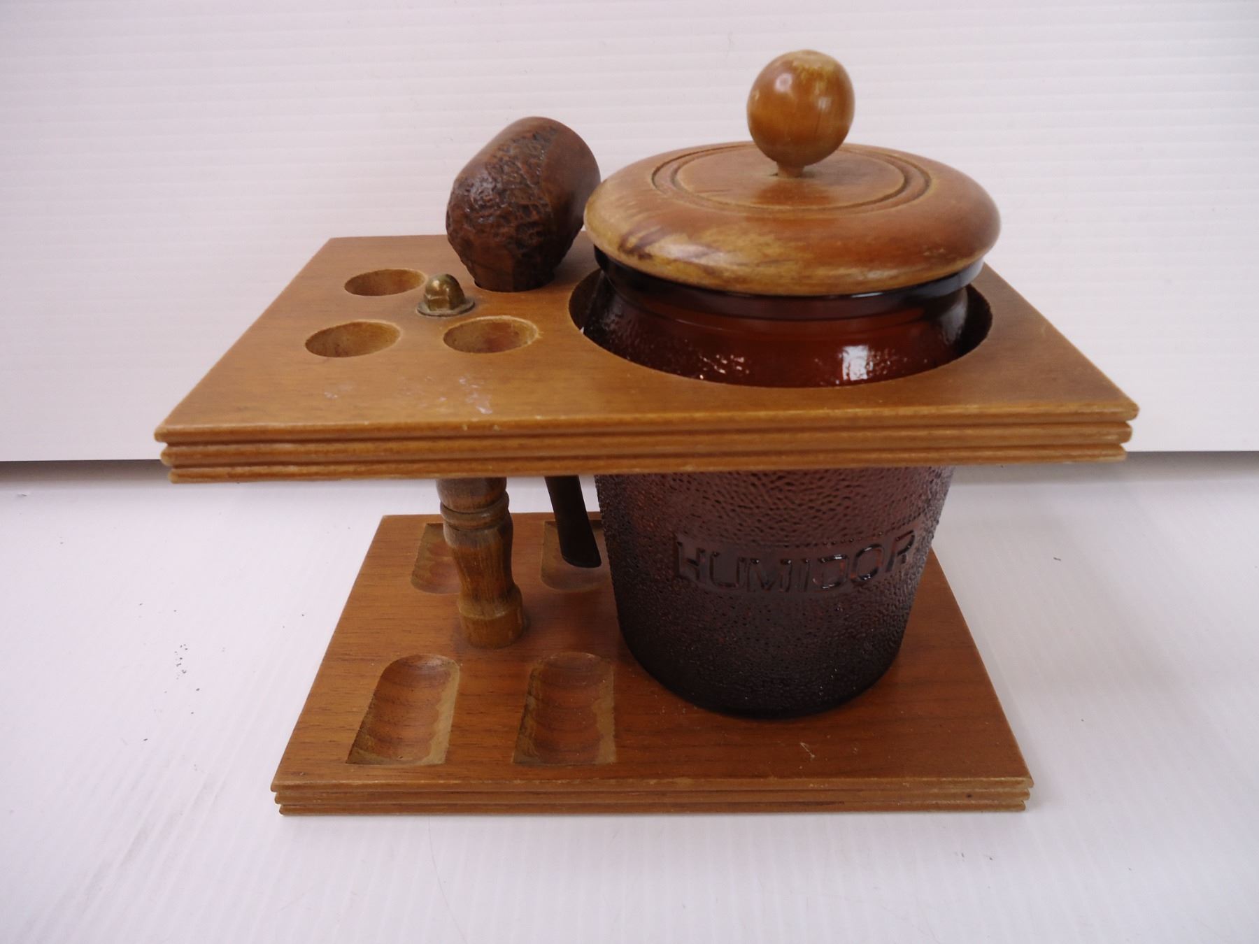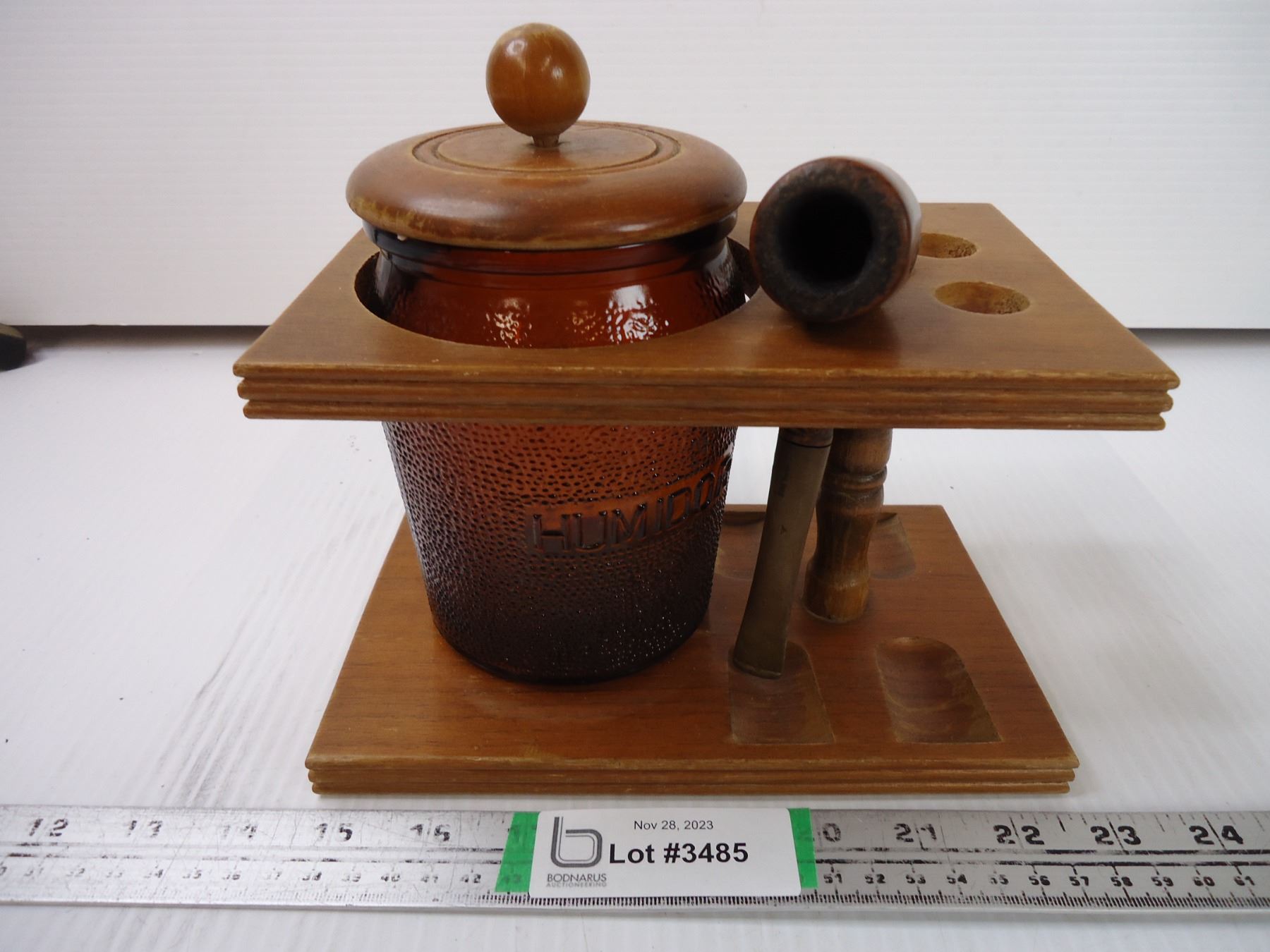 Vintage Traditional Walnut Estate Pipe Display Stand with Humidor Jar
