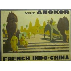 Cambodian Travel Poster, before 1950. Reads "Visit Angkor-French Indo-China." 28" x 38" Mounted on board. good condition