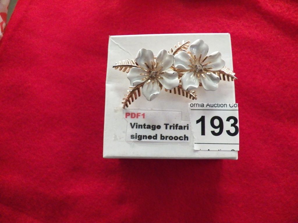 Vintage Trifari Signed Brooch White Enameled Flowe