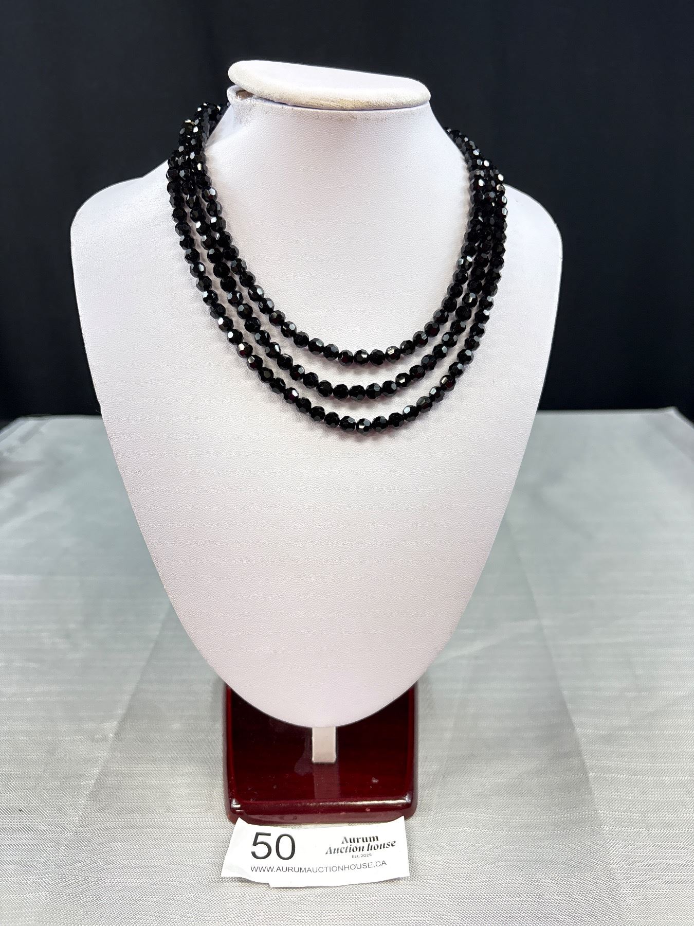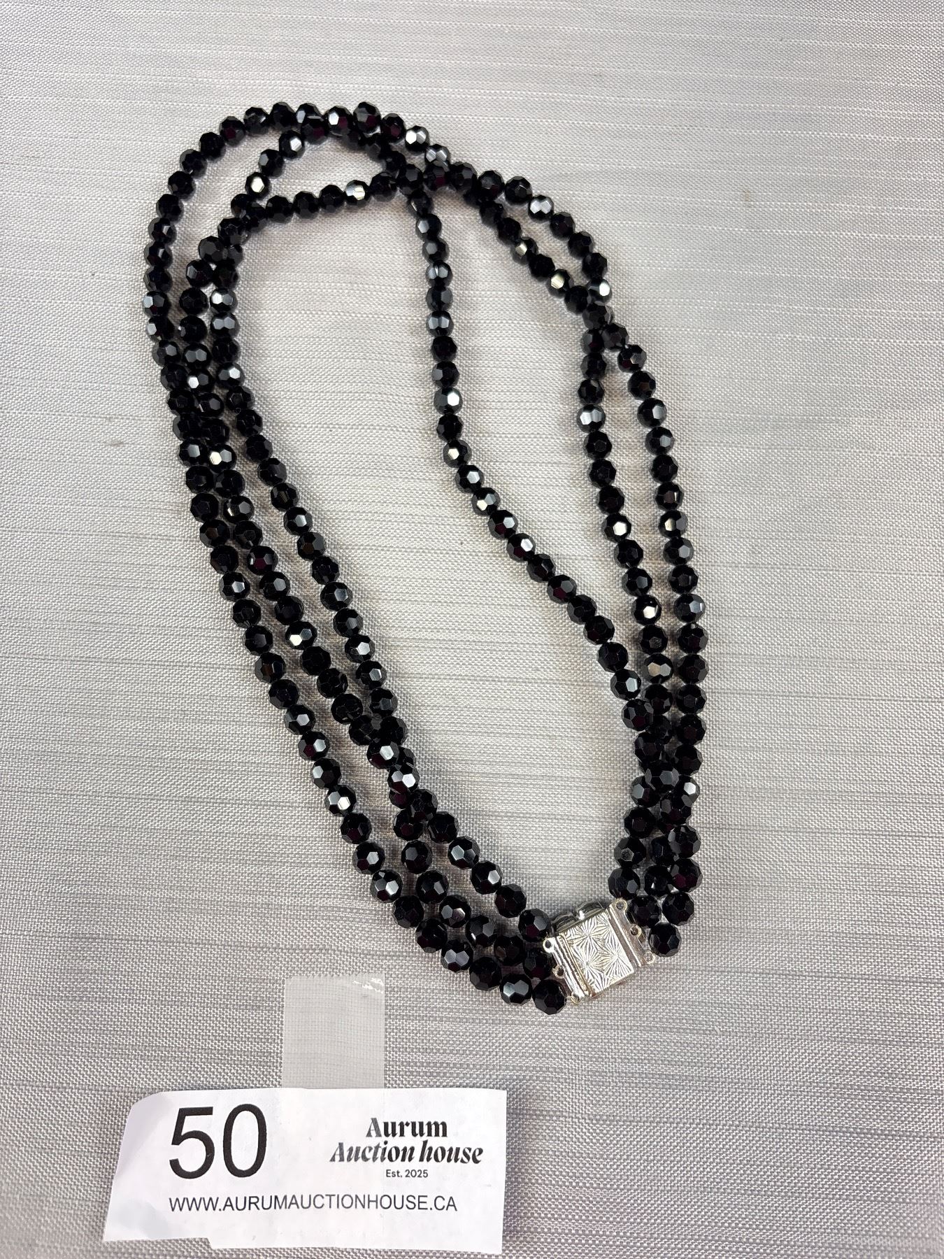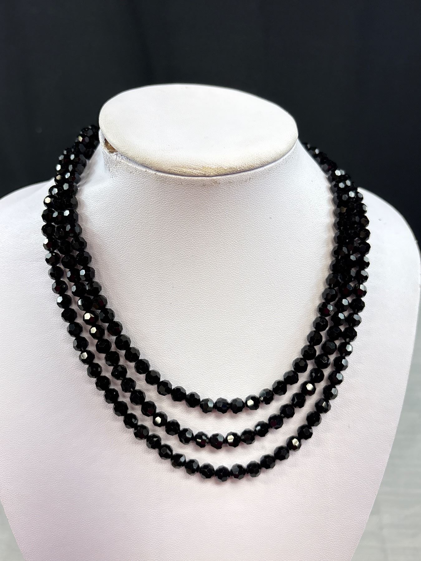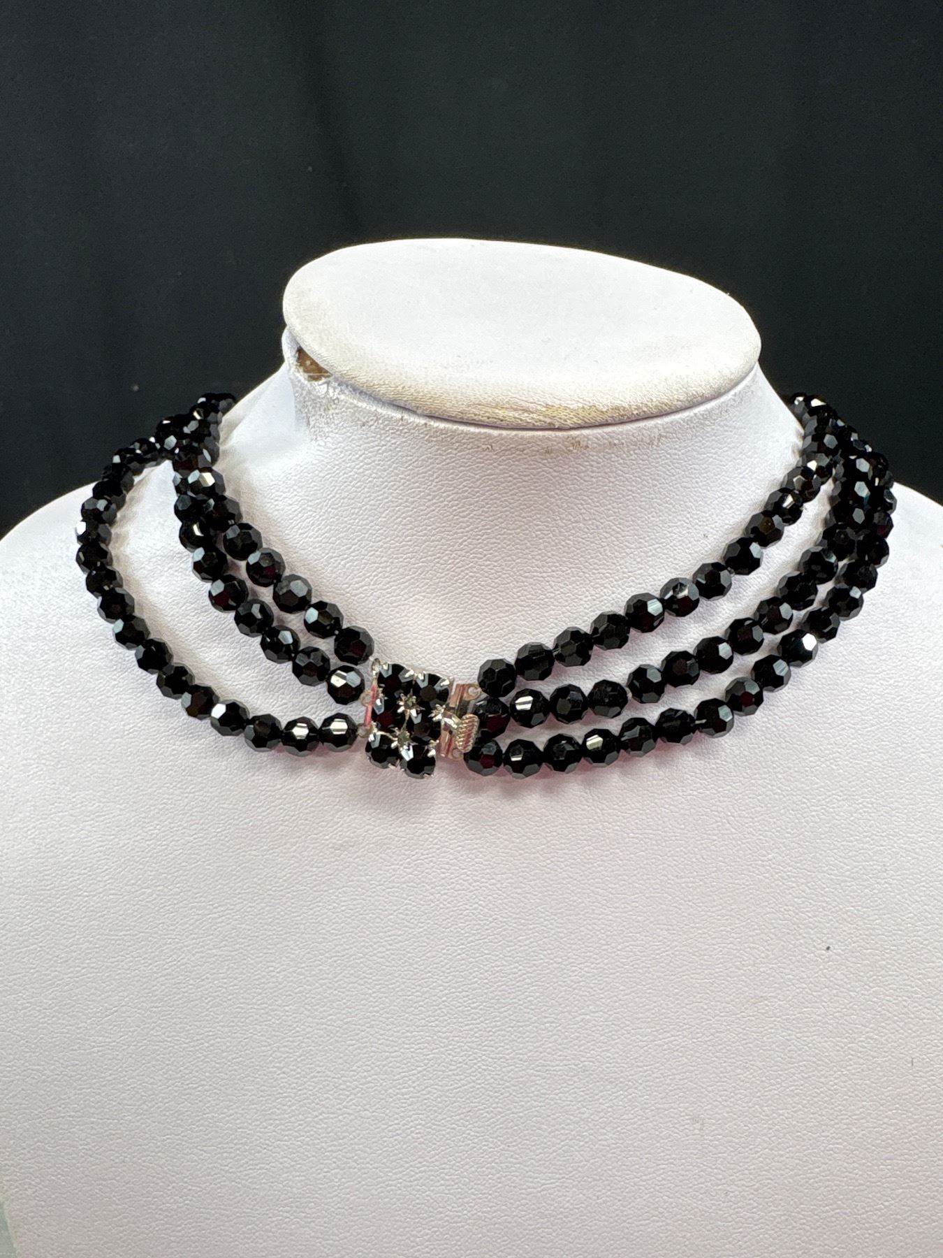 Vintage Triple Stand Blackfaceted Glass Necklace With Silver Tone Clasp