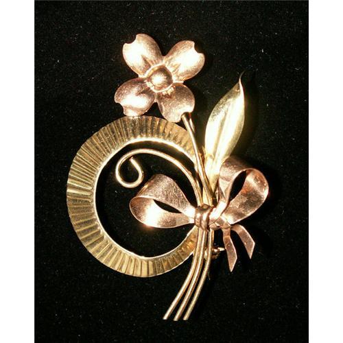 This 1950?s flower pin is an attractive combination of rose and yellow gold. The flower?s head and the bow are both rose gold, while the circle, flower stems and leaf is yellow. It weighs a total of 3.6 grams and is almost 2? long and 1 ½? wide. It is stamped 10K and Trueart on the back. This delicate-looking piece of jewelry has survived nearly six decades without a ding, dent or scratch.