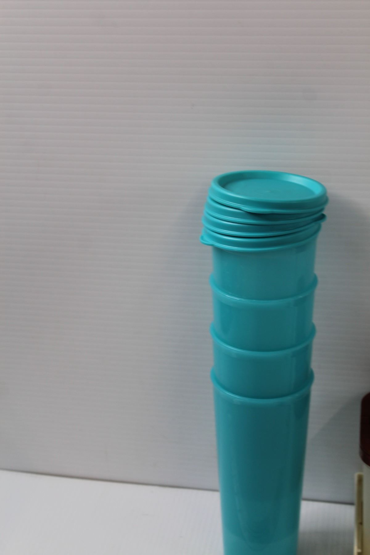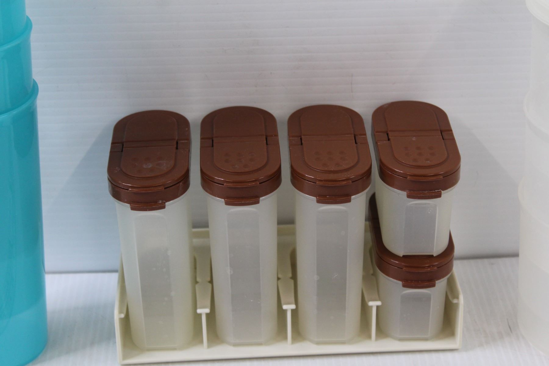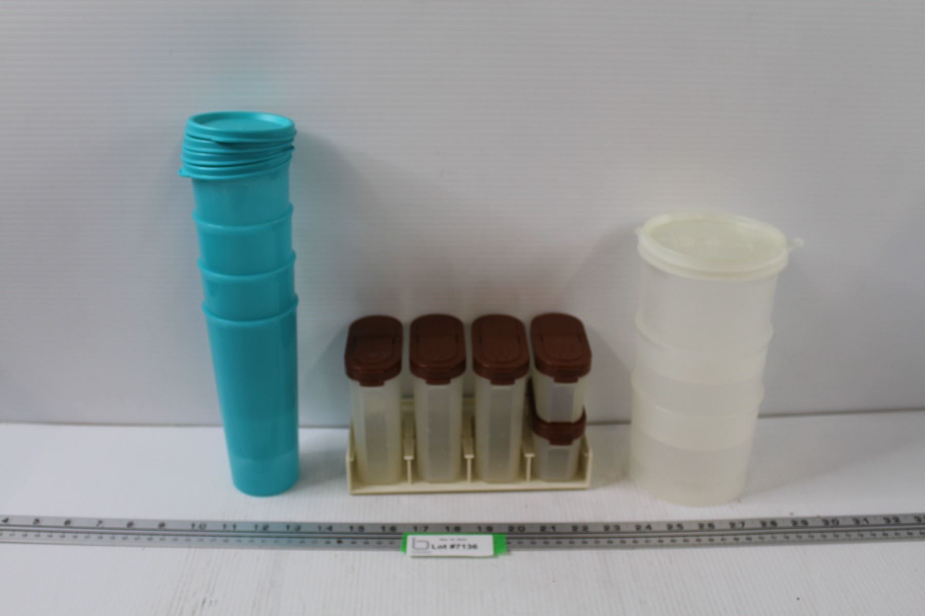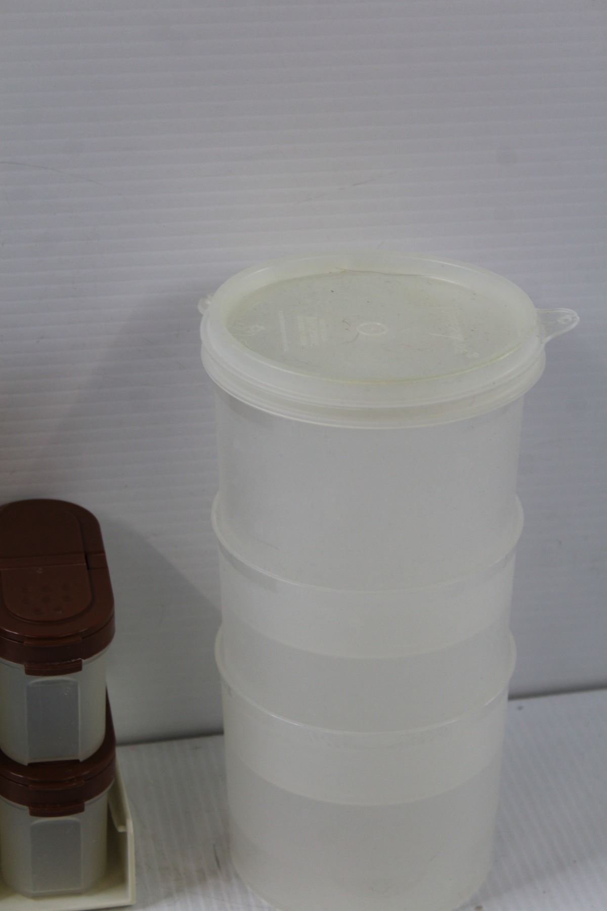 Vintage Tupperware Dishes: (4) Cups w/Lids, Spice Rack, (3) Clear Stacking (One Lid Missing) - as is