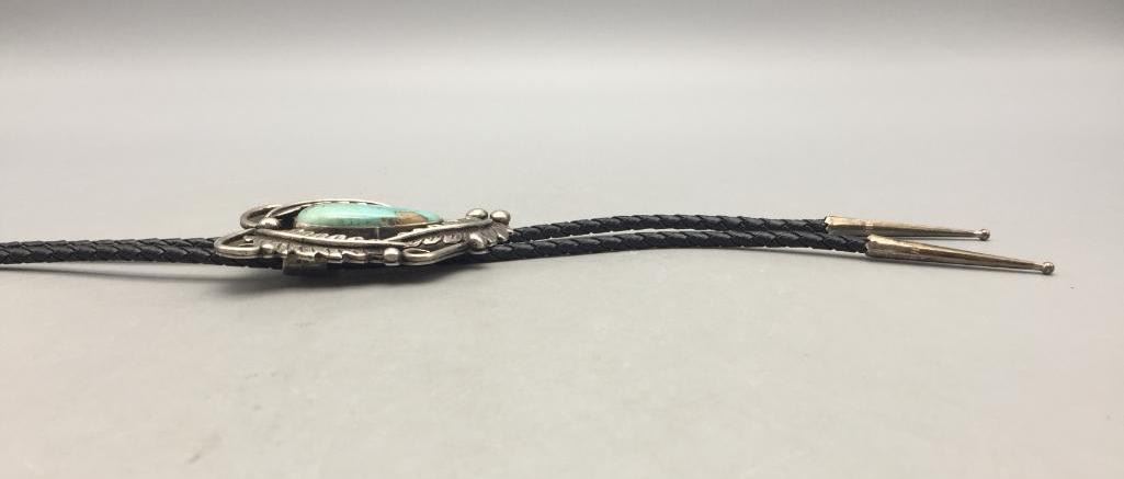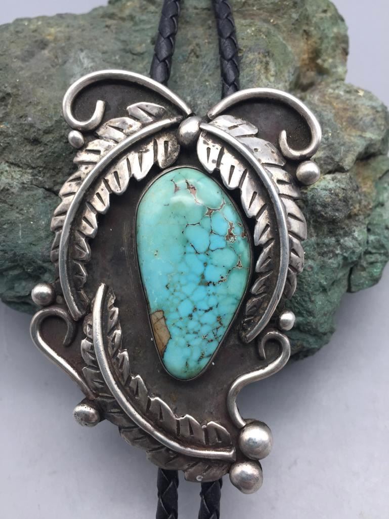 Description: Presented for sale in this lot is a vintage turquoise bolo, set with a great turquoise stone. It has a lot of silver leaf applique and drops accenting the piece. Maker: Unmarked. Approx. Age: Vintage. Size: Braided cord measures 38 inches long. Slide measures 3 inches long X 1-7/8 inches wide. Weighs 67.3 grams. Condition: Good for its age, normal wear expected. Please look closely at the pictures - they are an important part of our description. Shipping: There will be a $5 handling / packaging fee for shipping this lot. The actual cost of postage will be added on top of that.