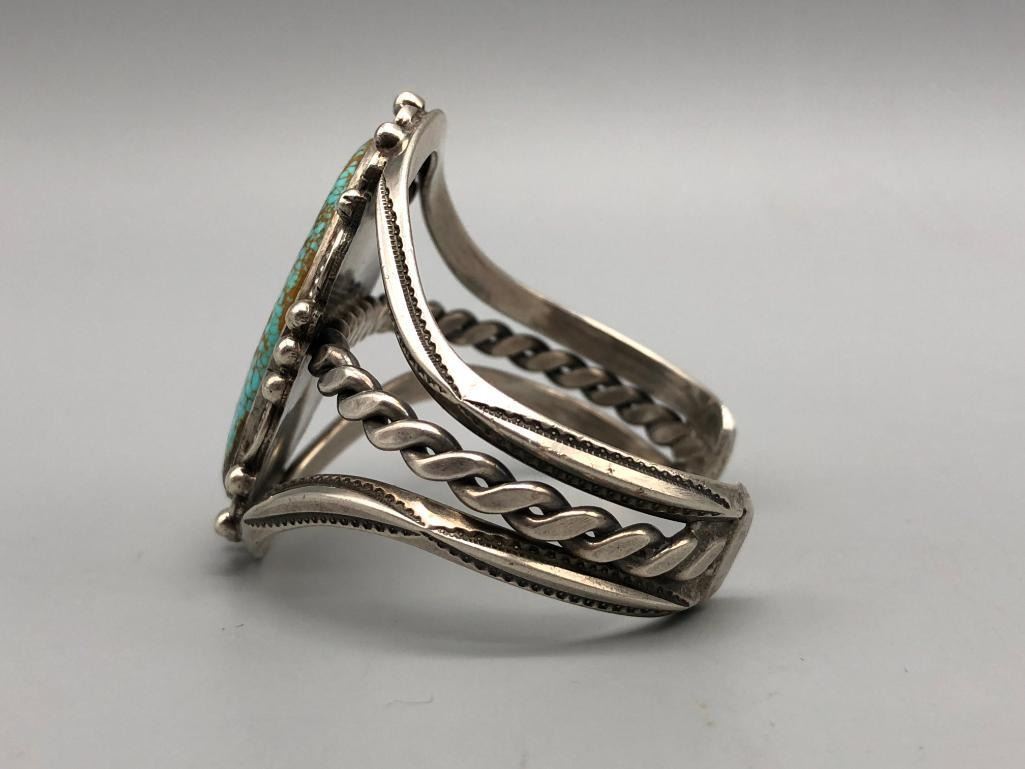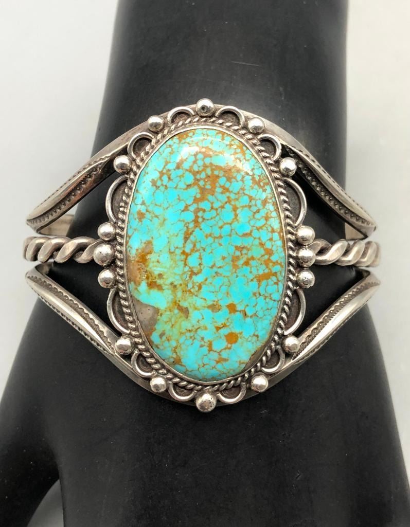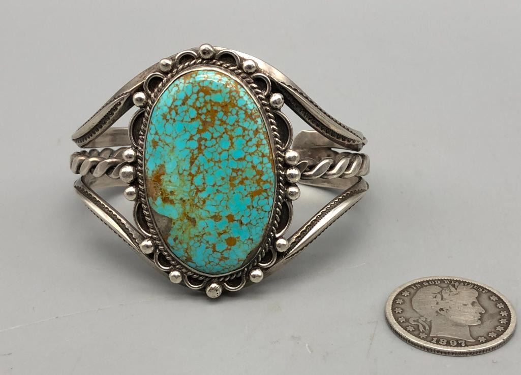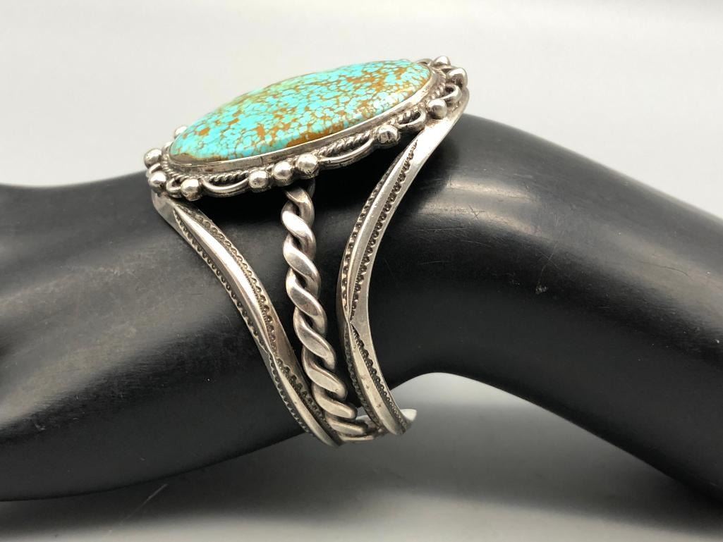 Up for consideration is this vintage turquoise bracelet with gorgeous turquoise. This is a fancy bracelet set with a great stone which is surrounded with silver dots, hand stamped designs and silver wire giving it a scalloped look. It is a on three wire cuff with the center wire being twisted and is made from sterling silver. MAKER: Unmarked. APPROX AGE: Vintage. SIZE: Inside circumference measures 5-1/8 inches long. Opening is an additional 1 inch, fitting a 6-1/8 inches long. Width is 1-7/8 inches. Weighs 49.4 grams. CONDITION: Good for its age, normal wear expected. Please look closely at the pictures as they are an important part of our description and are hereby incorporated into the description, specifically with regards to condition. SHIPPING: There will be a $5 handling / packaging fee for shipping this lot. The actual cost of postage will be added on top of that. BUY IT NOW: If you would like to buy this item now, without waiting for the auction day to bid on it, we do offer this option (which is available up to 48 hours before the actual auction starts). The “Buy it Now†price is the high estimate of this lot (plus applicable fees and the Buyer's premium is discounted to 10% when using the Buy it Now option). If you would like to exercise this option, you must contact us by email (or phone as long as you talk to someone live). Reference this lot number and your intention to "Buy it Now."