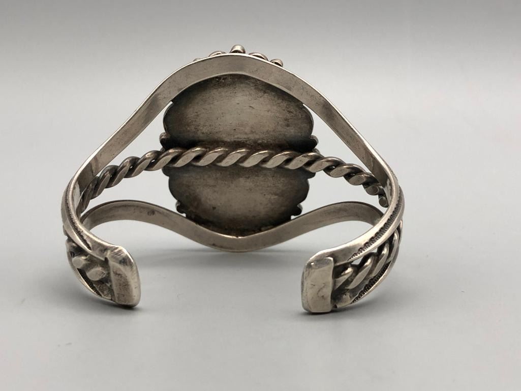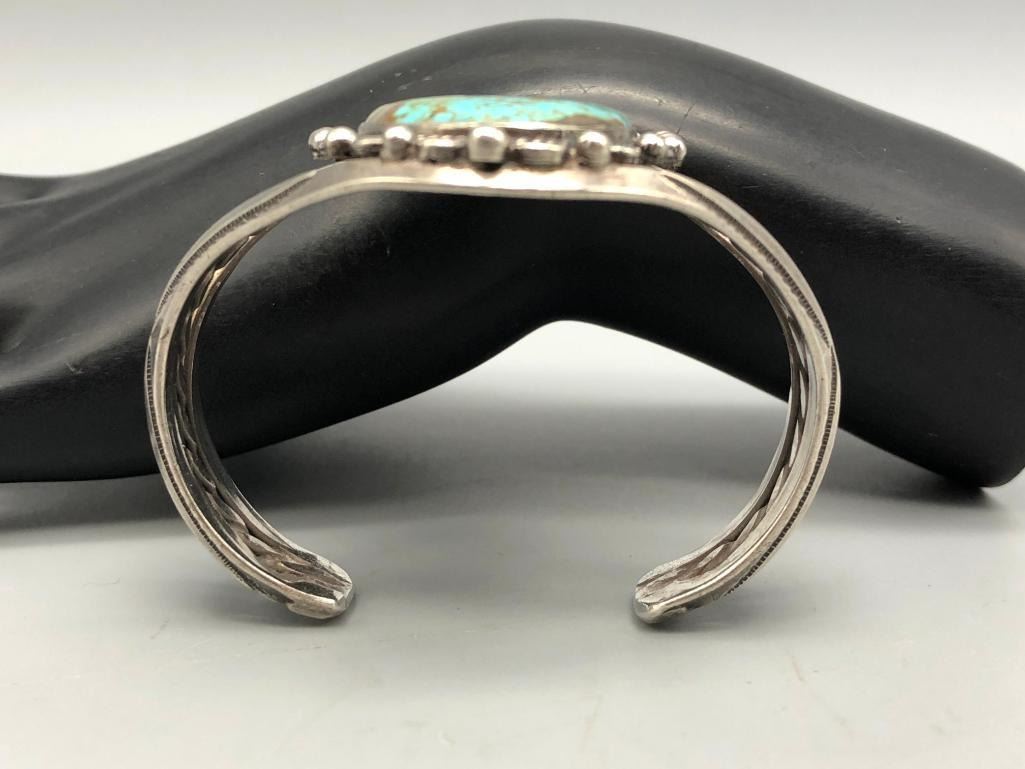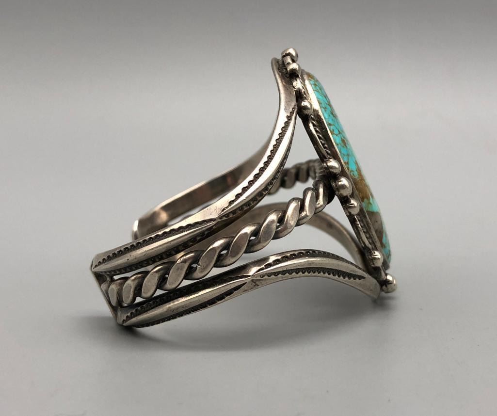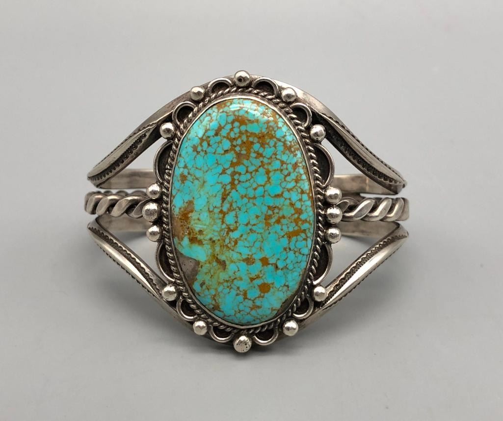 Up for consideration is this vintage turquoise bracelet with gorgeous turquoise. This is a fancy bracelet set with a great stone which is surrounded with silver dots, hand stamped designs and silver wire giving it a scalloped look. It is a on three wire cuff with the center wire being twisted and is made from sterling silver. MAKER: Unmarked. APPROX AGE: Vintage. SIZE: Inside circumference measures 5-1/8 inches long. Opening is an additional 1 inch, fitting a 6-1/8 inches long. Width is 1-7/8 inches. Weighs 49.4 grams. CONDITION: Good for its age, normal wear expected. Please look closely at the pictures as they are an important part of our description and are hereby incorporated into the description, specifically with regards to condition. SHIPPING: There will be a $5 handling / packaging fee for shipping this lot. The actual cost of postage will be added on top of that. BUY IT NOW: If you would like to buy this item now, without waiting for the auction day to bid on it, we do offer this option (which is available up to 48 hours before the actual auction starts). The “Buy it Now†price is the high estimate of this lot (plus applicable fees and the Buyer's premium is discounted to 10% when using the Buy it Now option). If you would like to exercise this option, you must contact us by email (or phone as long as you talk to someone live). Reference this lot number and your intention to "Buy it Now."
