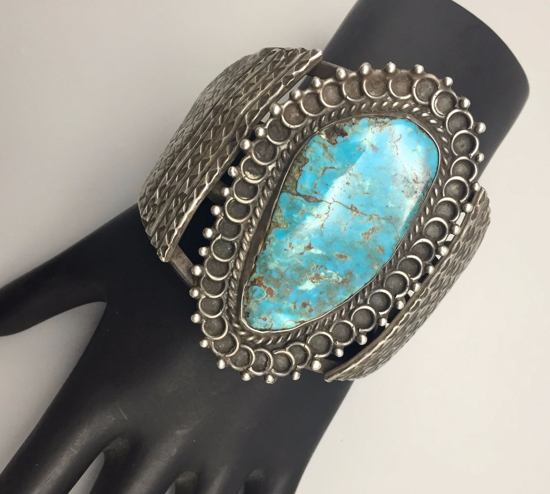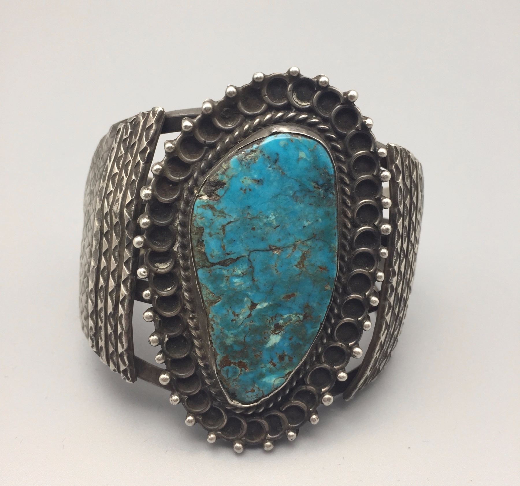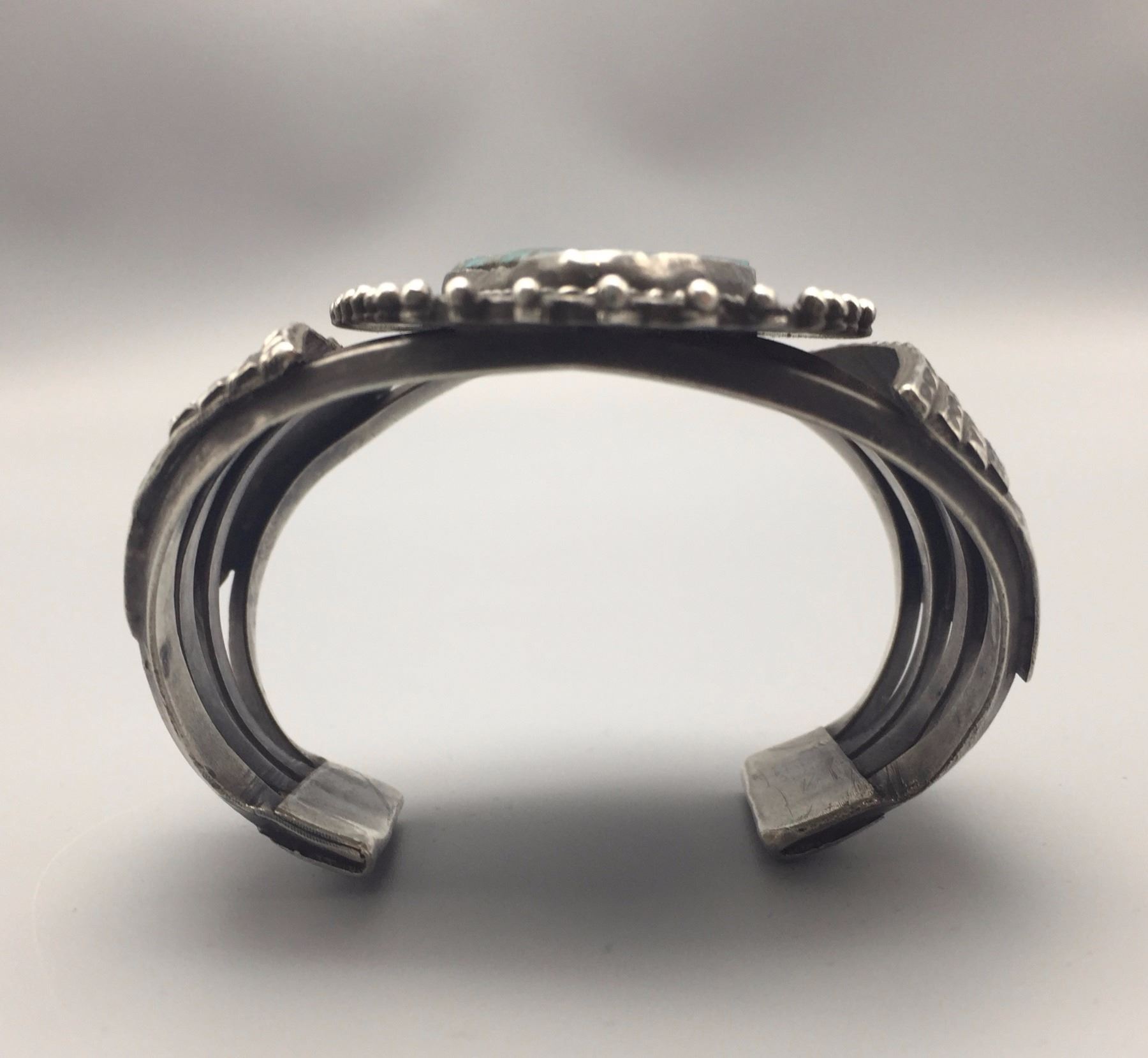 Maker: Unmarked, but mid-century Navajo in style. Approx. Age: Vintage. Size: Inside circumference measures 5 3/8” with an additional 1 1/4” opening (making it fit an approx. 6 5/8” wrist), 2 5/8” w and weighs 94.7 g. Additional Info: Vintage sterling silver turquoise bracelet. Condition: Good, normal wear expected. Turquoise has a small hairline fracture. Please look closely at the pictures - they are an important part of our description. Shipping: There will be a $5 handling / packaging fee for shipping this lot. The actual cost of postage will be added on top of that.
