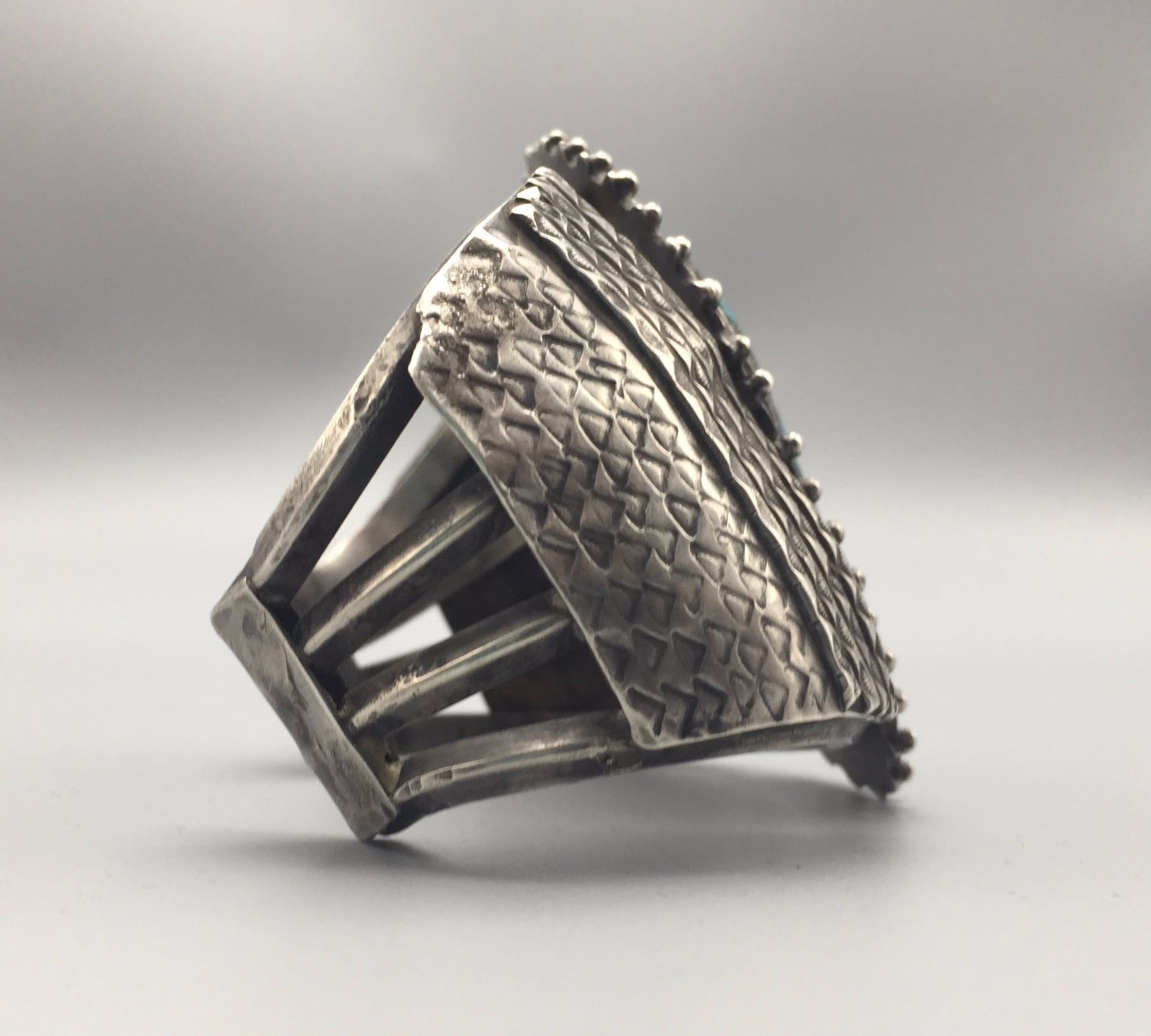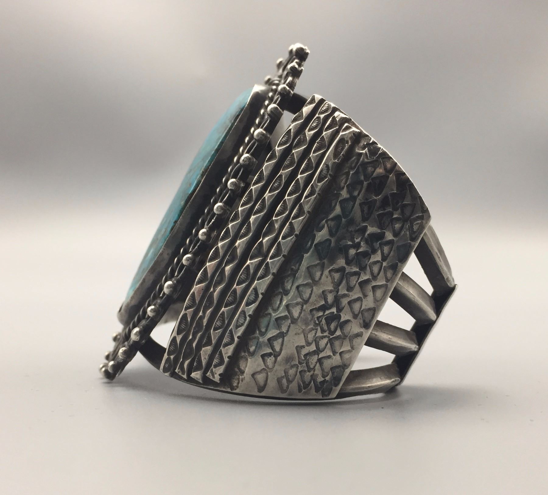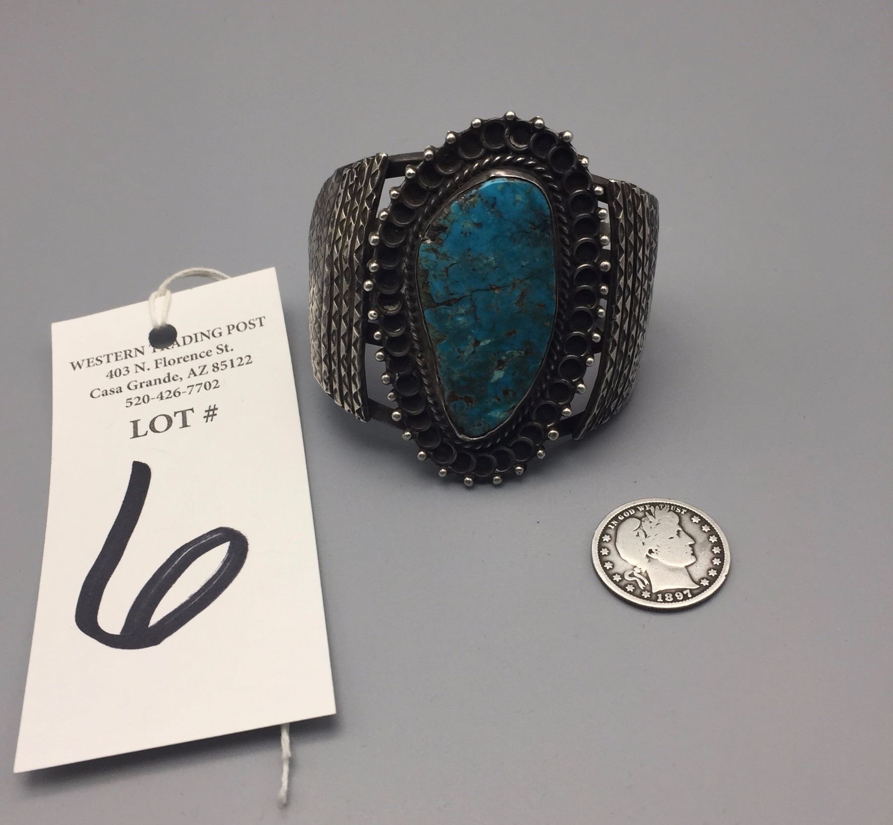 Maker: Unmarked, but mid-century Navajo in style. Approx. Age: Vintage. Size: Inside circumference measures 5 3/8” with an additional 1 1/4” opening (making it fit an approx. 6 5/8” wrist), 2 5/8” w and weighs 94.7 g. Additional Info: Vintage sterling silver turquoise bracelet. Condition: Good, normal wear expected. Turquoise has a small hairline fracture. Please look closely at the pictures - they are an important part of our description. Shipping: There will be a $5 handling / packaging fee for shipping this lot. The actual cost of postage will be added on top of that.