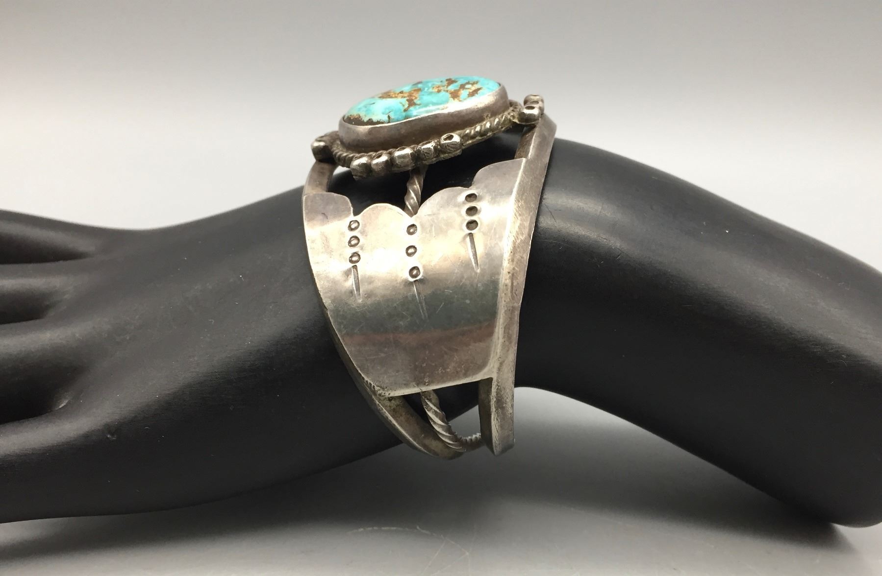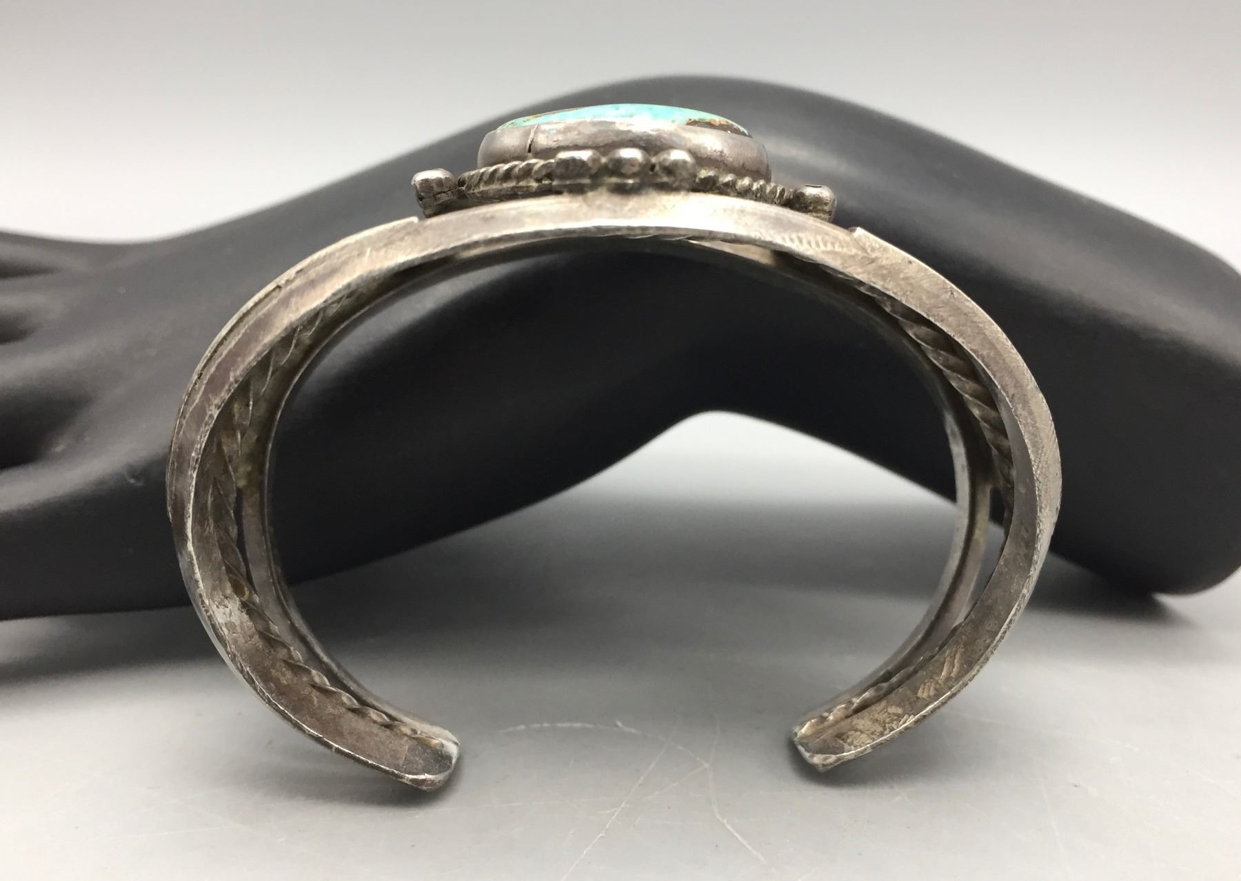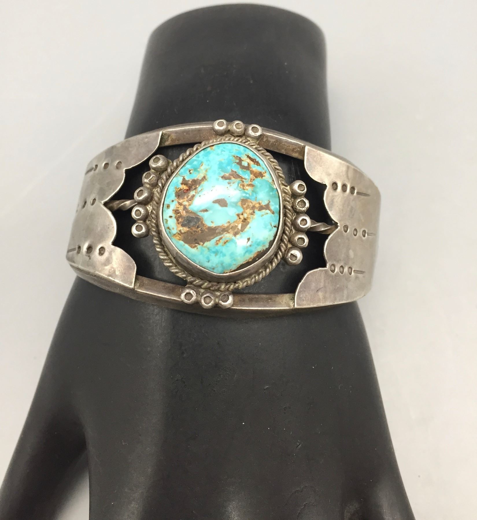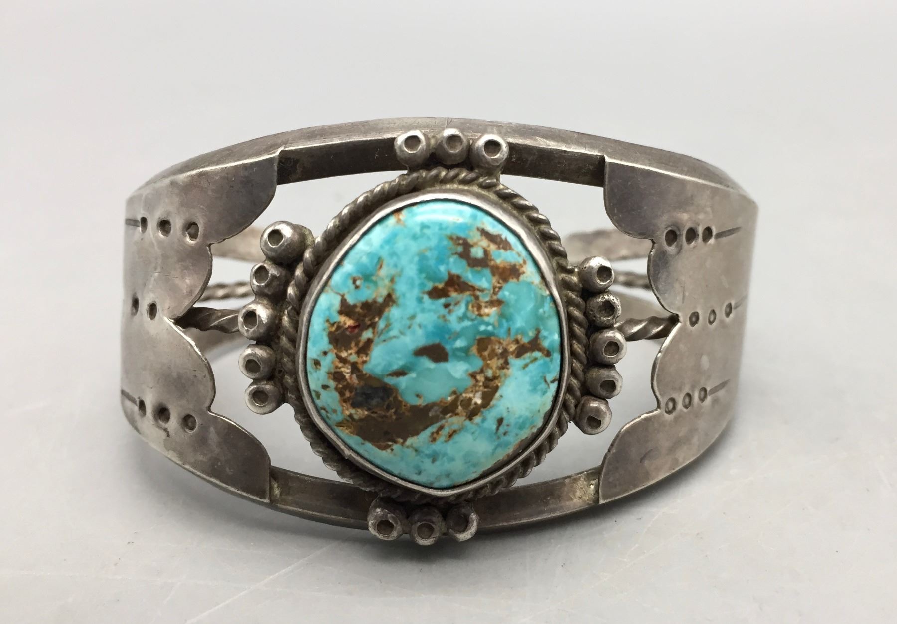 Description: Offered in this lot is a vintage bracelet featuring a single turquoise cabochon surrounded by hand crafted sterling silver. Maker: No hallmark. Approx. Age: Vintage. Size: Measures 5-3/8” with a 1” opening (fits a 6-3/8” wrist). Weighs 38.1 grams. Condition: Good for its age, normal wear expected. Please look closely at the pictures - they are an important part of our description. Shipping: There will be a $5 handling / packaging fee for shipping this lot. The actual cost of postage will be added on top of that.
