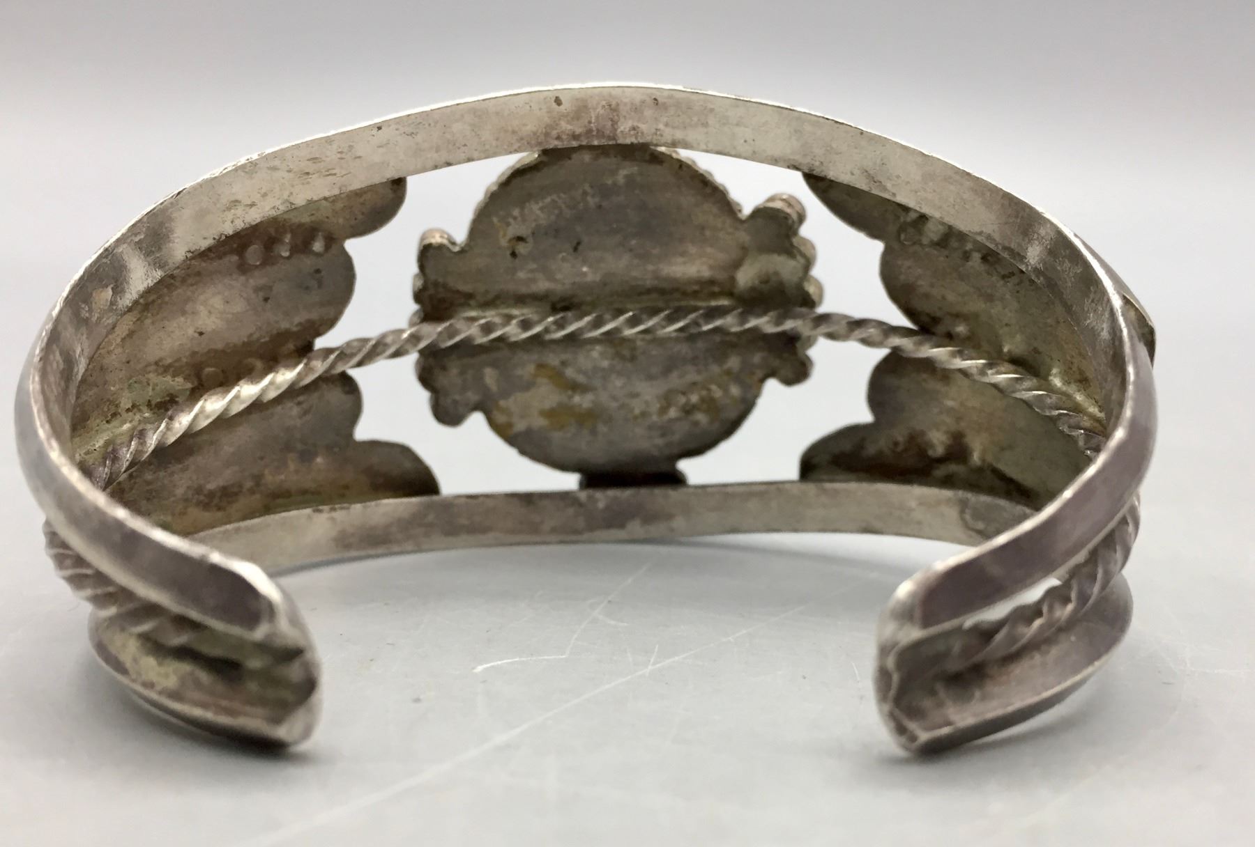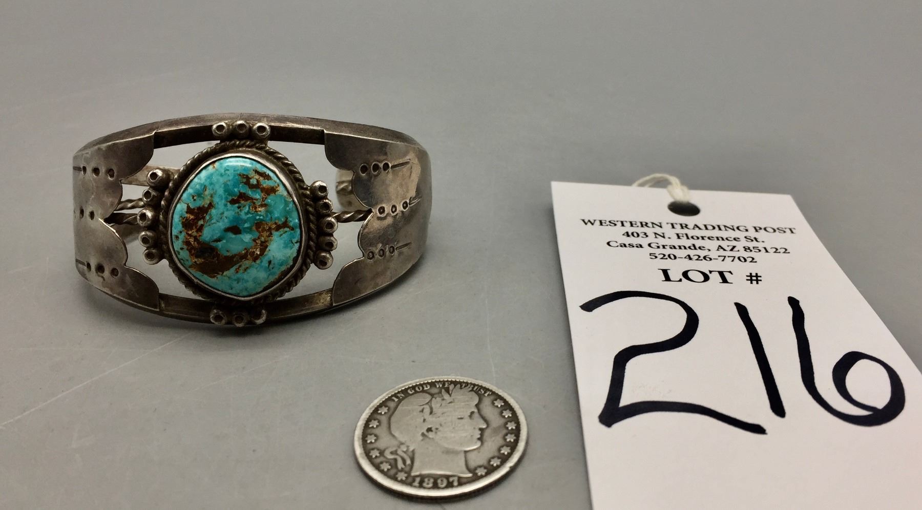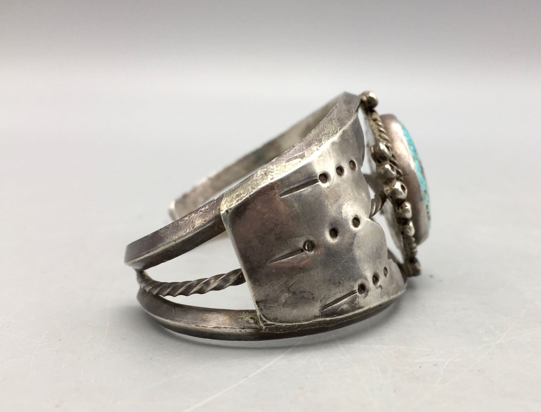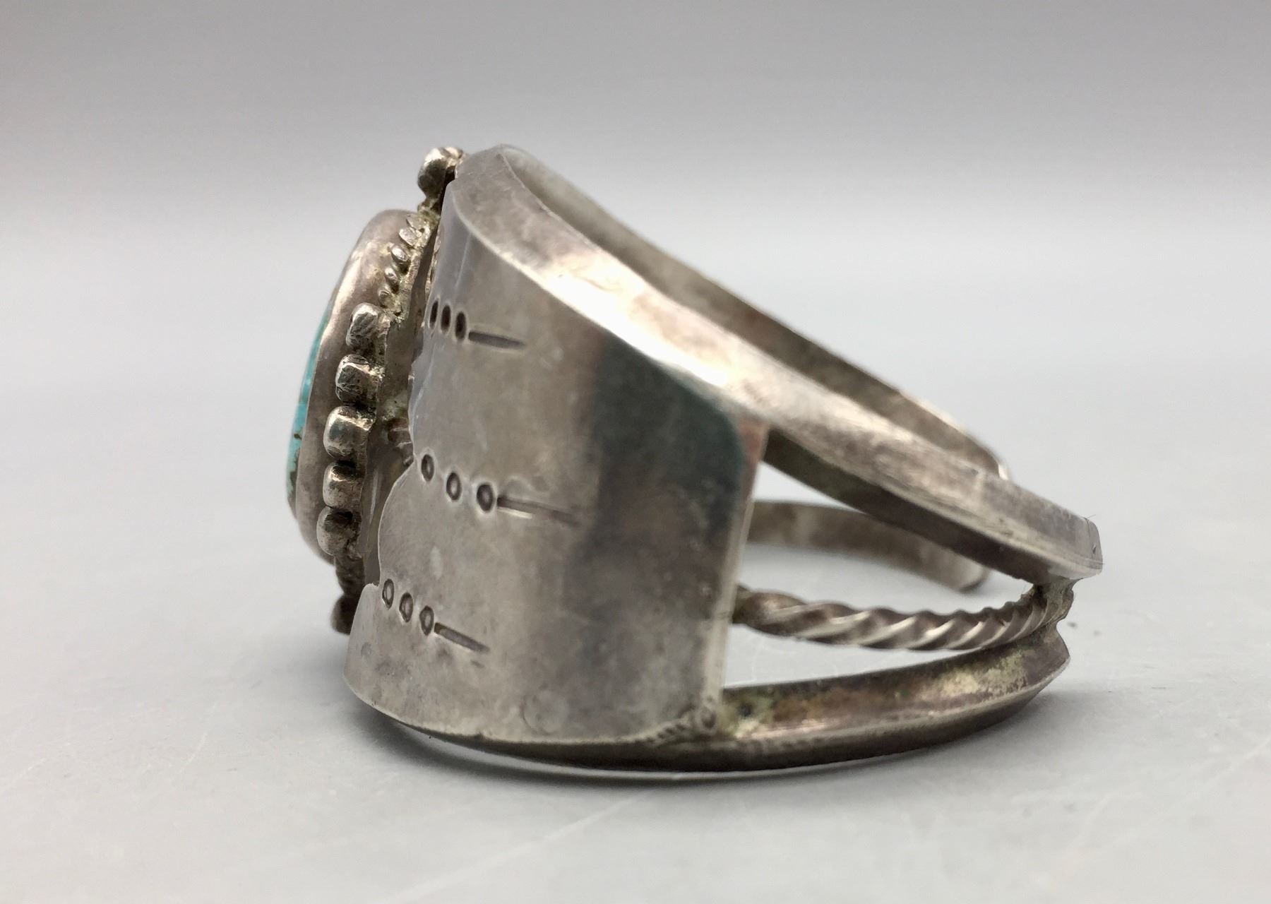 Description: Offered in this lot is a vintage bracelet featuring a single turquoise cabochon surrounded by hand crafted sterling silver. Maker: No hallmark. Approx. Age: Vintage. Size: Measures 5-3/8” with a 1” opening (fits a 6-3/8” wrist). Weighs 38.1 grams. Condition: Good for its age, normal wear expected. Please look closely at the pictures - they are an important part of our description. Shipping: There will be a $5 handling / packaging fee for shipping this lot. The actual cost of postage will be added on top of that.