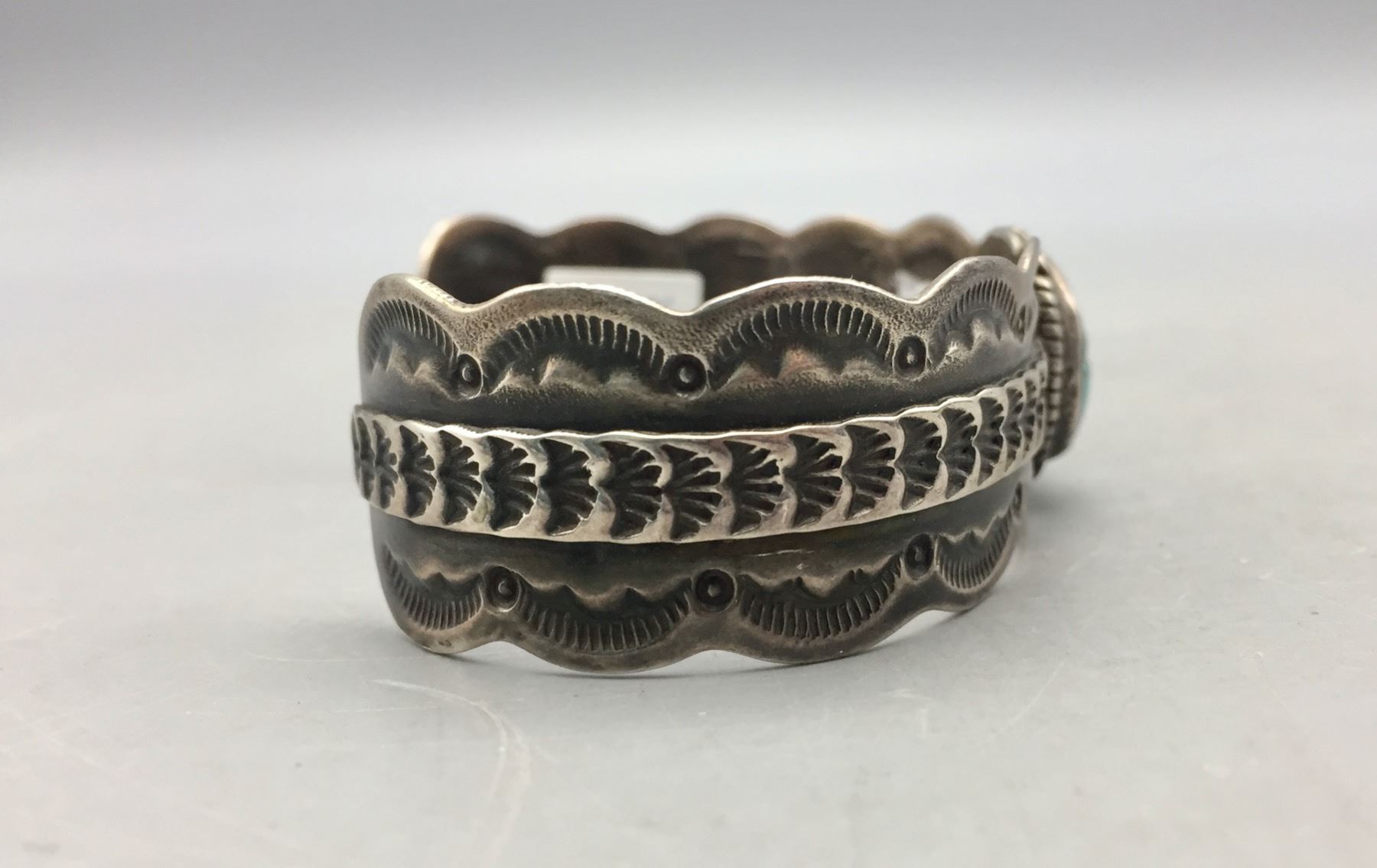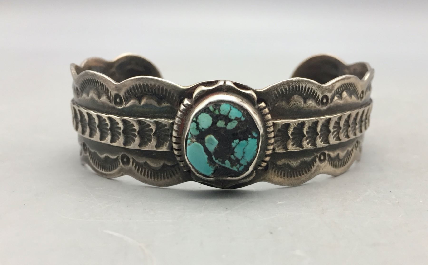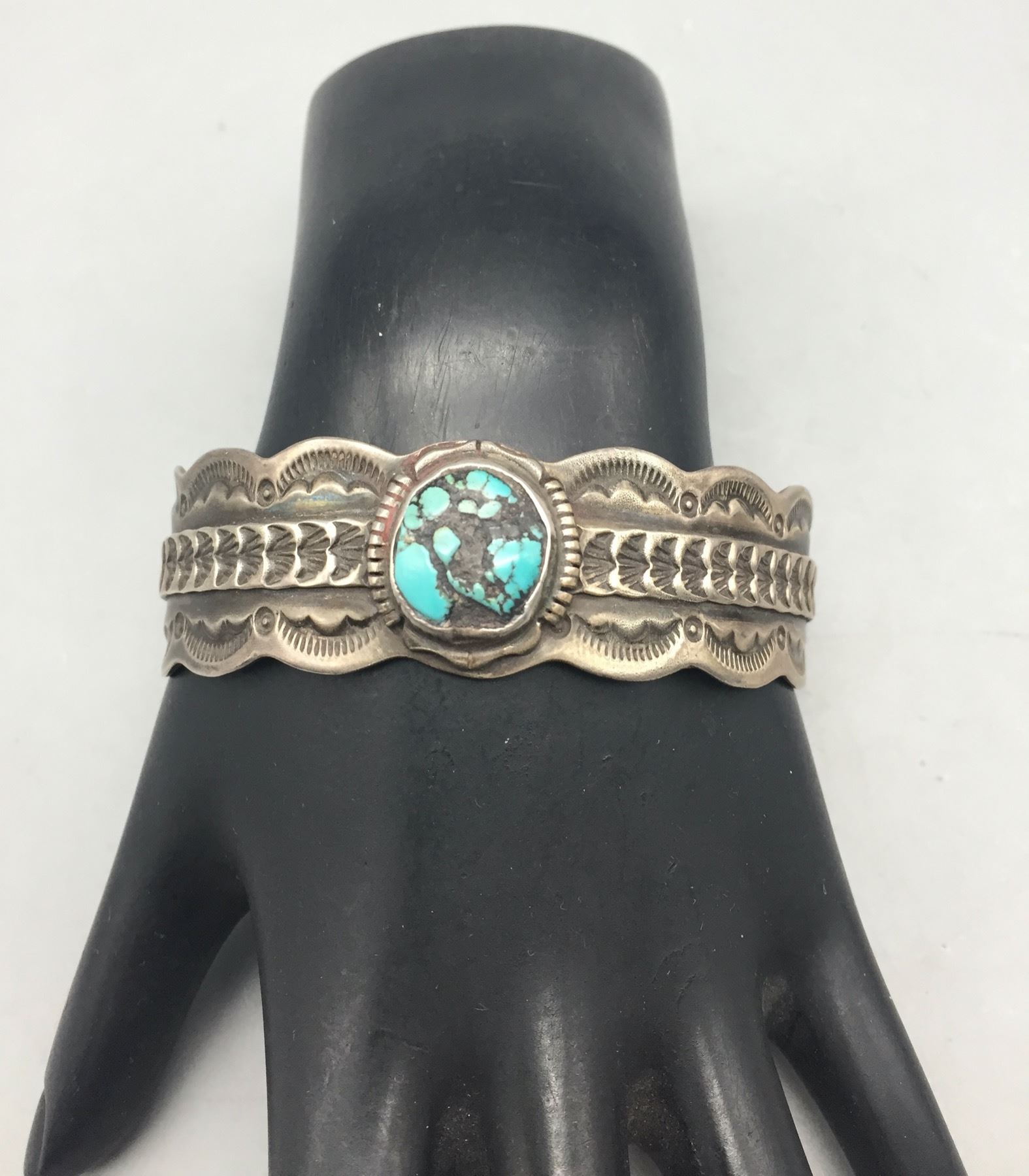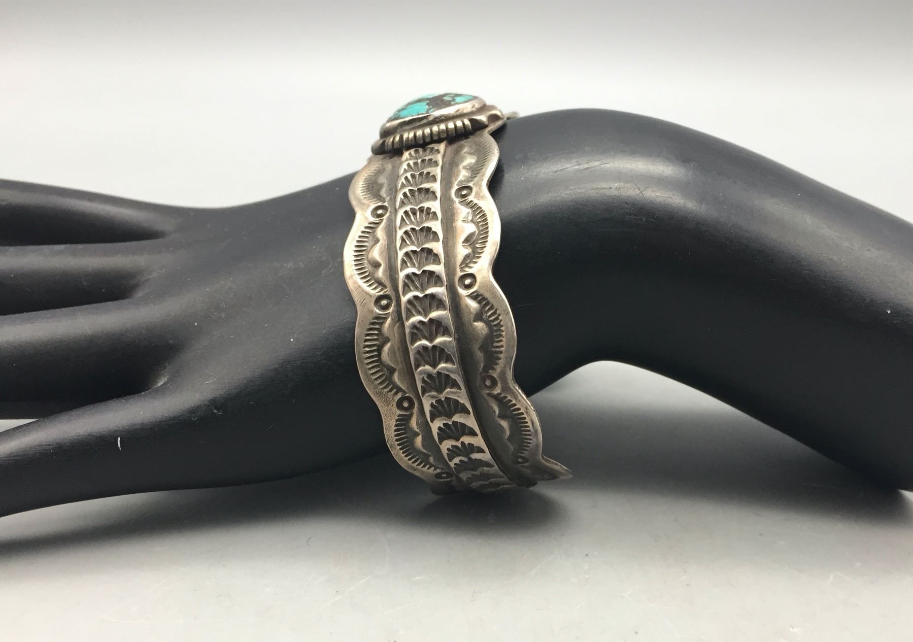 Description: For your consideration we offer for sale this bracelet featuring old turquoise stones and hand-stamped/hand-embellished silver work. Tested as Sterling Silver. Maker: Hallmarked with a design we were unable to identify, most likely Navajo. Approx. Age: Vintage (Circa 1970s). Size: Inside circumference measures 5 5/8 inches plus there is a 1 1/2 inch opening (making this bracelet fit a 7 1/8 inch wrist). It measures about 3/4 inch at its widest point. Weighs 38.7 g. Condition: Good for its age, normal wear expected. Please look closely at the pictures - they are an important part of our description. Shipping: There will be a $5 handling / packaging fee for shipping this lot. The actual cost of postage will be added on top of that.