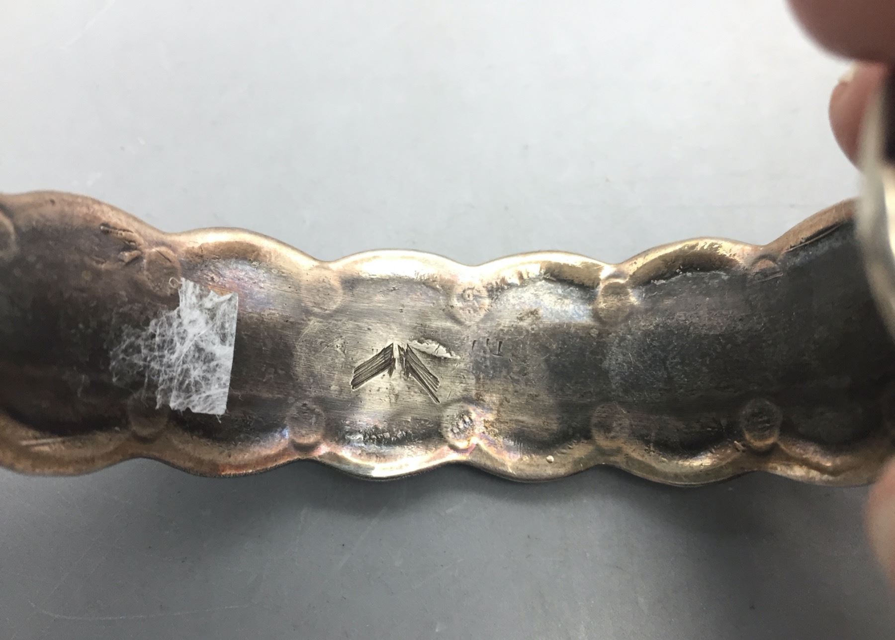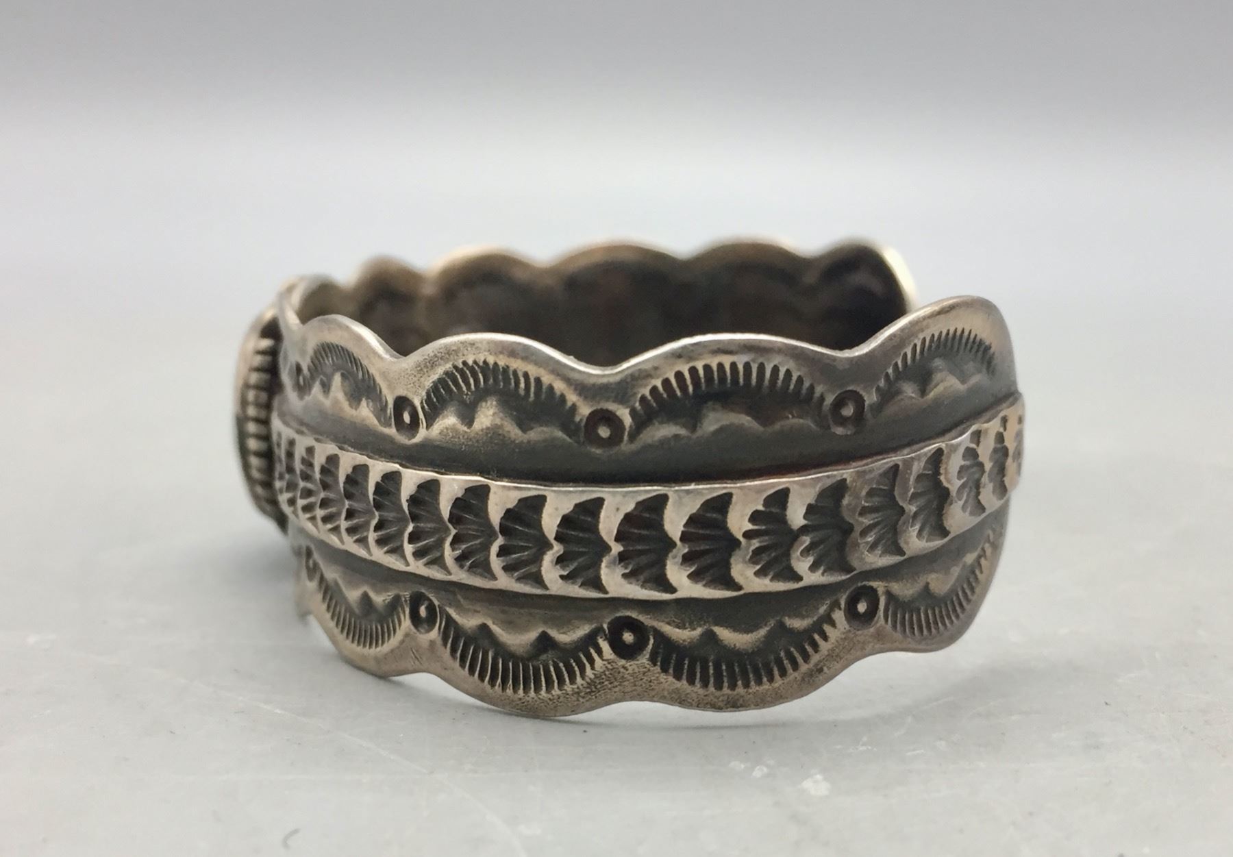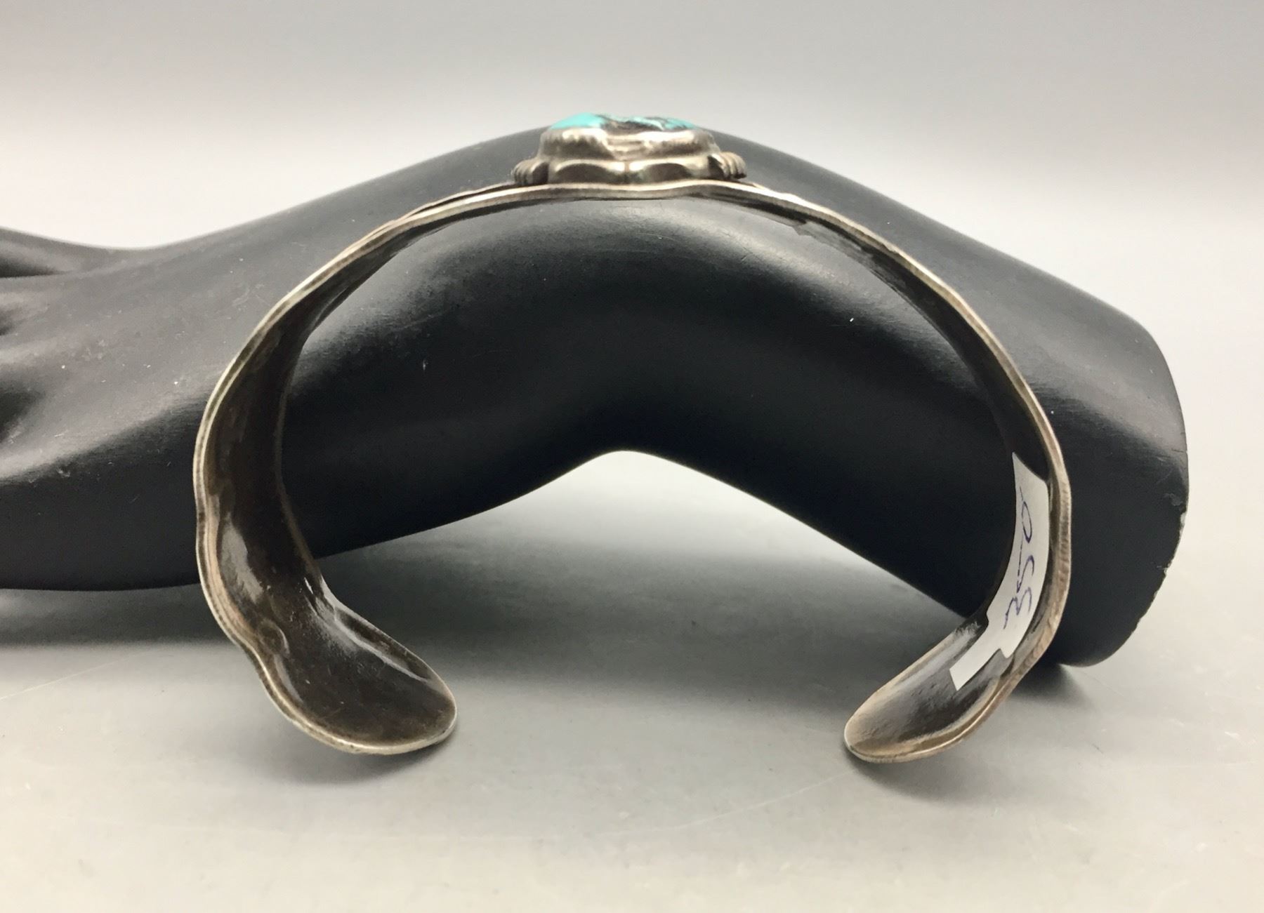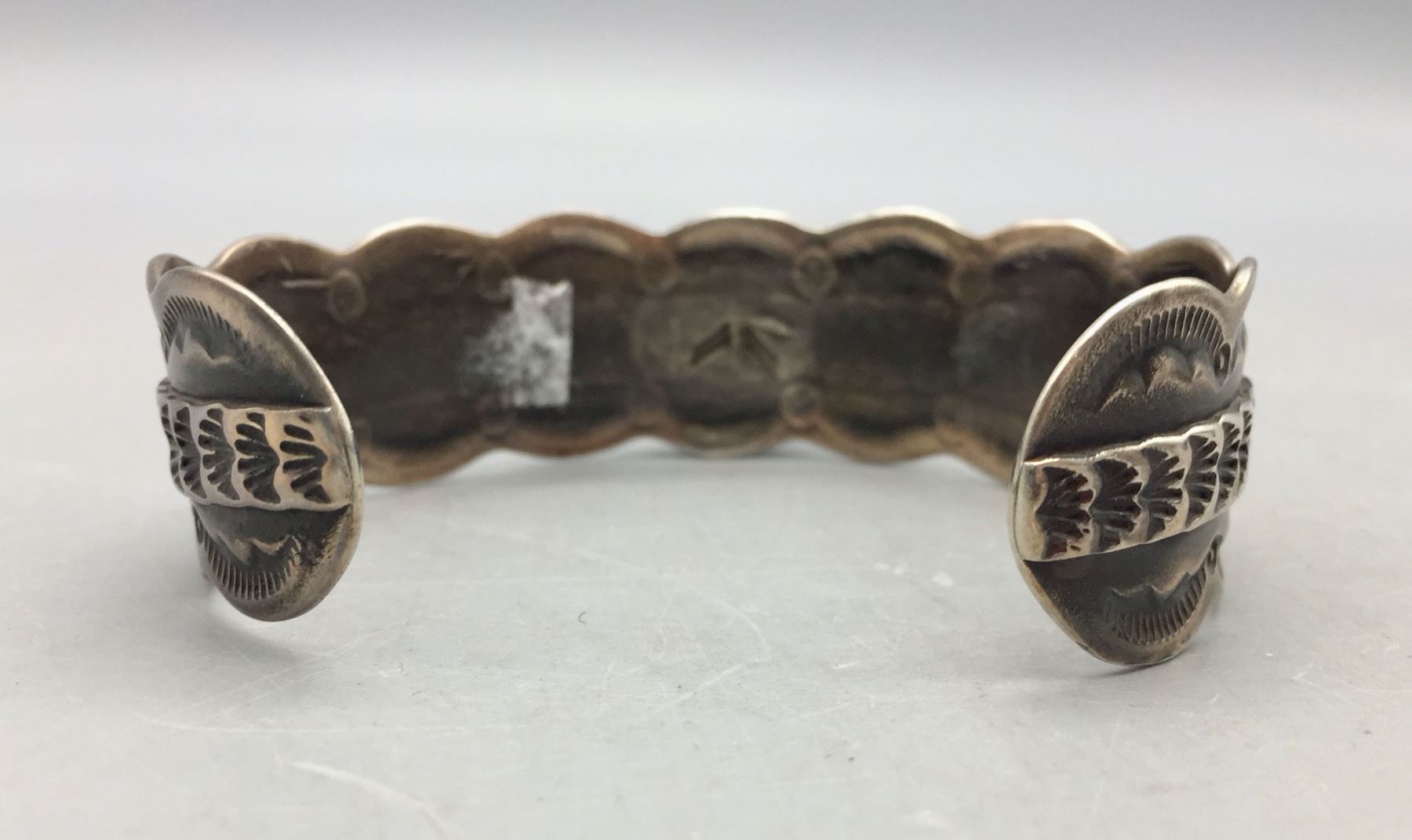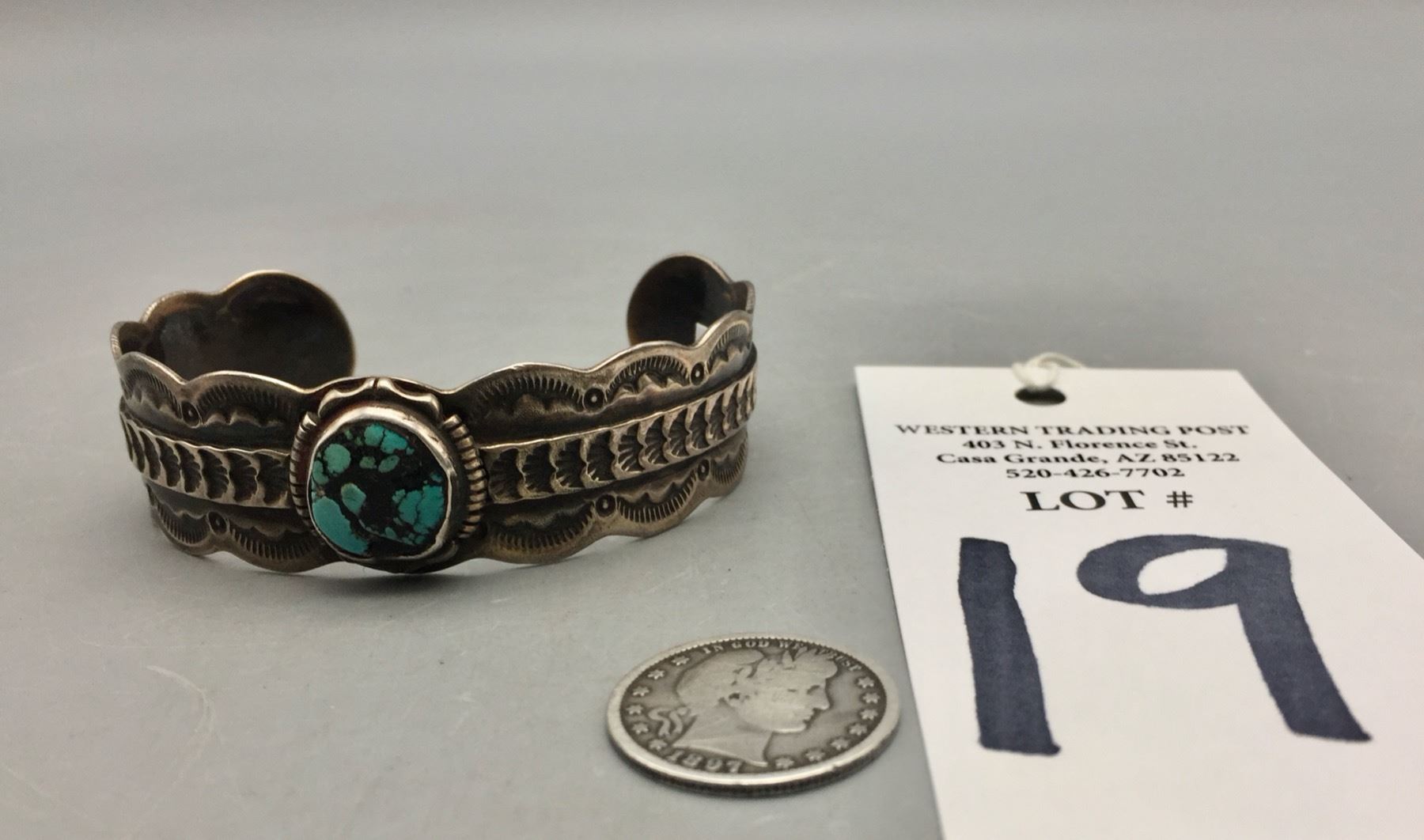 Description: For your consideration we offer for sale this bracelet featuring old turquoise stones and hand-stamped/hand-embellished silver work. Tested as Sterling Silver. Maker: Hallmarked with a design we were unable to identify, most likely Navajo. Approx. Age: Vintage (Circa 1970s). Size: Inside circumference measures 5 5/8 inches plus there is a 1 1/2 inch opening (making this bracelet fit a 7 1/8 inch wrist). It measures about 3/4 inch at its widest point. Weighs 38.7 g. Condition: Good for its age, normal wear expected. Please look closely at the pictures - they are an important part of our description. Shipping: There will be a $5 handling / packaging fee for shipping this lot. The actual cost of postage will be added on top of that.