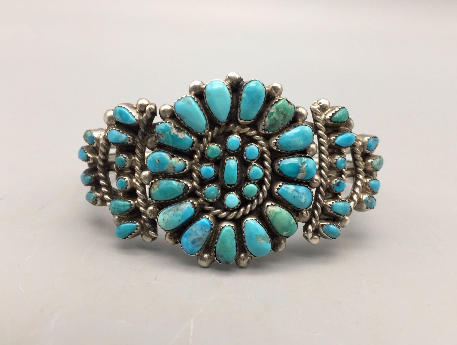 Description: Turquoise and sterling silver cluster style bracelet. Maker: No hallmark, unknown. Approx. Age: Vintage. Size: Inside circumference measures approx. 5 3/8“ with a 7/8” gap (making this bracelet fit about a 6 1/4” wrist). It is 1 1/4” wide across the face and weighs 31.0 g. Condition: Good for its age, normal wear expected. Please look closely at the pictures - they are an important part of our description. Shipping: There will be a $5 handling / packaging fee for shipping this lot. The actual cost of postage will be added on top of that.