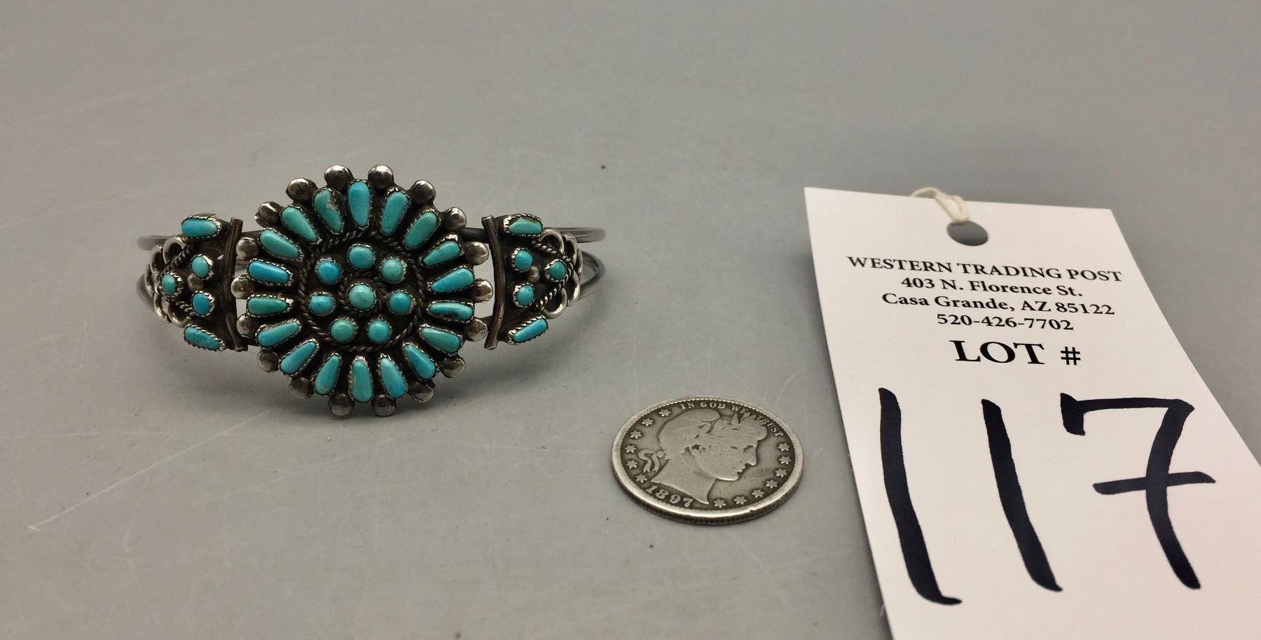Description: For sale in this lot is a very nice, vintage, turquoise cluster bracelet surrounded by hand crafted sterling silver. Maker: No hallmark. Approx. Age: Vintage. Size: Measures 5-1/2” with a 1-1/2” opening (fits a 7” wrist). 1-3/8” wide at widest point. Weighs 21.5 grams. Condition: Good for its age, normal wear expected. Please look closely at the pictures - they are an important part of our description. Shipping: There will be a $5 handling / packaging fee for shipping this lot. The actual cost of postage will be added on top of that.