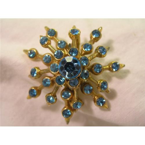 This brooch has rich colored turquoise color rhinestones in it. Is in a flower or star-burst shape. In very good condition.