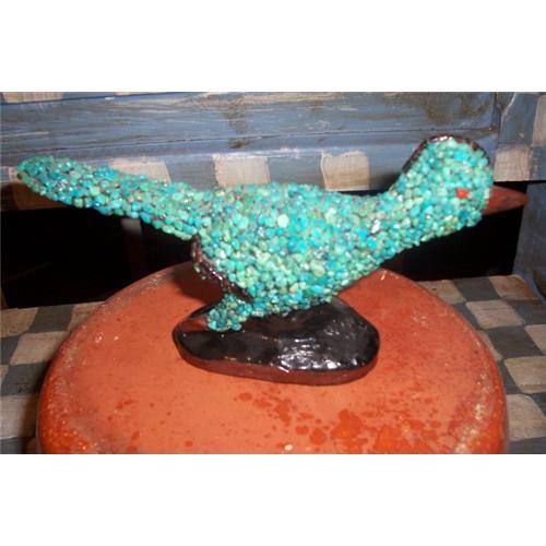 Unusual turqoise encrusted ceramic roadrunner, zuni made, hand painted. The elusive western roadrunner, has been prtrayed hundreds of different ways, this is the first turquoise encrusted one I have seen. The turquoise is in small nuggets, not crumbles, and covers the roadrunner, except for feet, and bill, and a few pieces of heishi for the markings on the birs. In very good condition, no missing nuggets, no chips. The roadrunner measures 3 inches high, and 8 inches long. Thank you for shopping in the Land of Enchantment!