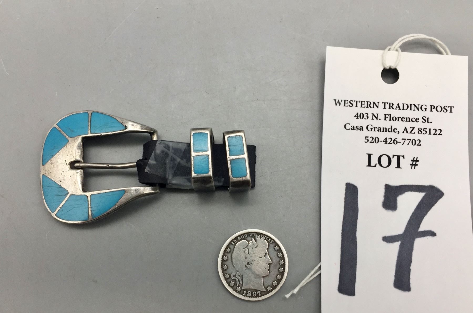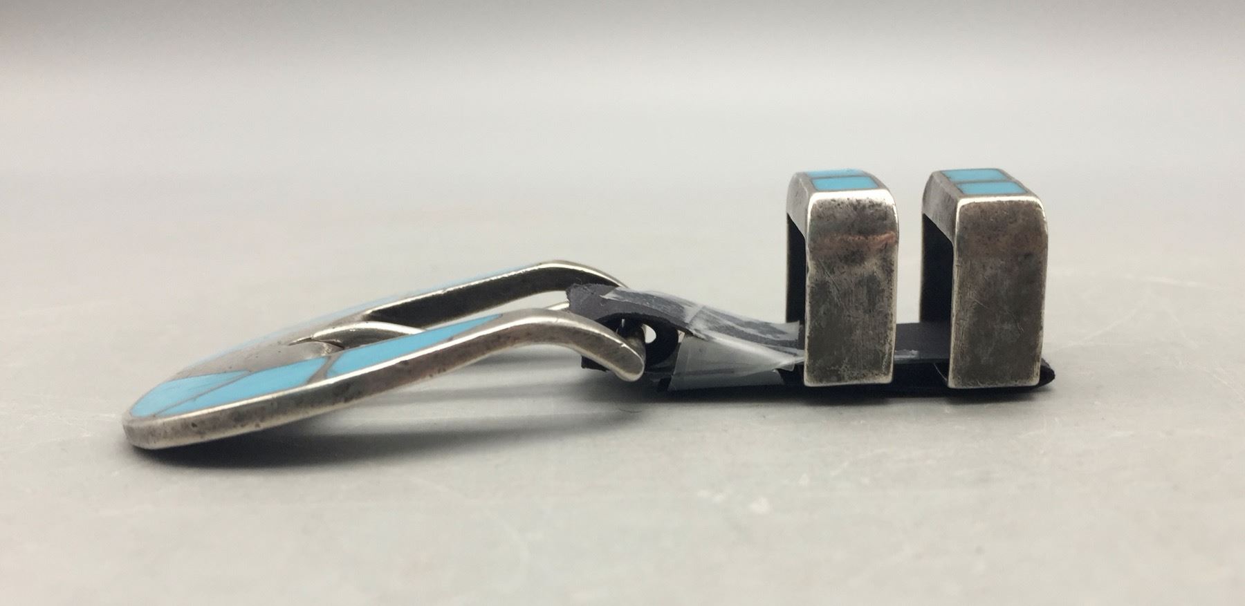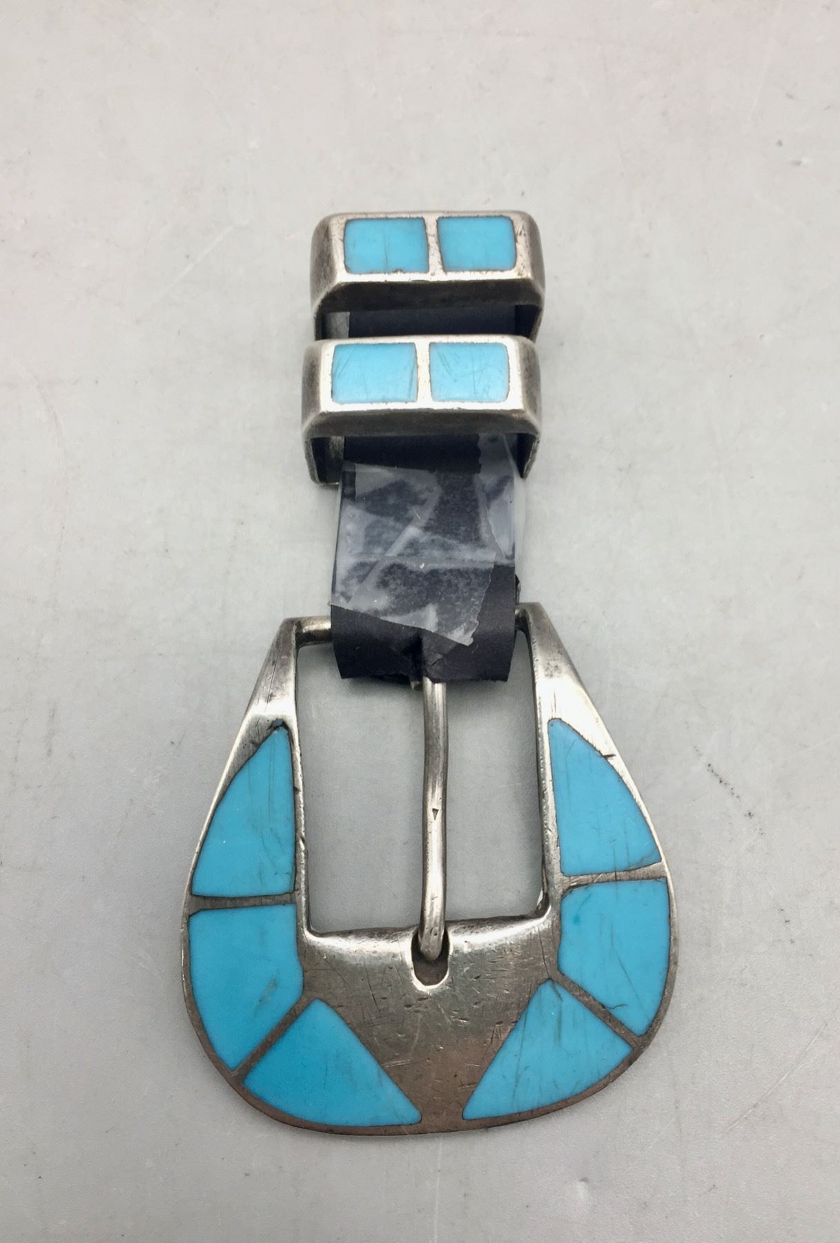 Description: Presented in this lot is a vintage sterling silver belt buckle. This belt buckle is Zuni inlay style. This belt buckle was tested as being Sterling Silver. Maker: No hallmark as was common on Native jewelry made in the early 1970s and before, but it's most likely Zuni made. Approx. Age: Circa 1960’s. Size: Weighs 29 g. Overall width is 1 5/8 inches and almost 1 5/8 inches top to bottom. Fits a 3/4 inch belt or smaller. Nice size for anyone to wear. Condition: Good for its age, normal wear expected. Please look closely at the pictures - they are an important part of our description. Shipping: There will be a $5 handling / packaging fee for shipping this lot. The actual cost of postage will be added on top of that.