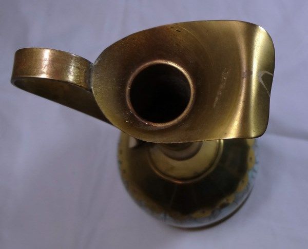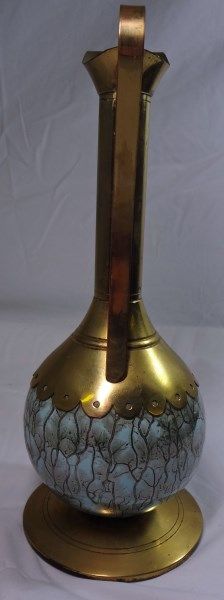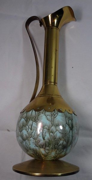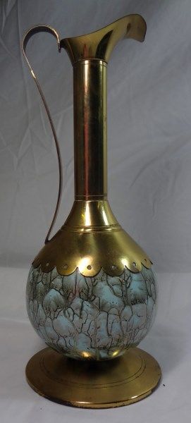 Beautiful aqua, turquoise marbled ceramic pitcher with high gloss finish with fitted brass spout and handle. Measures approx 11" high and 4" wide/