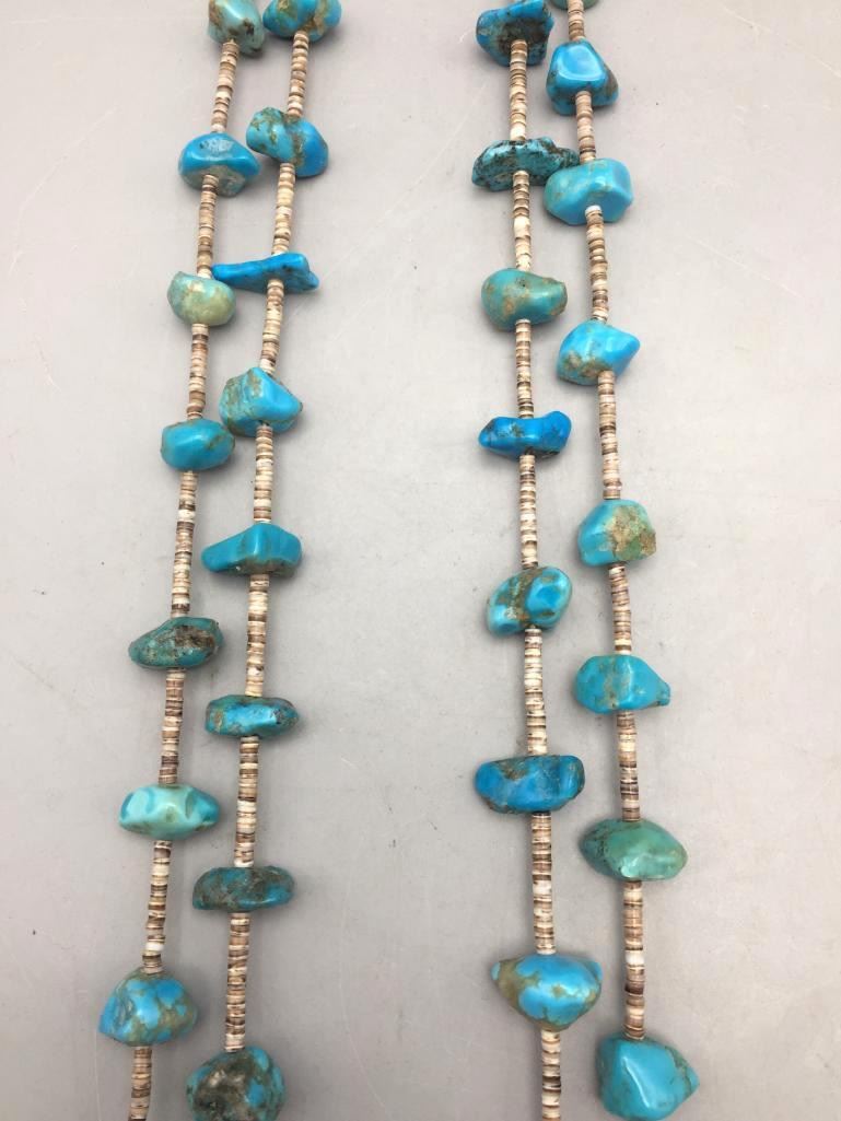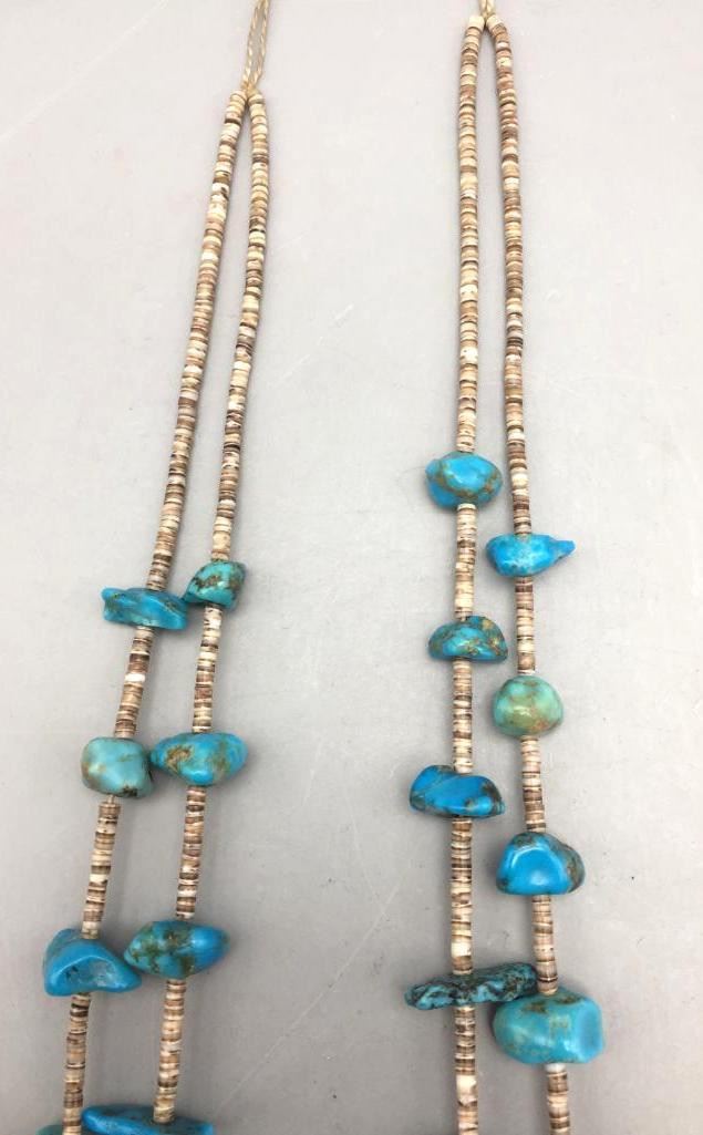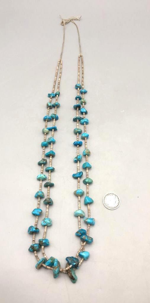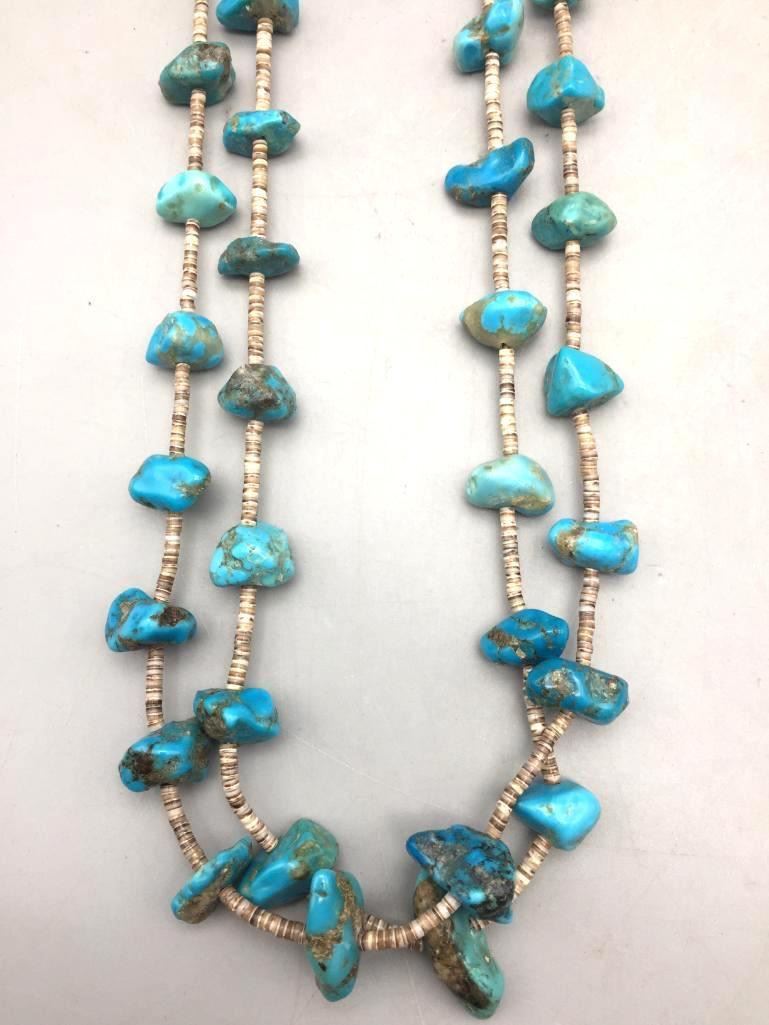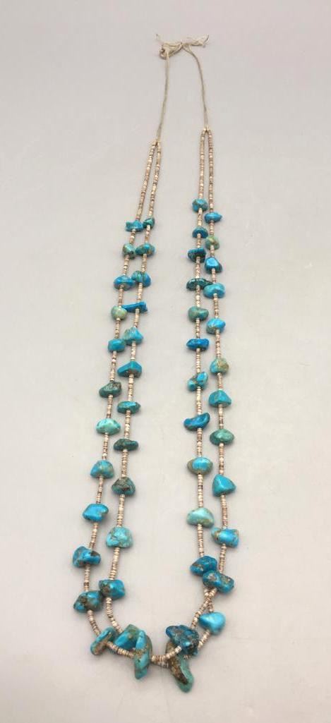 Presented for sale in this lot is a vintage turquoise necklace featuring nugget style turquoise and heishi. This necklace would be great for layering or wearing alone. Maker: Unmarked. Approx. Age: Vintage. Size: Fits a 38" neck. Weighs 88.6 grams. Condition: Good for its age, normal wear expected. Please look closely at the pictures - they are an important part of our description. Shipping: There will be a $5 handling, packaging fee for shipping this lot. The actual cost of postage will be added on top of that.