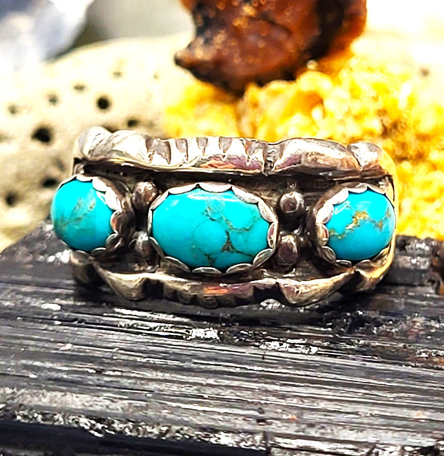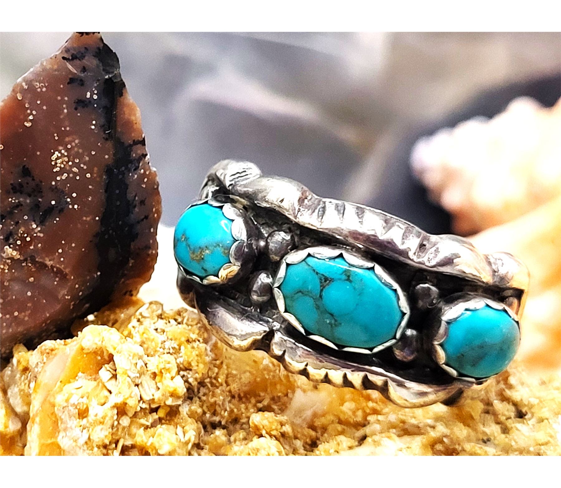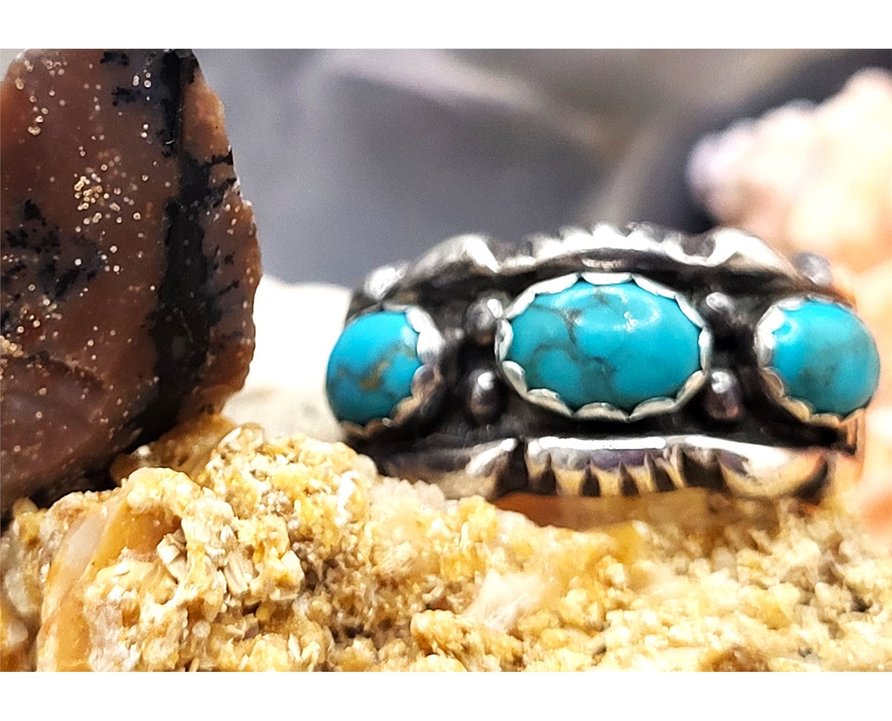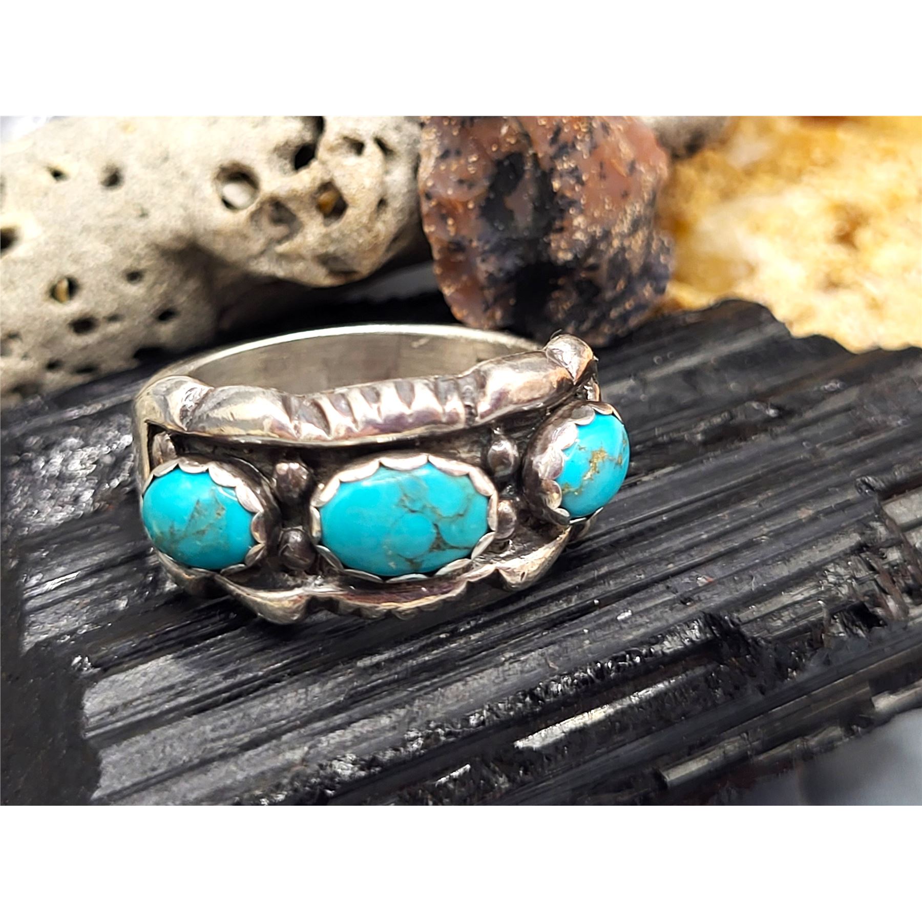 This sterling silver ring features three oval-shaped cabochons of blue turquoise with black matrix. The turquoise stones are bezel-set and measure 8x6mm (center) and 7x5mm. (2-outer) and are polished or stabilized. Black lacquer or india ink is applied in the recesses around the stones. The ring is 12mm wide and tapers to a 4mm shank and has a solid back. The ring bears a quality mark "STER." followed by a small "zia sun". It resembles Lawrence Dodge or Lewis Lomay. Admin Code: 12/hhh