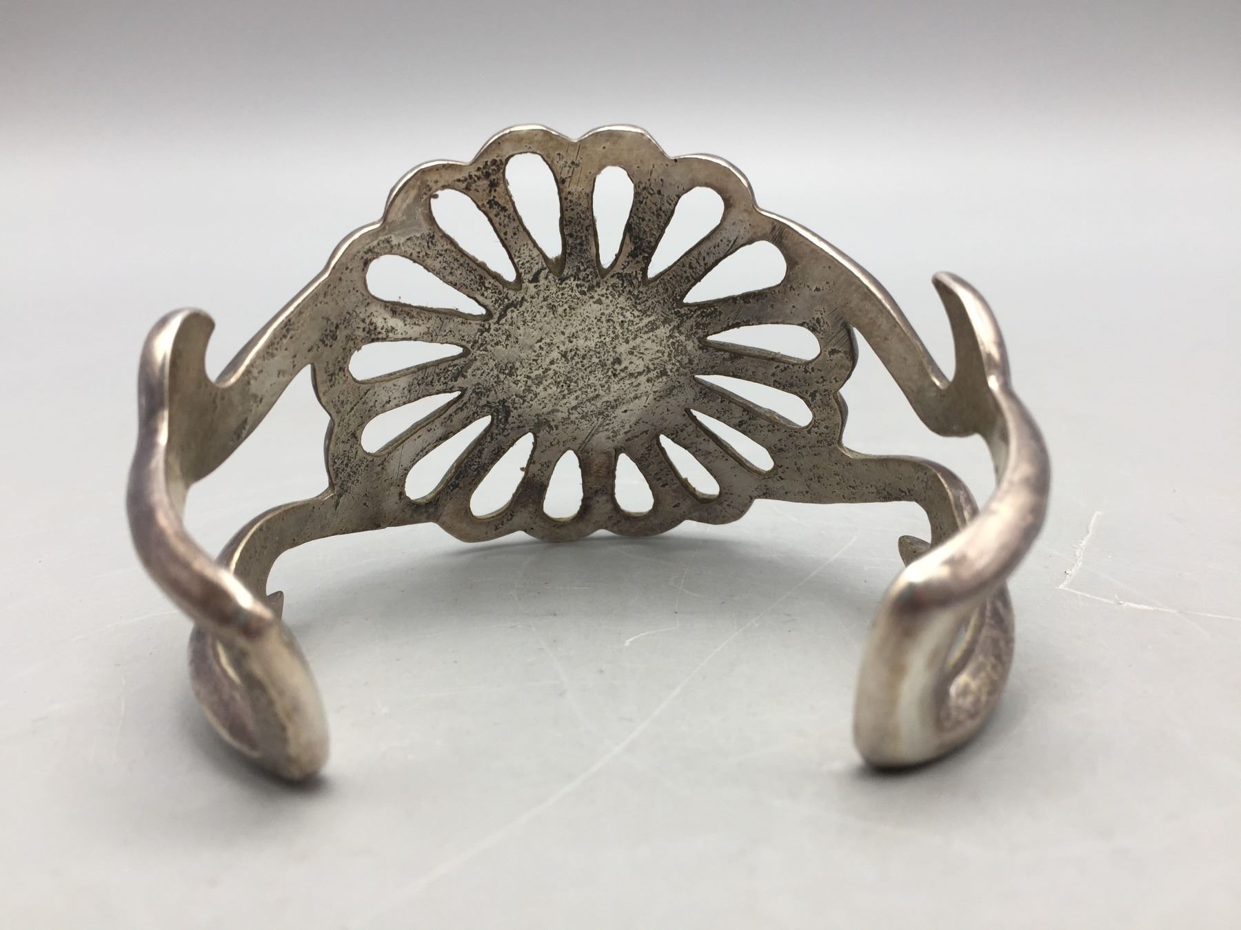 Description: A beautiful, vintage, Sandcast style cuff bracelet. Has a very nice turquoise cabochon in the center. Tested as sterling silver. Maker: There is no maker's hallmark. Approx. Age: Vintage (circa 1970s). Size: Inside circumference measures just under 5 3/8 inches plus there is a 1 3/8" gap (making this bracelet fit an approx. 6 3/4" wrist). It measures almost 1 3/4 inch at its widest point and weighs 65.7 g. Condition: Vintage, good for its age, normal wear expected. Please look closely at the pictures - they are an important part of our description. Shipping: There will be a $5 handling / packaging fee for shipping this lot. The actual cost of postage will be added on top of that.