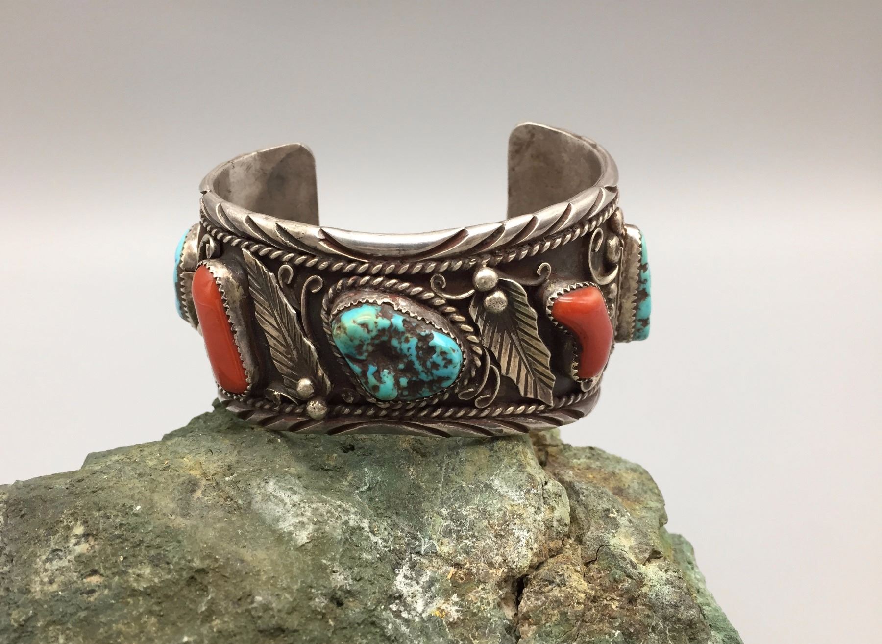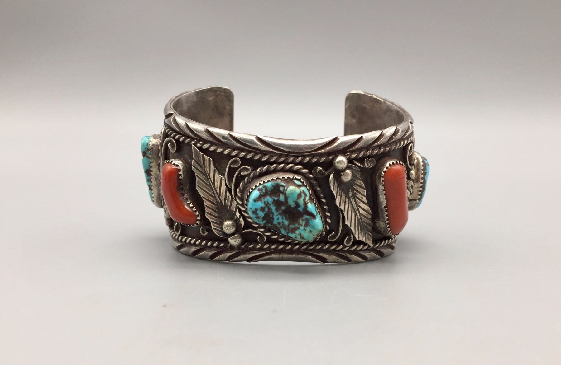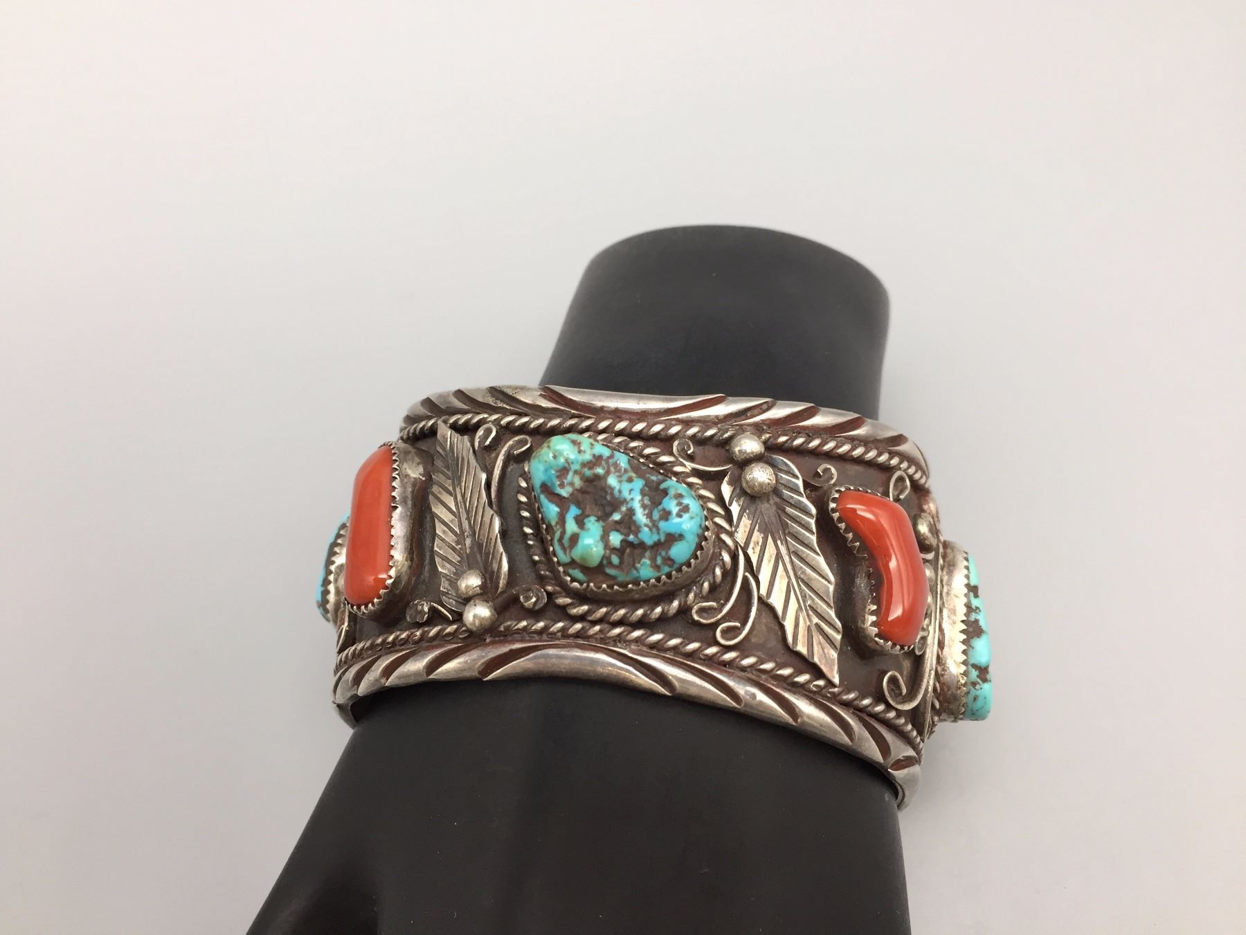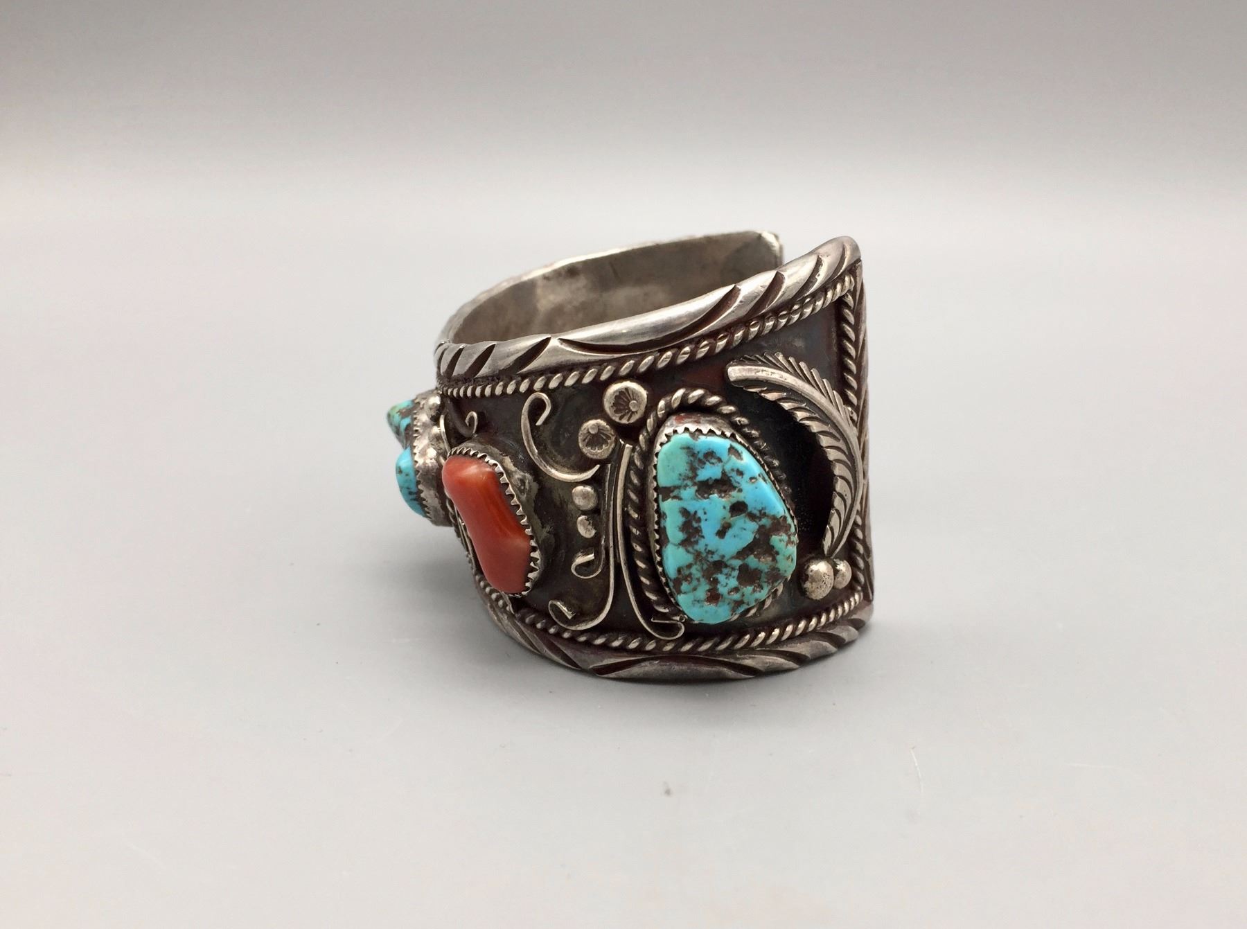 Description: 2 coral stones and 3 turquoise stones with lots of incredible and ornate detail work on a sterling silver bracelet. Maker: Unknown. Approx. Age: Circa 1970s. Size: Inside circumference measures approx. 6" with a 1 1/2” gap (making this bracelet fit about a 7 1/2” wrist). It is 1 7/8” wide across the face and weighs 109.9 g. Condition: Good for its age, normal wear expected. Please look closely at the pictures - they are an important part of our description. Shipping: There will be a $5 handling / packaging fee for shipping this lot. The actual cost of postage will be added on top of that.