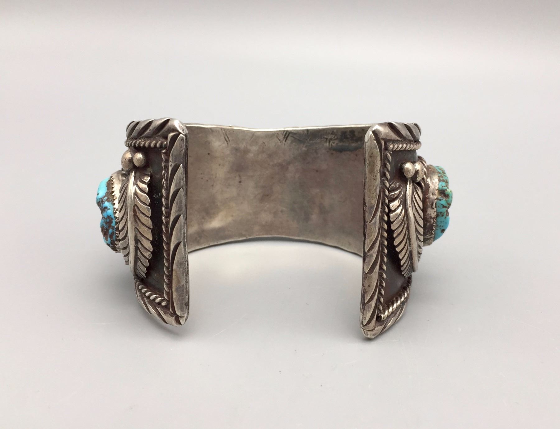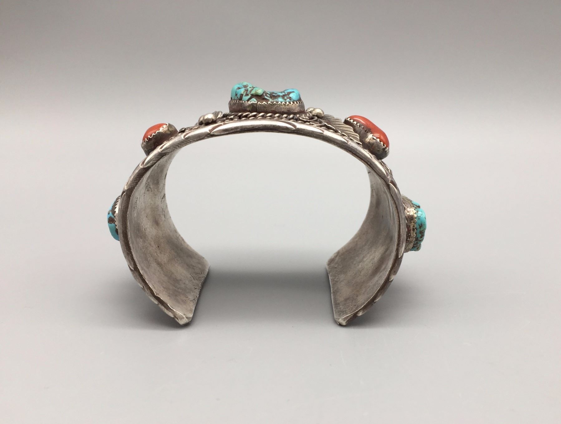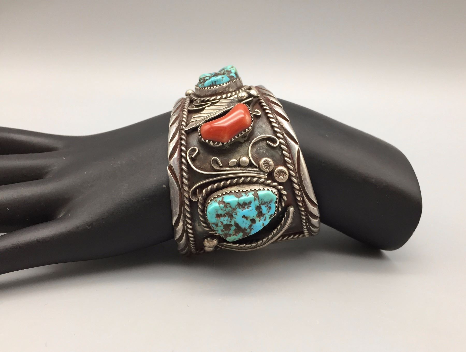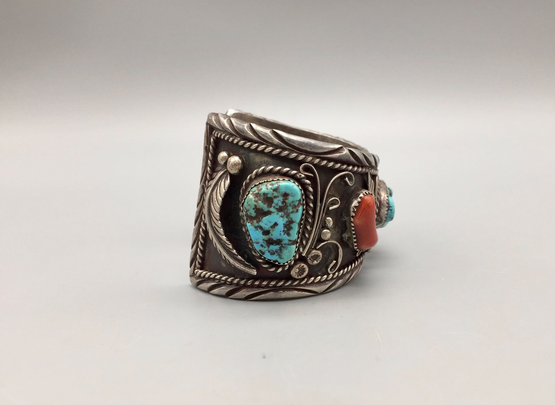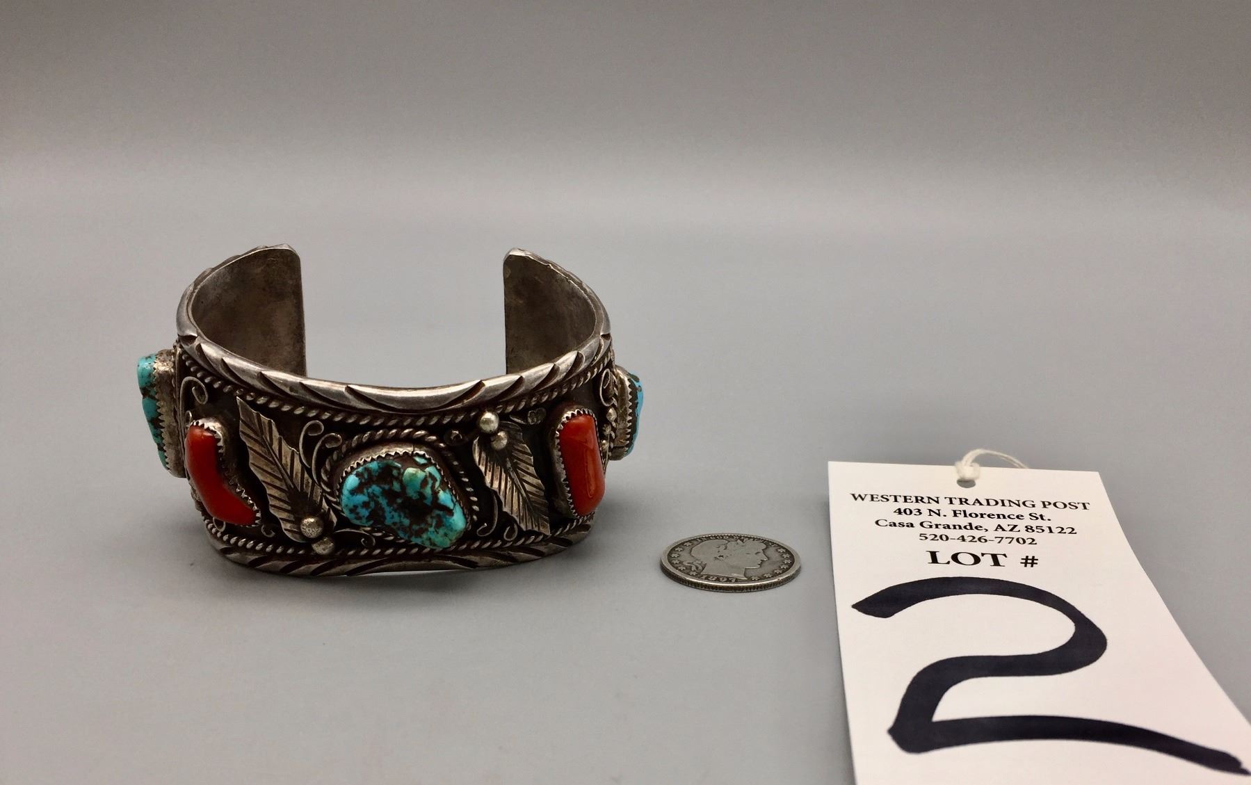 Description: 2 coral stones and 3 turquoise stones with lots of incredible and ornate detail work on a sterling silver bracelet. Maker: Unknown. Approx. Age: Circa 1970s. Size: Inside circumference measures approx. 6" with a 1 1/2” gap (making this bracelet fit about a 7 1/2” wrist). It is 1 7/8” wide across the face and weighs 109.9 g. Condition: Good for its age, normal wear expected. Please look closely at the pictures - they are an important part of our description. Shipping: There will be a $5 handling / packaging fee for shipping this lot. The actual cost of postage will be added on top of that.