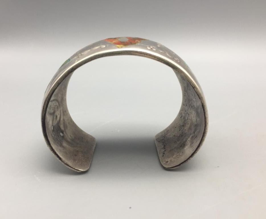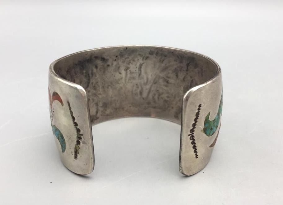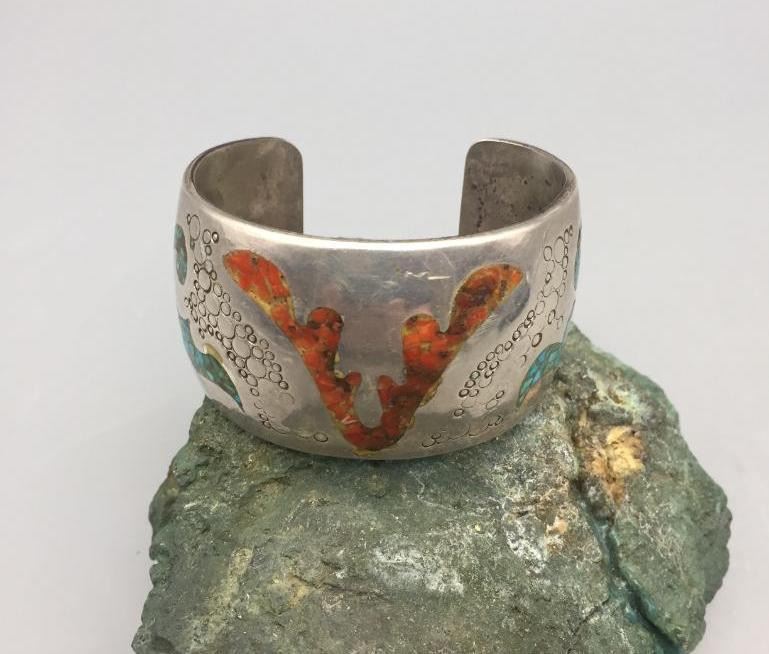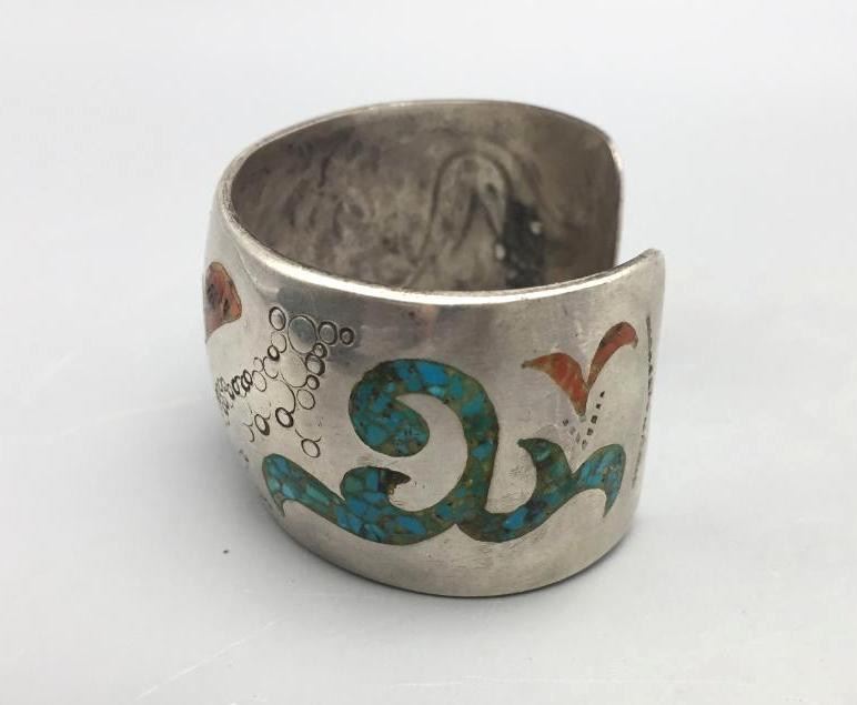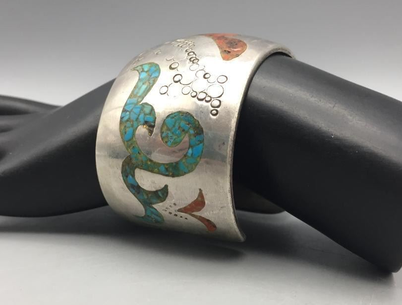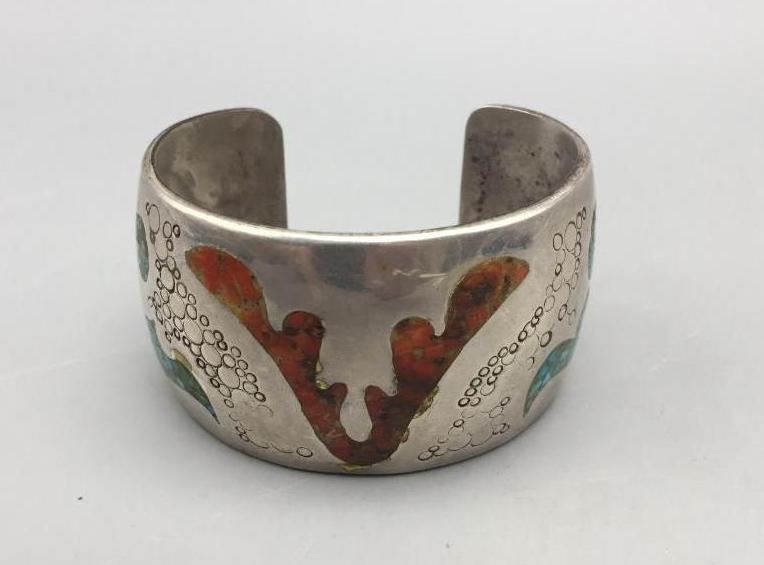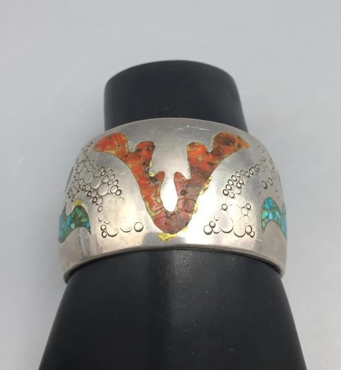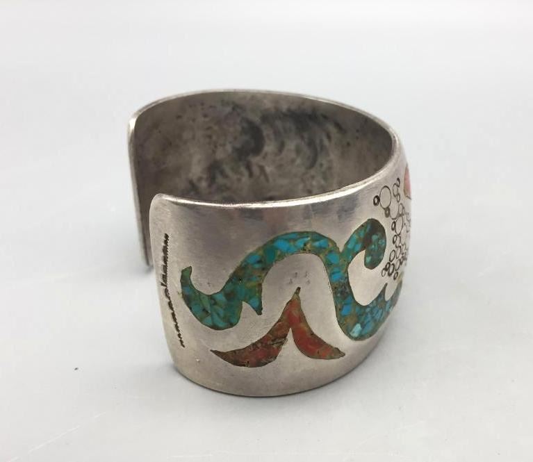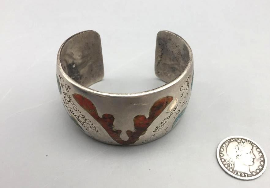 Description: Offered for sale in this lot is a vintage turquoise and coral chip inlay bracelet. It has a nice swirl like design, with simple stamp work. Maker: Unmarked. Approx. Age: Circa 1970s. Size: Inside circumference measures 6-1/8 inches long. Opening is an additional 1-1/4 inch, fitting a 7-3/8 inch wrist. Width is 1-1/2 inches. Weighs 88.6 grams. Condition: Good for its age, normal wear expected. Please look closely at the pictures - they are an important part of our description. Shipping: There will be a $5 handling / packaging fee for shipping this lot. The actual cost of postage will be added on top of that.